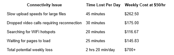 This is the hidden cost that digital nomads feel most acutely but rarely quantify. Every hour spent dealing with slow internet, dropped calls, failed uploads, or connectivity troubleshooting is an hour of billable work lost. For a freelancer charging $50 per hour, losing two hours of productivity per day to connectivity issues costs $100 in lost income daily.