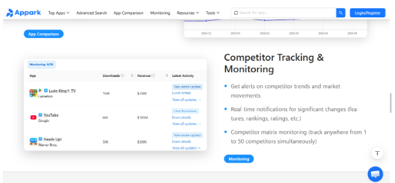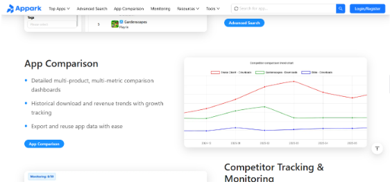 Appark is an enhanced mobile app revenue intelligence tool designed to assist users with an analysis of revenue trends, monitoring the most successful apps, and comprehending the financial potential of mobile products. The platform provides businesses with in-depth insights into the ways apps make money in various categories and regions.