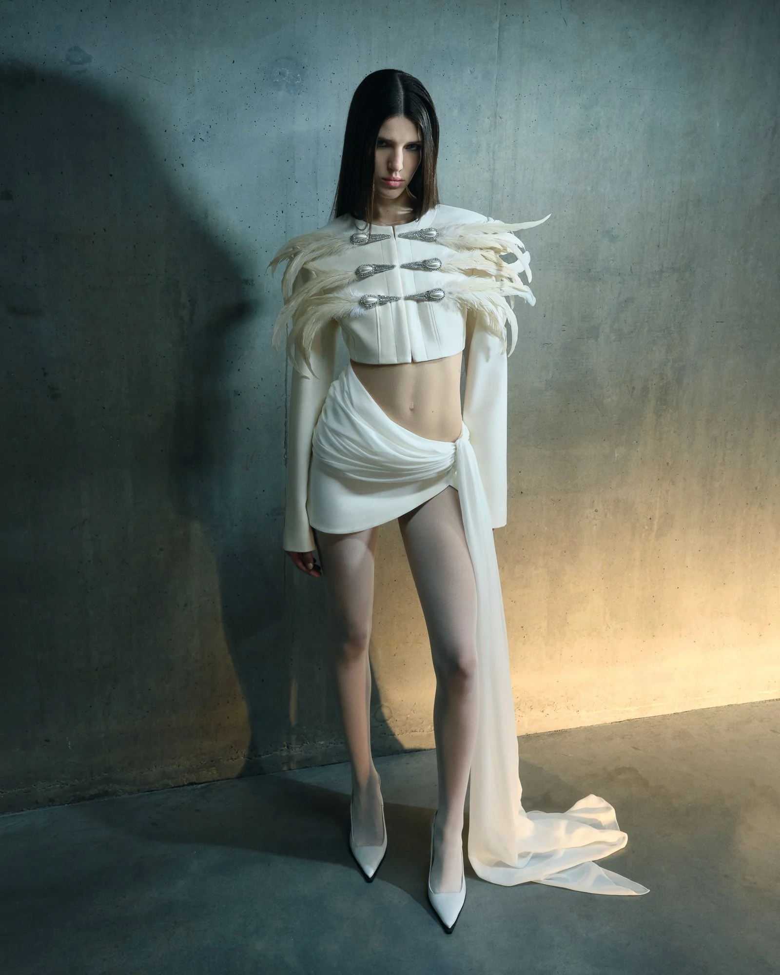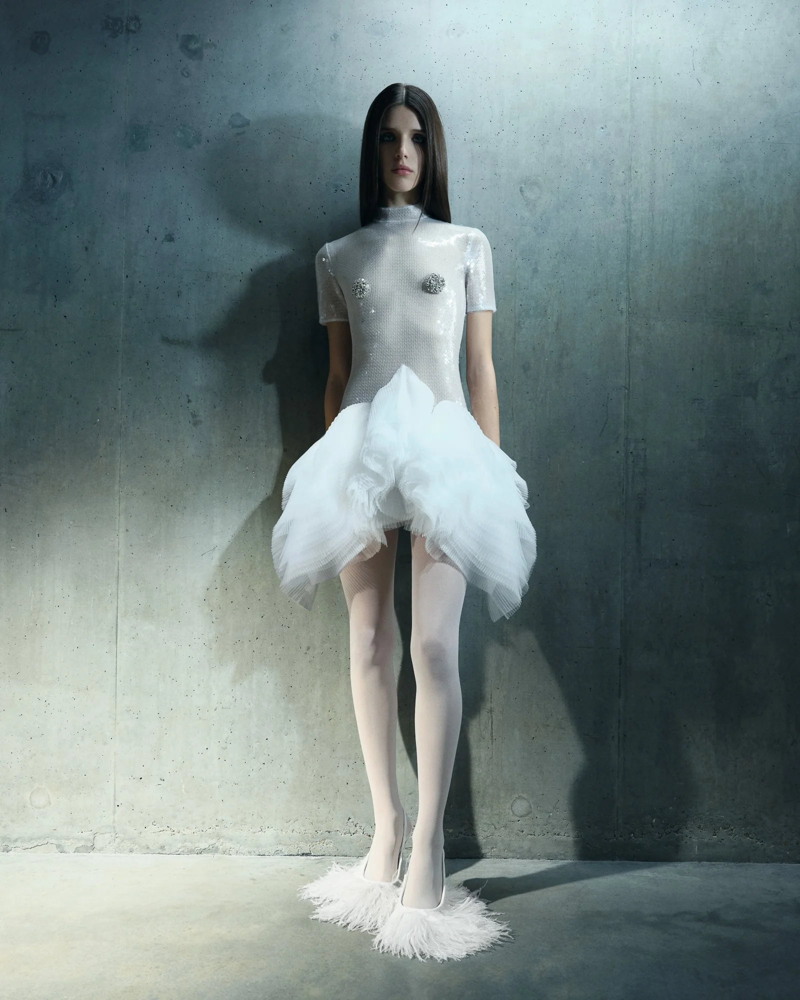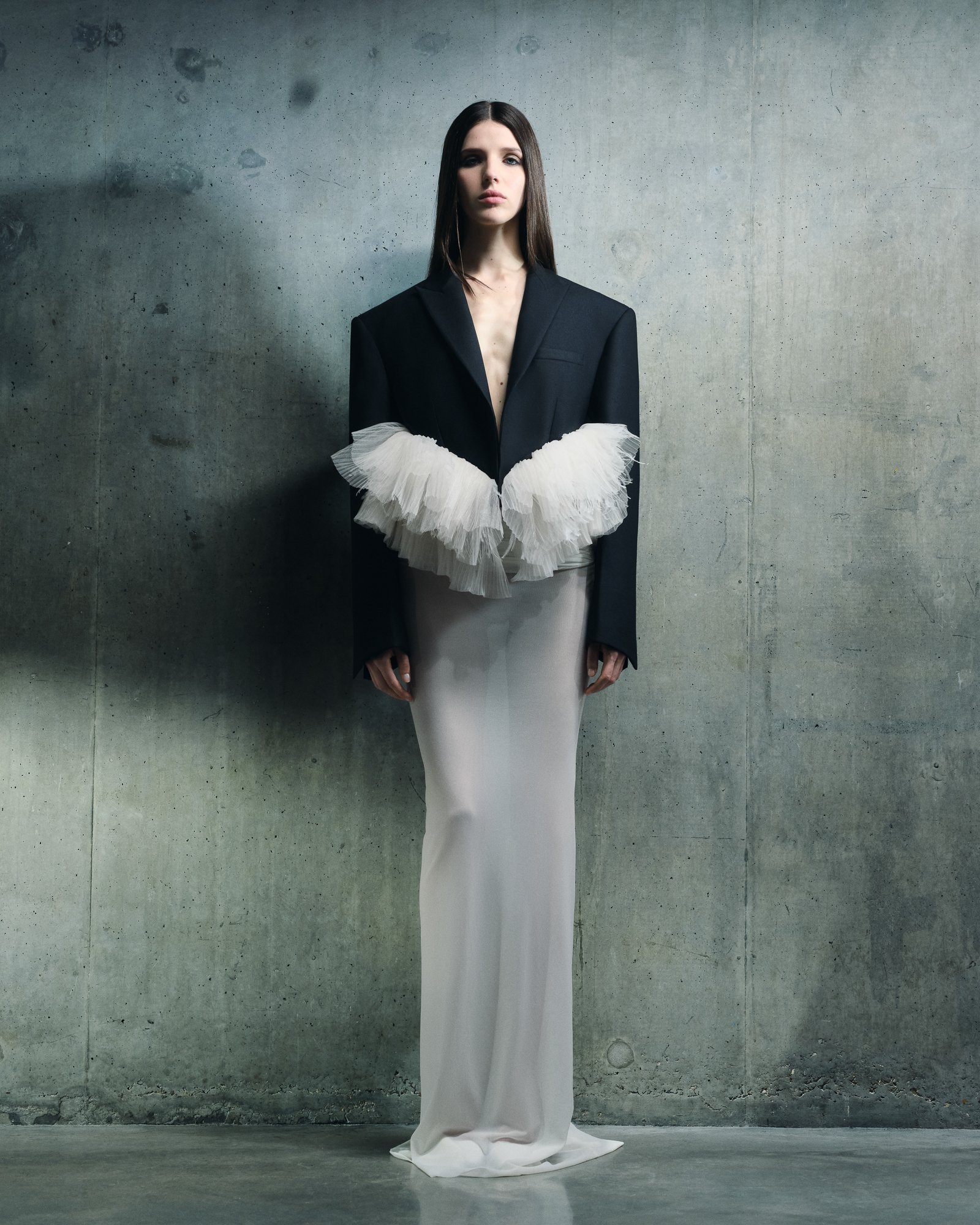 Silhouettes oscillate between fluidity and structure. Feather-pleated ruffles and sculptural tulle rise from the body like wings, framing shoulders and waists before cascading into floor-length hems. Elsewhere, elongated jackets, column skirts, razor-sharp trousers, and stark mini-dresses echo the vertical authority of urban architecture. The garments feel almost infrastructural—built rather than simply designed.
