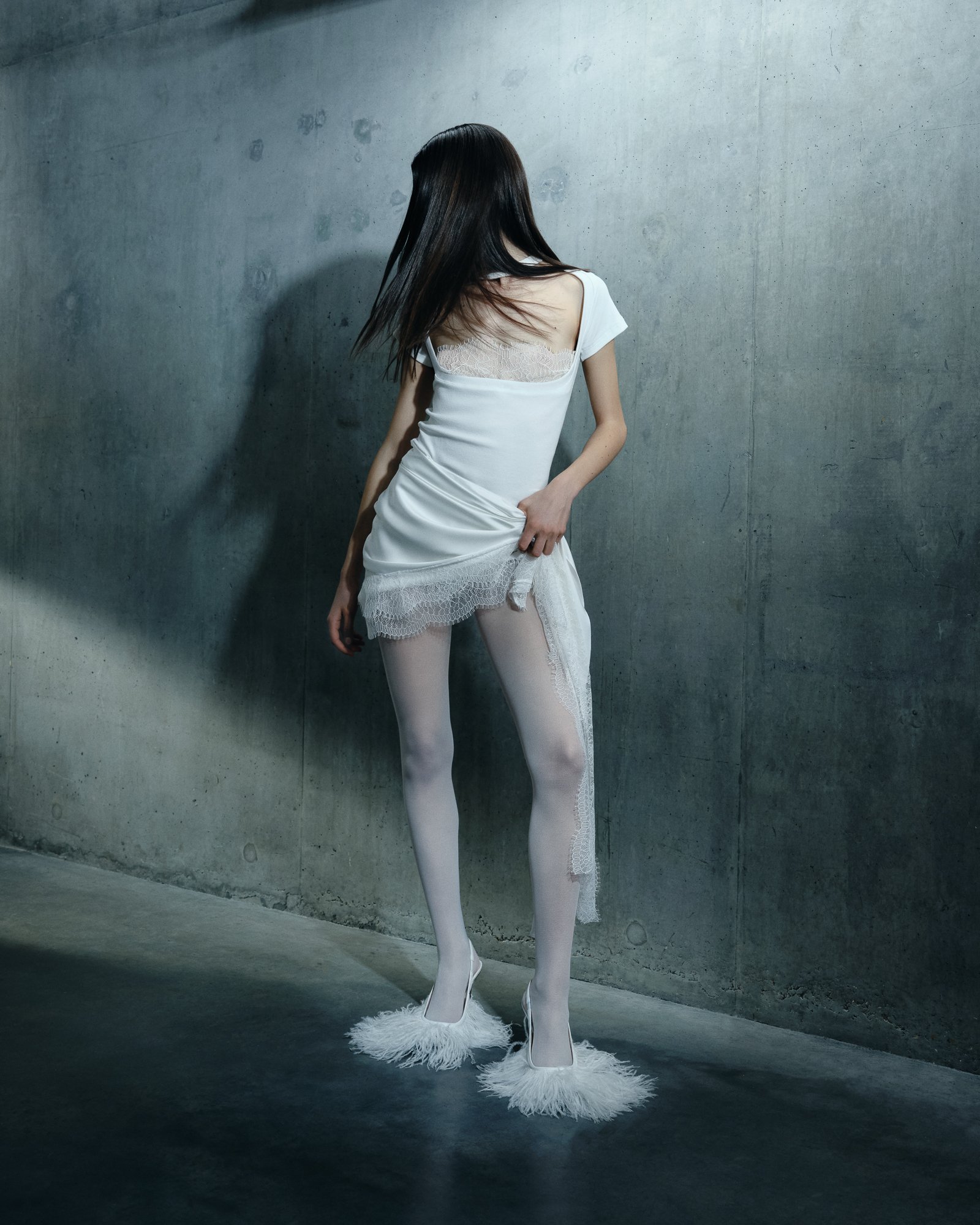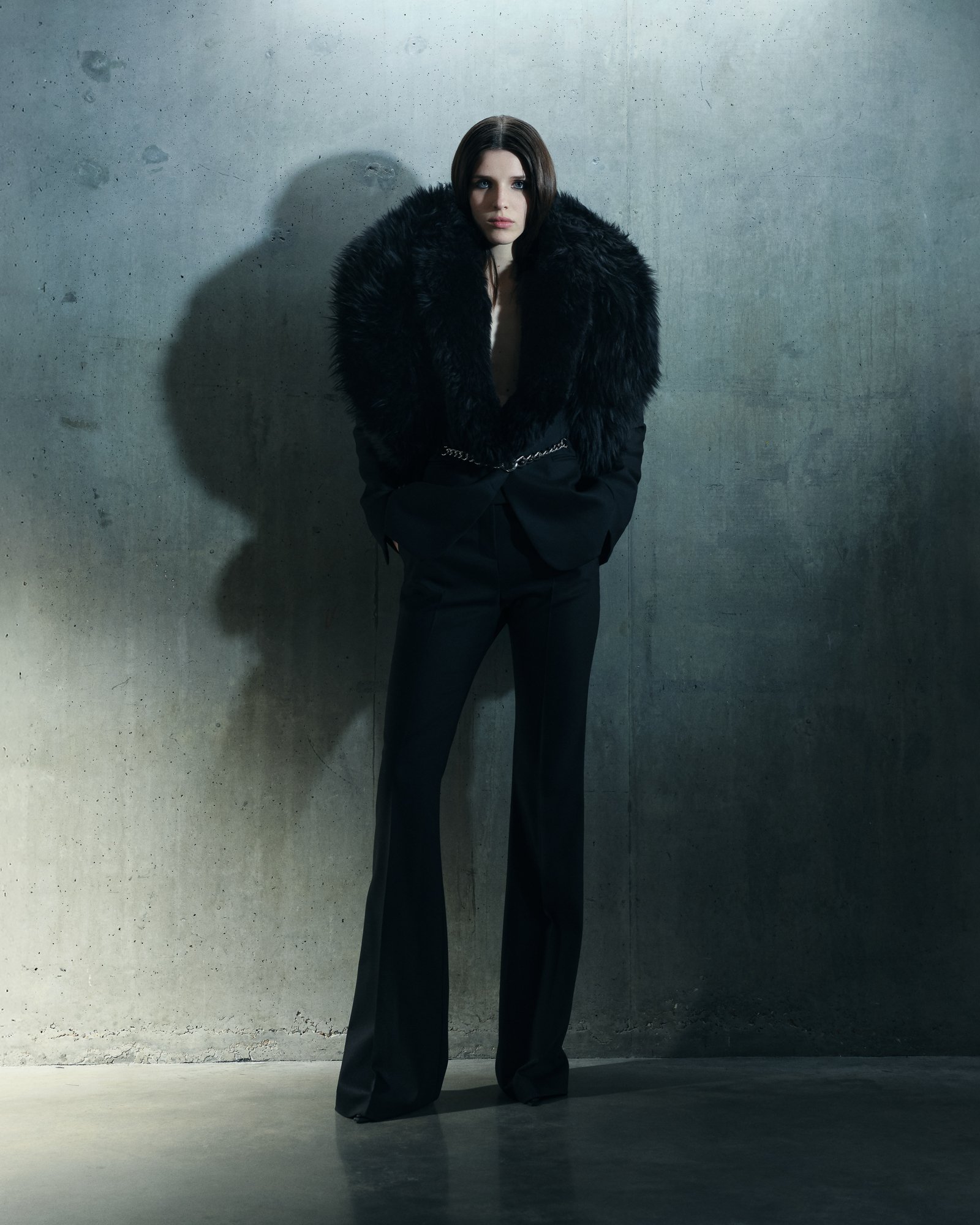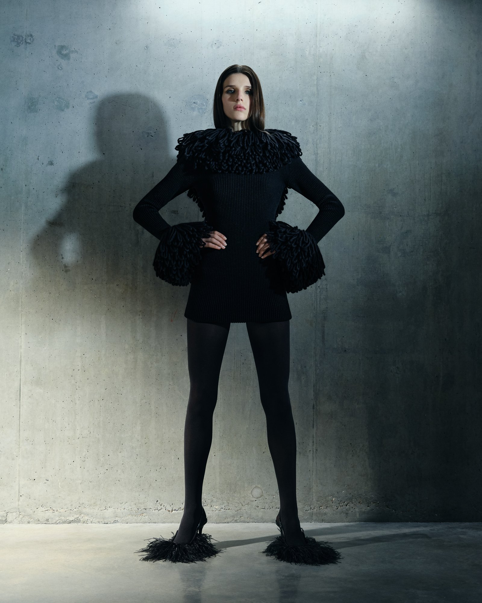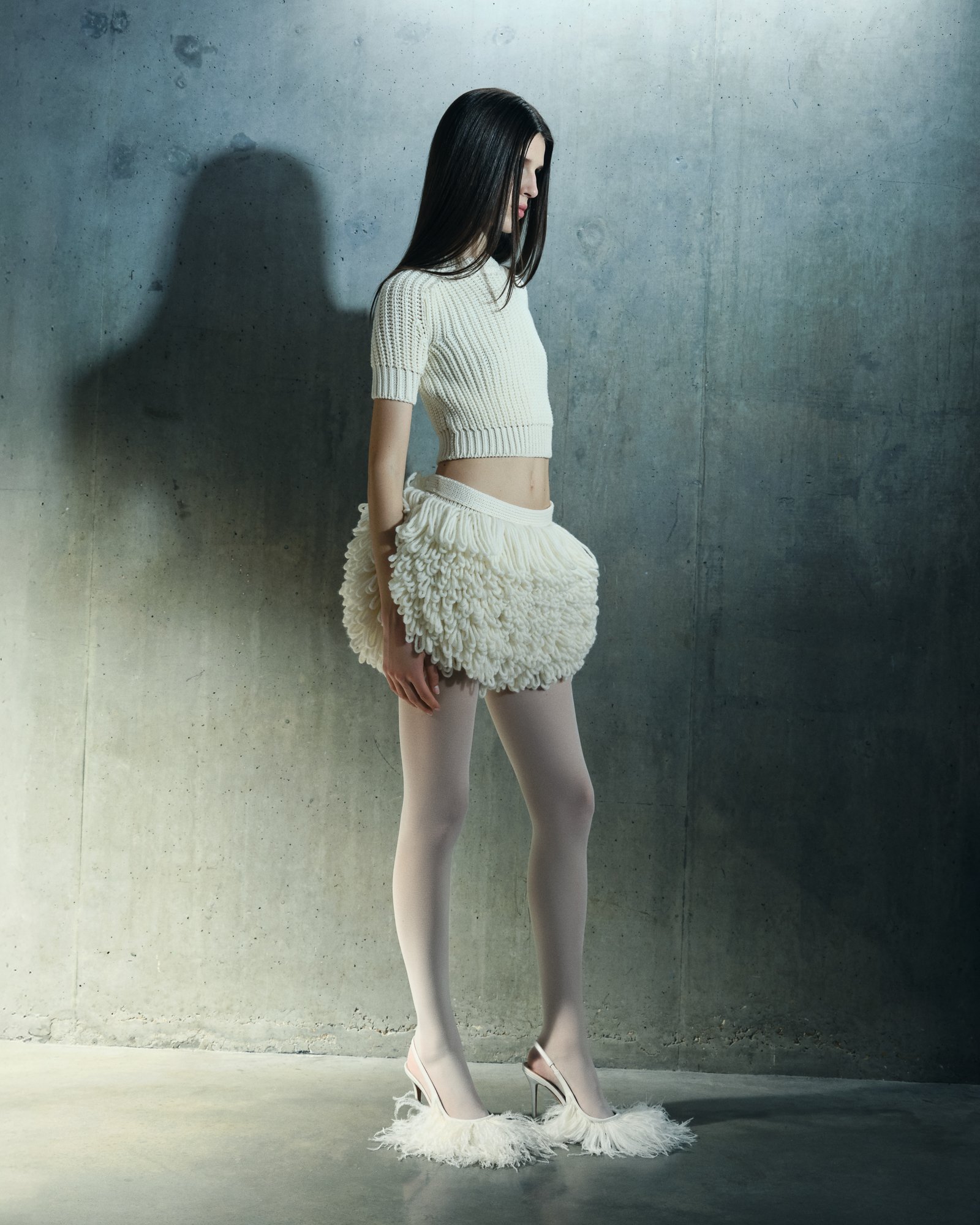 Despite the richness of materials, the palette remains intentionally restrained. Ecru and black dominate, establishing a stark dialogue between light and shadow. Within this monochrome world, texture becomes the protagonist—feathers, lace, bouclé, and shearling revealing their complexity without distraction.