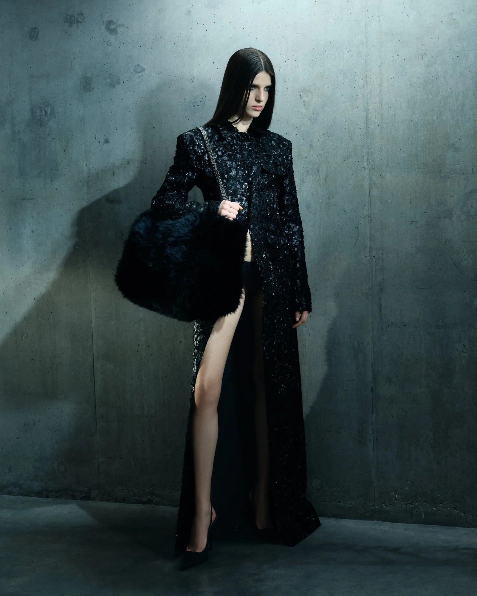 Material contrast becomes a key narrative device. Whisper-light lace, transparent sequins, silk, and ruched mesh introduce fragility and movement, while tailoring wool and matte sequin bouclé ground the collection in weight and form. Speckled shearling appears in imposing coats and shawl collars, functioning as a kind of delicate armor. Mongolian wool expands outward into wing-like volumes before dissolving into lengths of chiffon that move with near weightless fluidity.