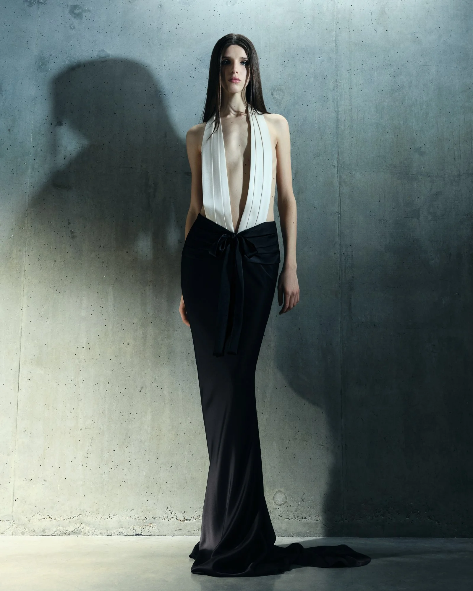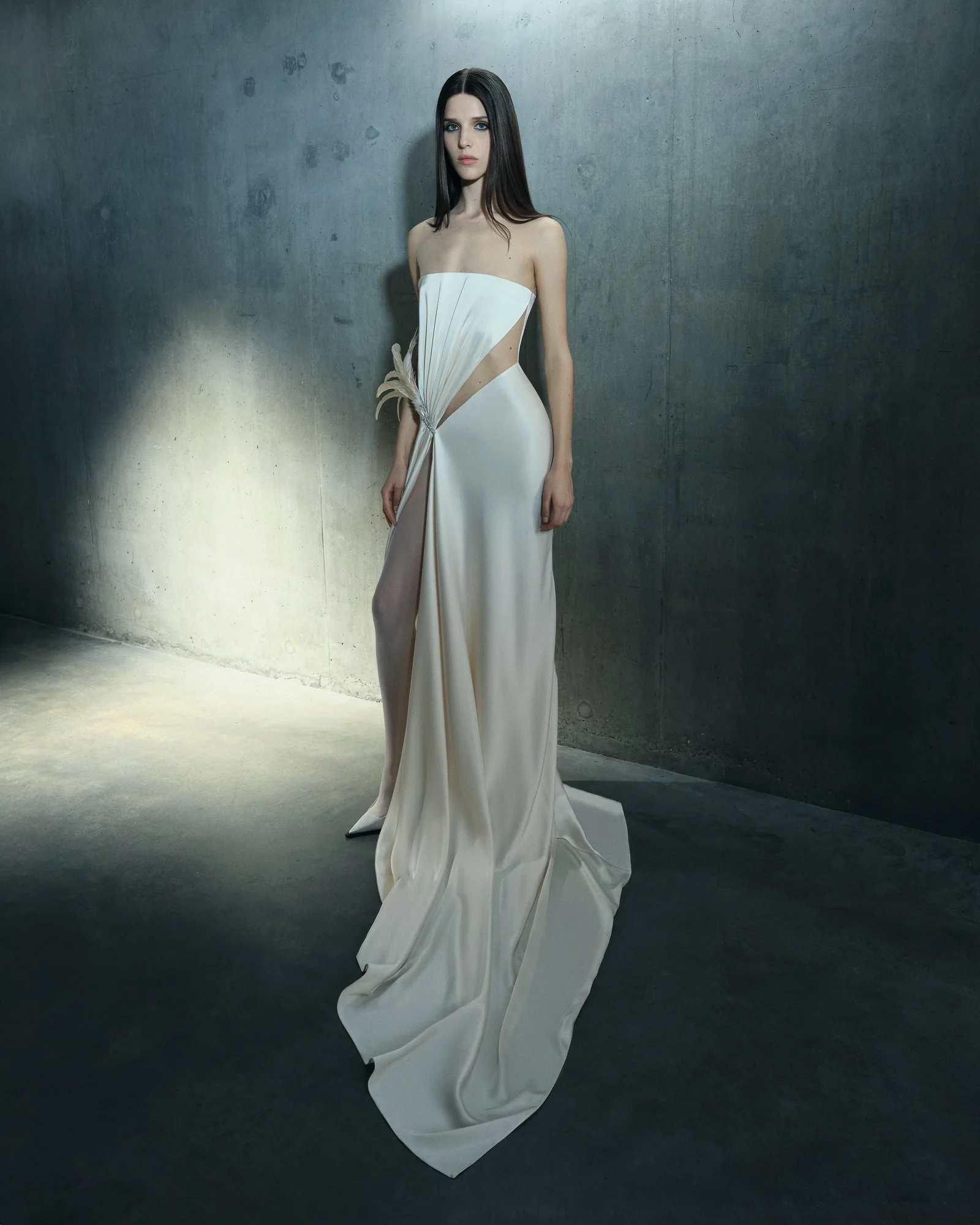 At its core, the collection explores sensuality through restraint. Rather than overt exposure, the body is revealed through controlled gestures—precisely sliced silhouettes, sculpted tailoring, and strategic flashes of skin. Intimacy becomes structural, embedded in the architecture of the garments themselves. Disciplined tailoring sits alongside eruptions of volume, creating moments where rigid lines soften into movement.