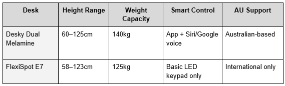 The FlexiSpot E7 is a capable mid-range desk, no question. But it caps at 123cm, ships without any app or voice control, and relies on an international support structure that Australian buyers have had documented issues navigating. For anyone over 190cm building a long-term home office setup, that combination adds up.