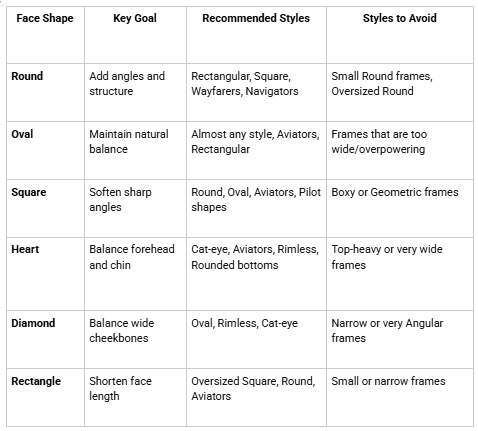 Quick Reference: Matching Sunglasses to Face Shape at a Glance