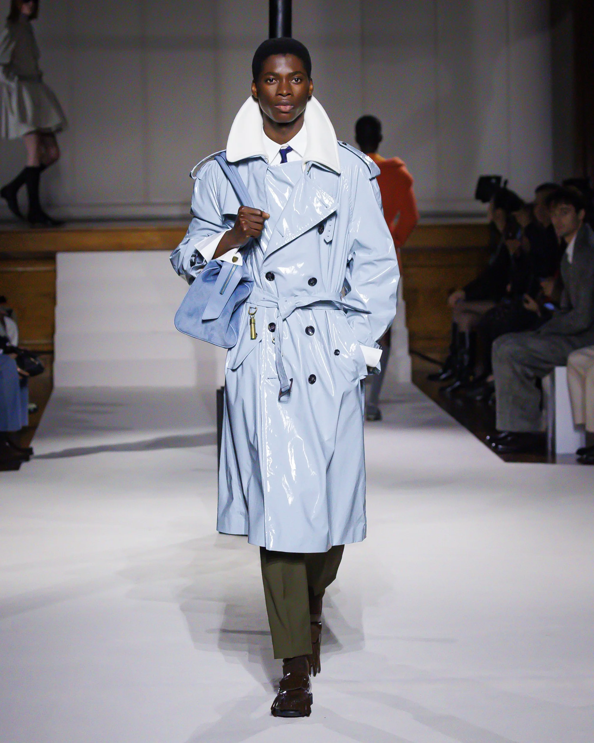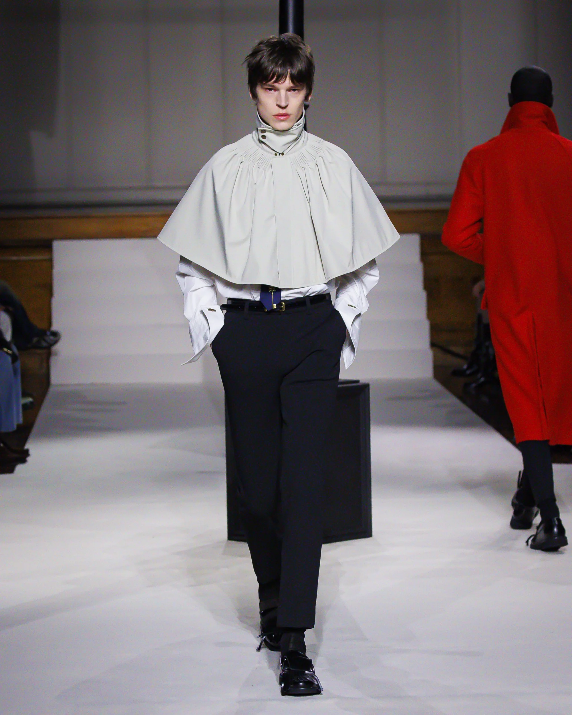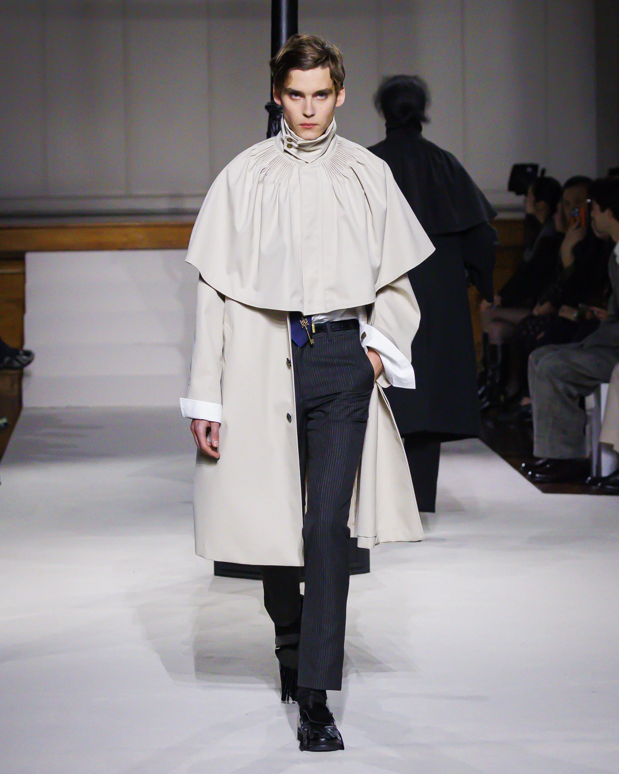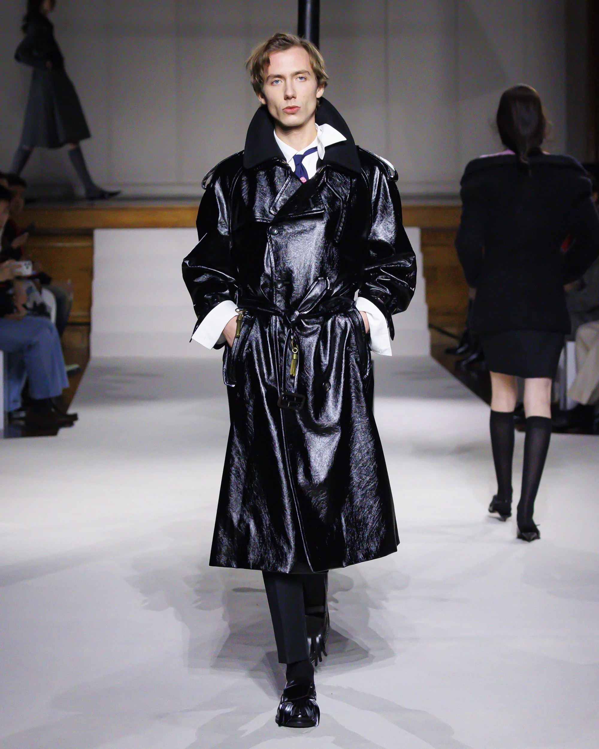 Silhouettes follow suit. Tailoring remains sharp, but never rigid—slim suits are offset by deconstructed knits and exaggerated volumes that feel almost insurgent against the codes they reference. The trench coat, perhaps the most enduring symbol of British outerwear, is reimagined with patent finishes and cape-like constructions, suggesting both armor and anonymity. It’s not about abandoning heritage—it’s about interrogating it.