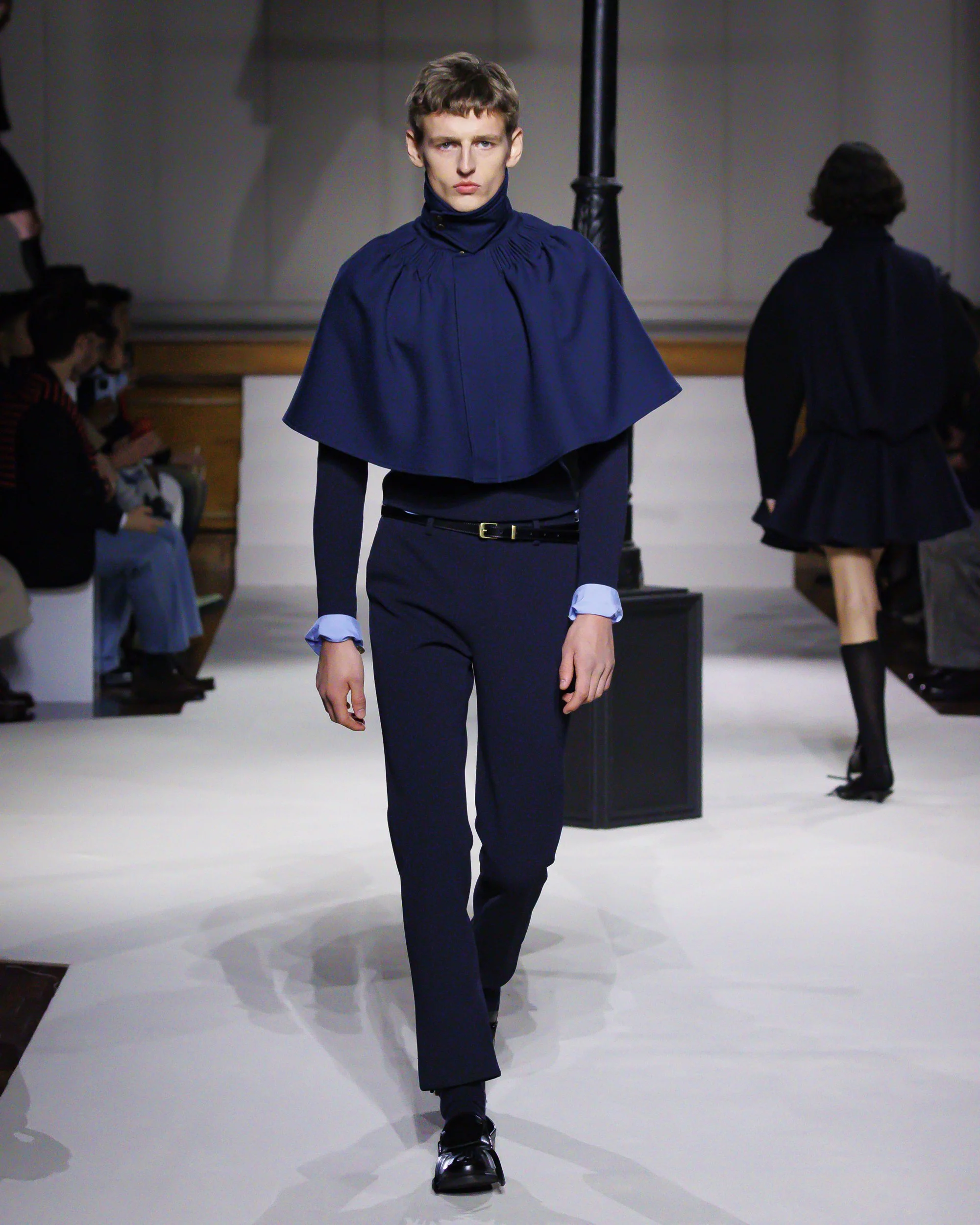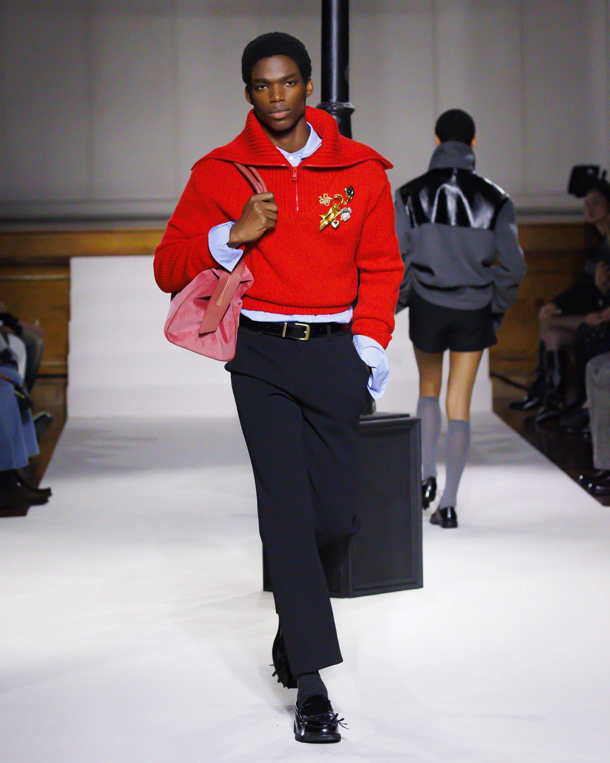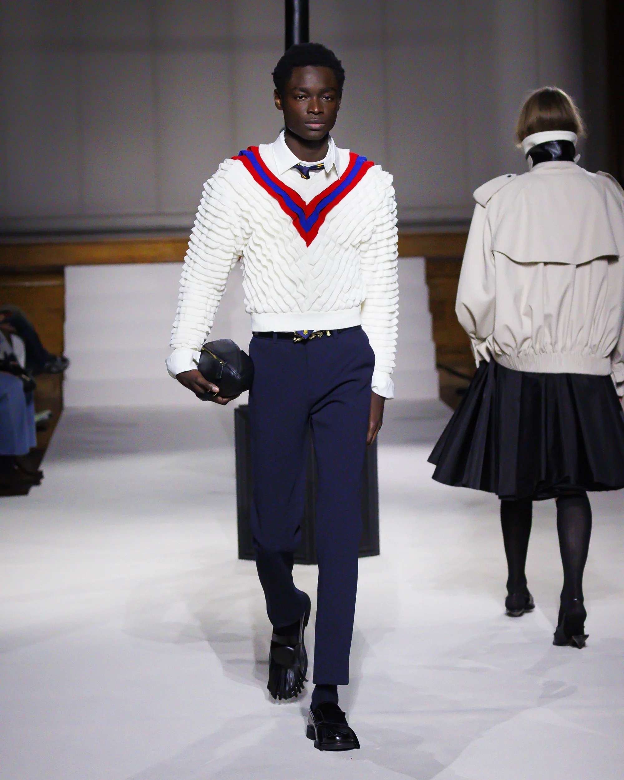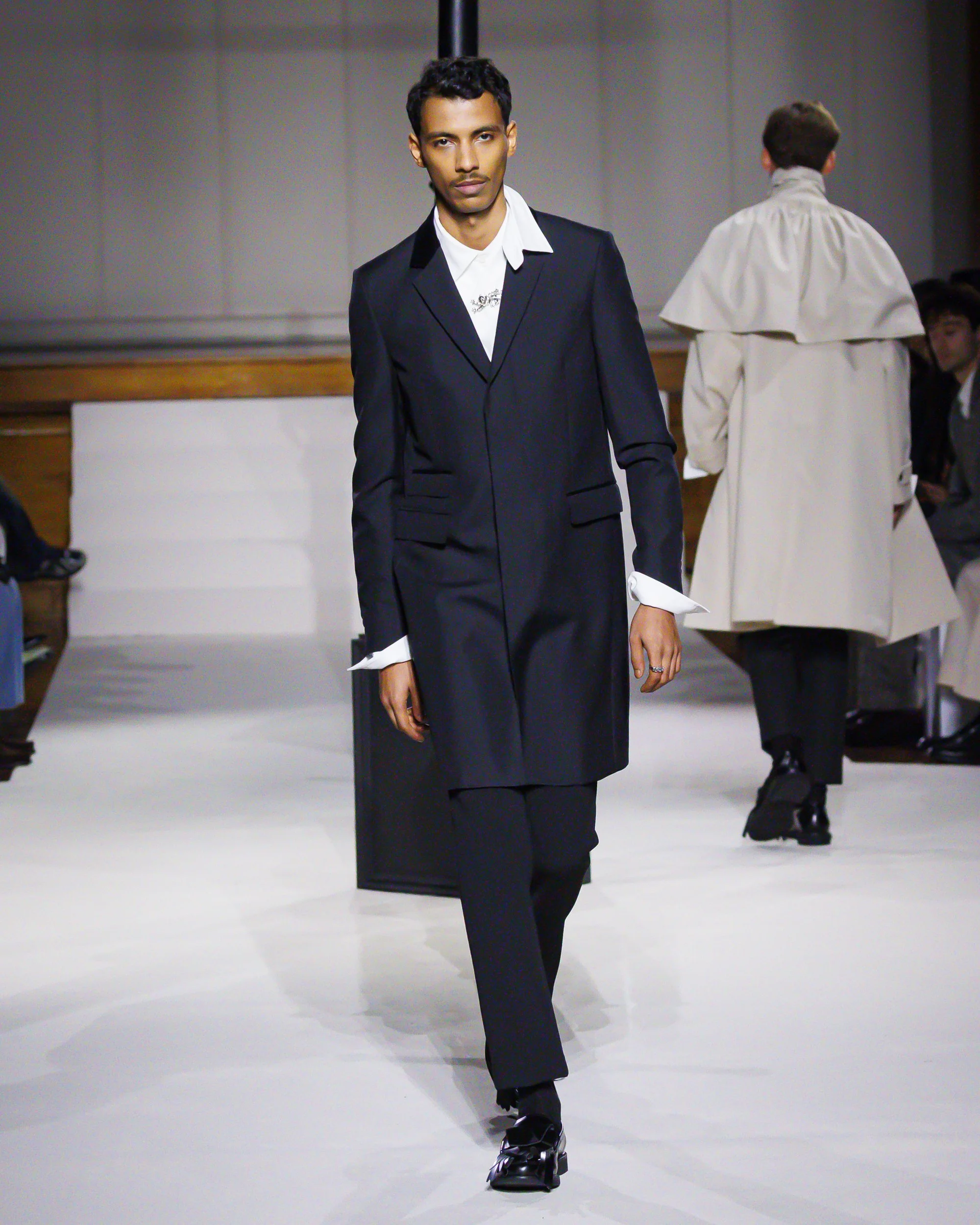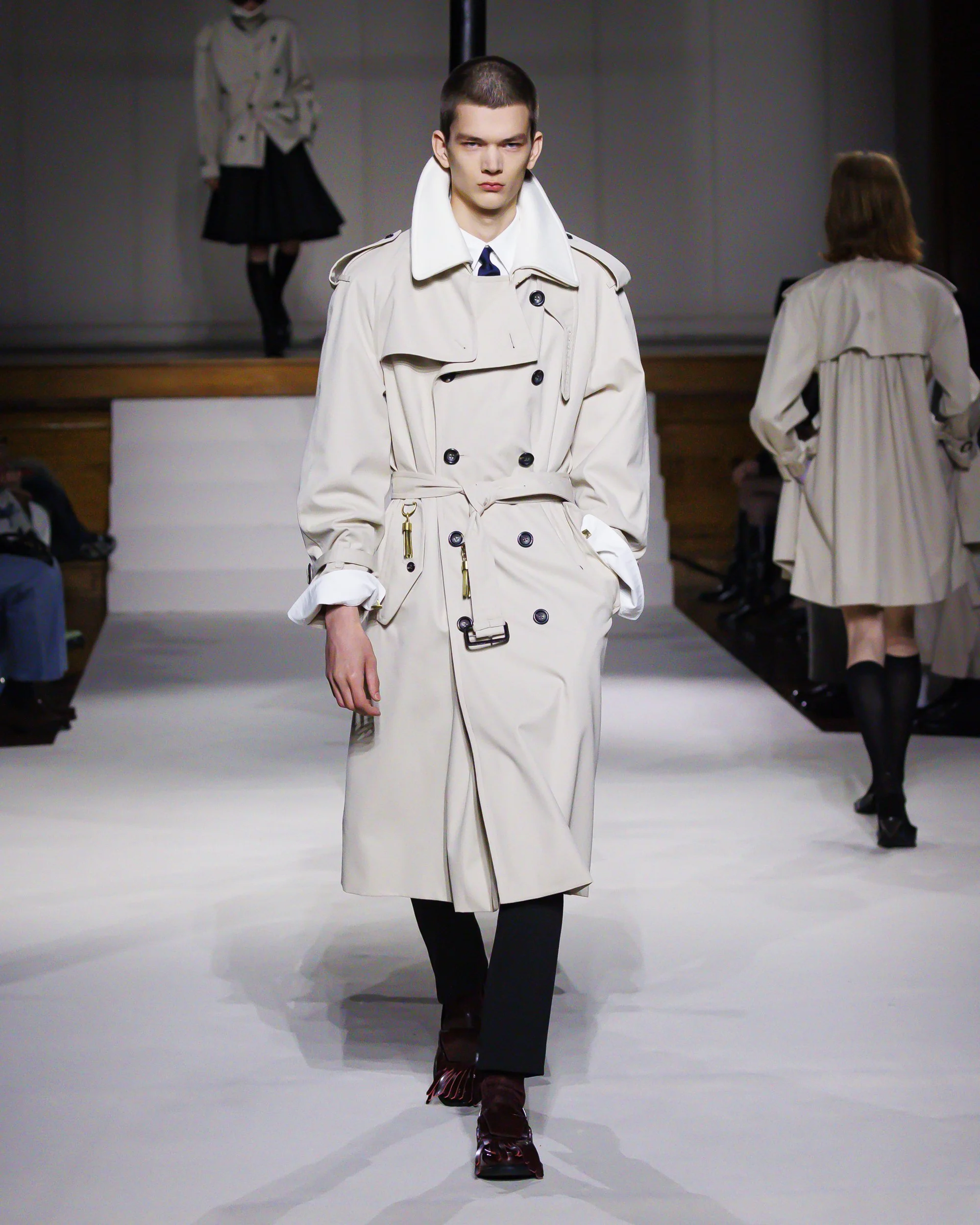 Silhouettes follow suit. Tailoring remains sharp, but never rigid—slim suits are offset by deconstructed knits and exaggerated volumes that feel almost insurgent against the codes they reference. The trench coat, perhaps the most enduring symbol of British outerwear, is reimagined with patent finishes and cape-like constructions, suggesting both armor and anonymity. It’s not about abandoning heritage—it’s about interrogating it.