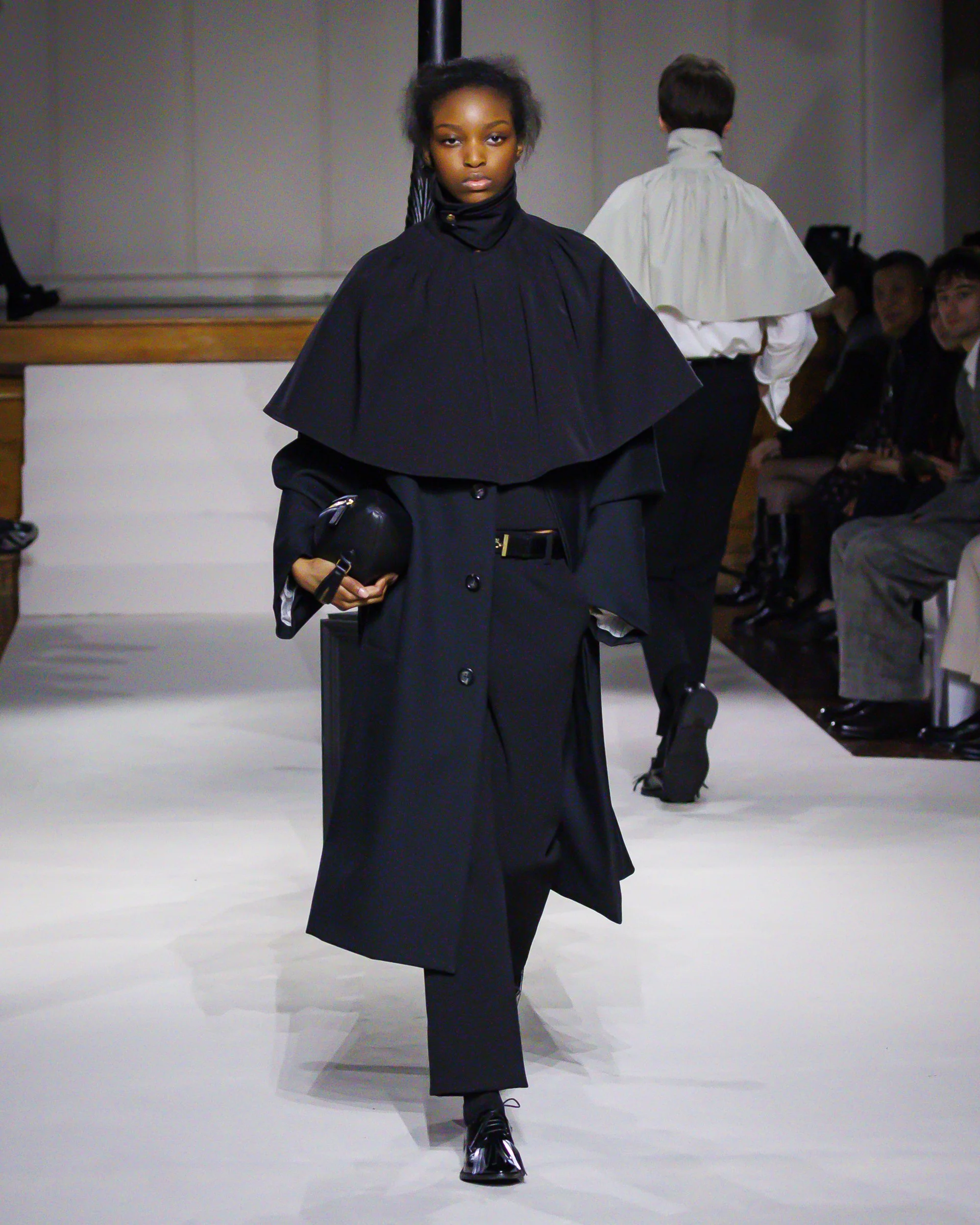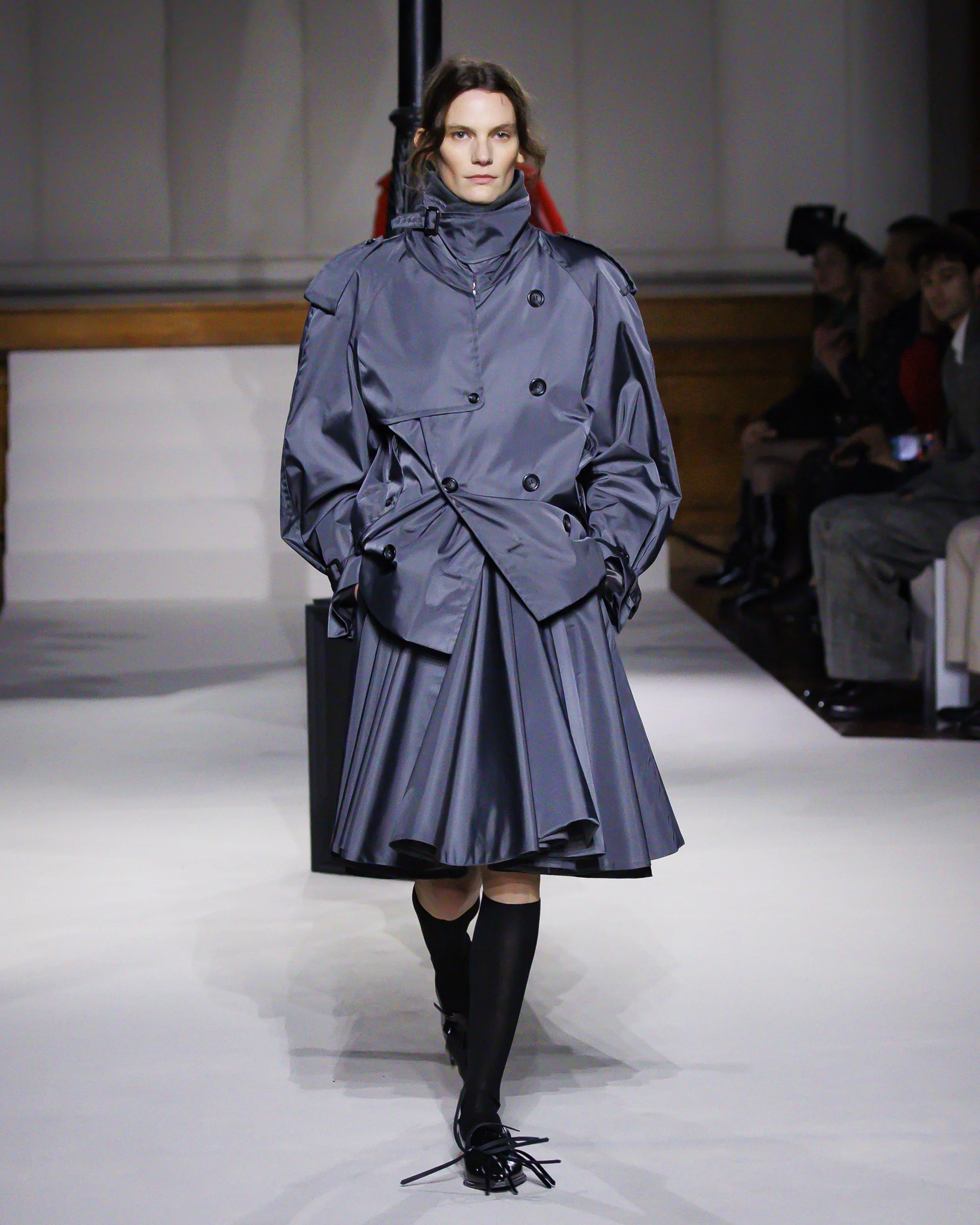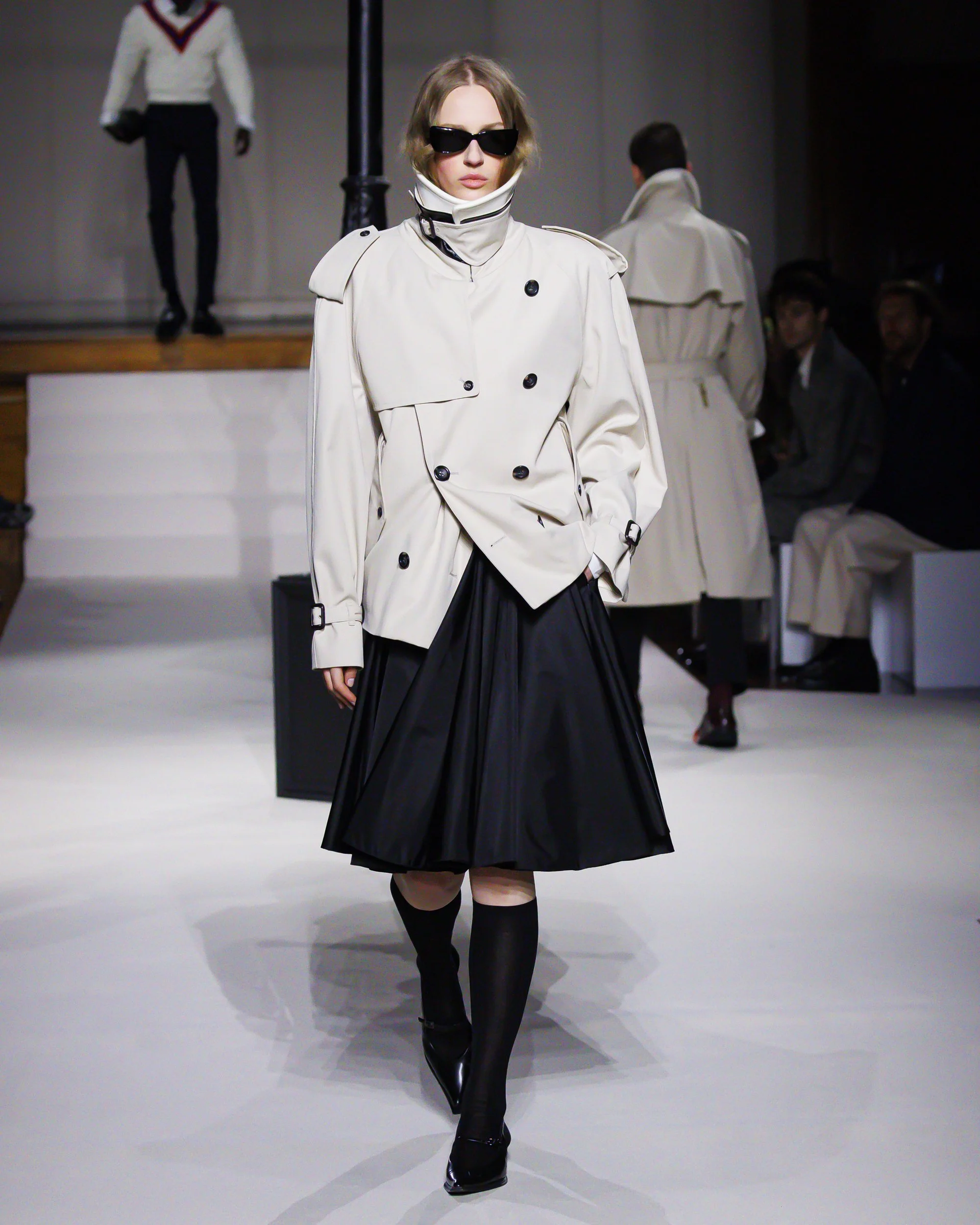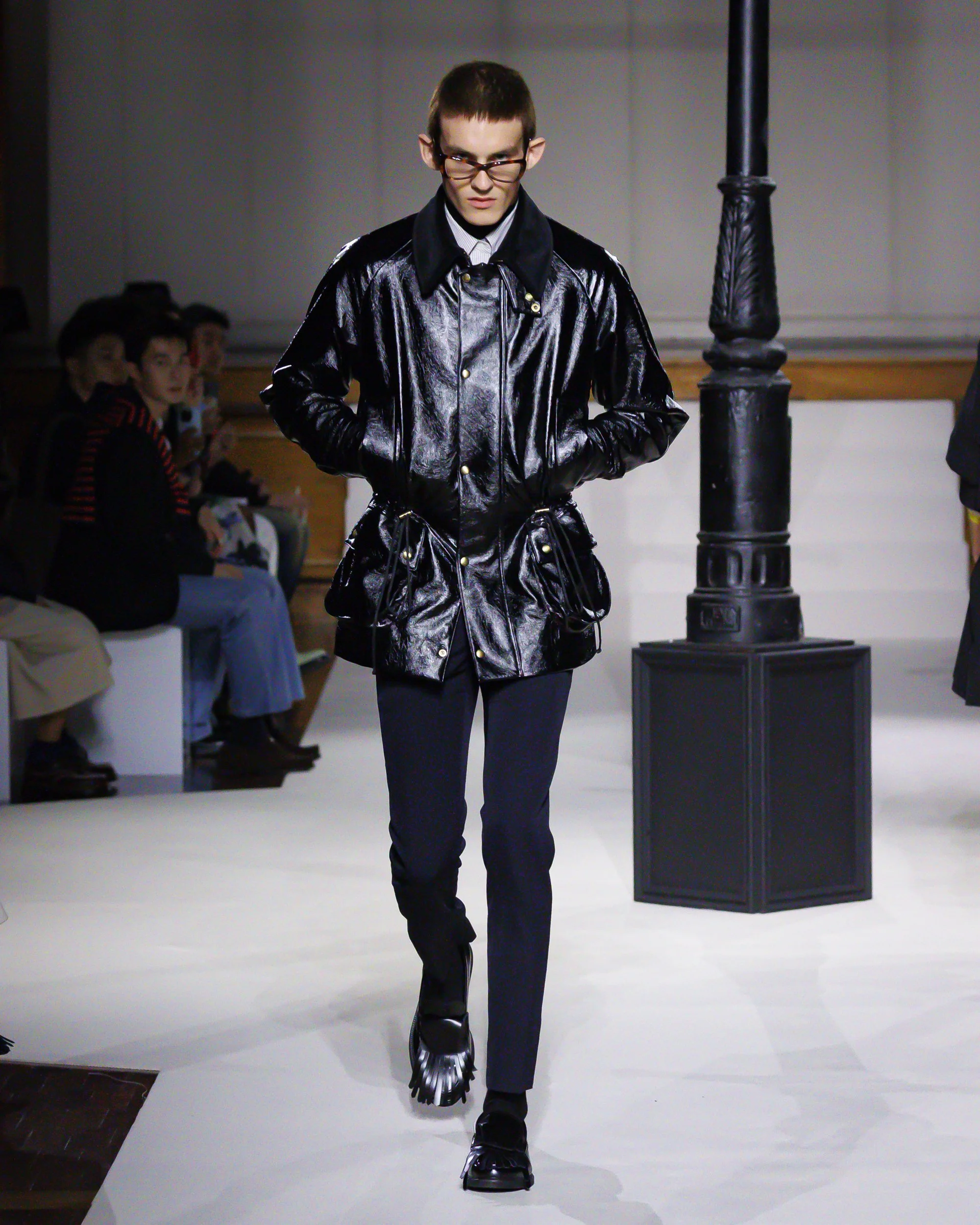 Silhouettes follow suit. Tailoring remains sharp, but never rigid—slim suits are offset by deconstructed knits and exaggerated volumes that feel almost insurgent against the codes they reference. The trench coat, perhaps the most enduring symbol of British outerwear, is reimagined with patent finishes and cape-like constructions, suggesting both armor and anonymity. It’s not about abandoning heritage—it’s about interrogating it.