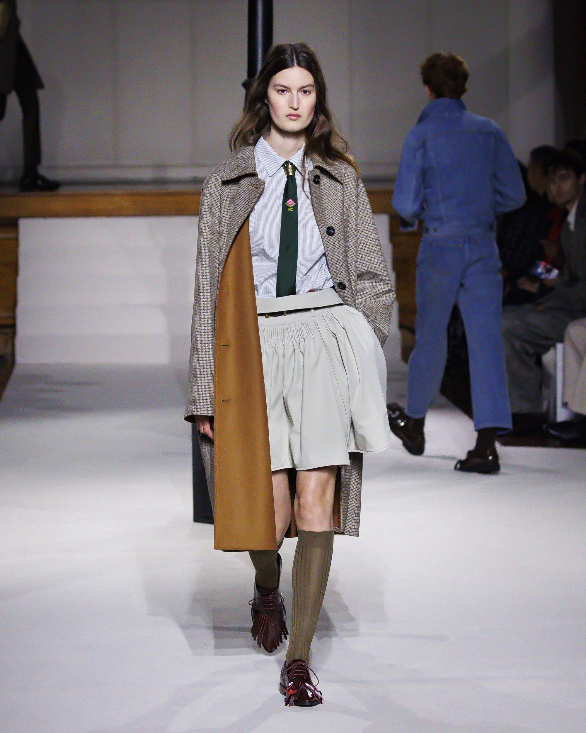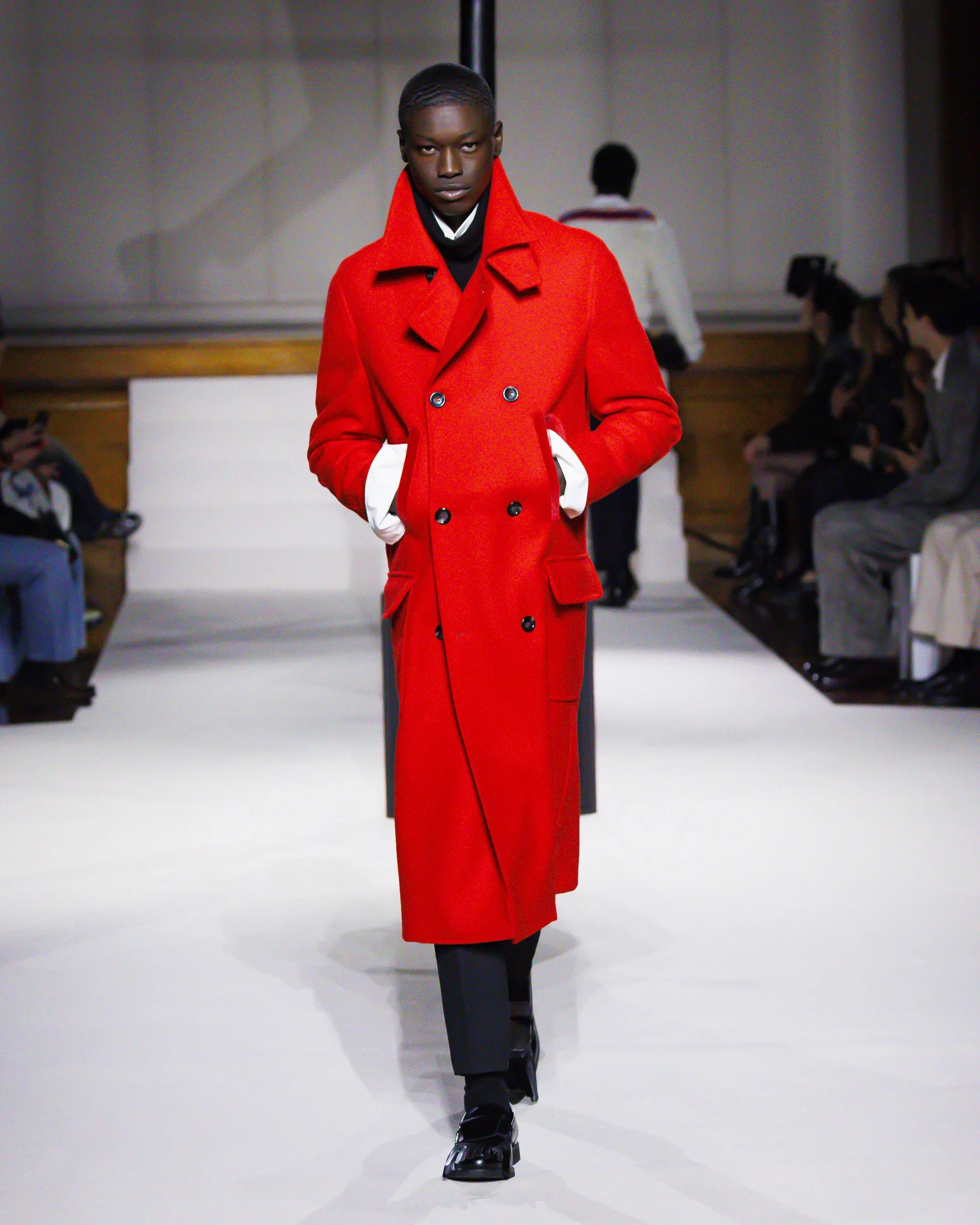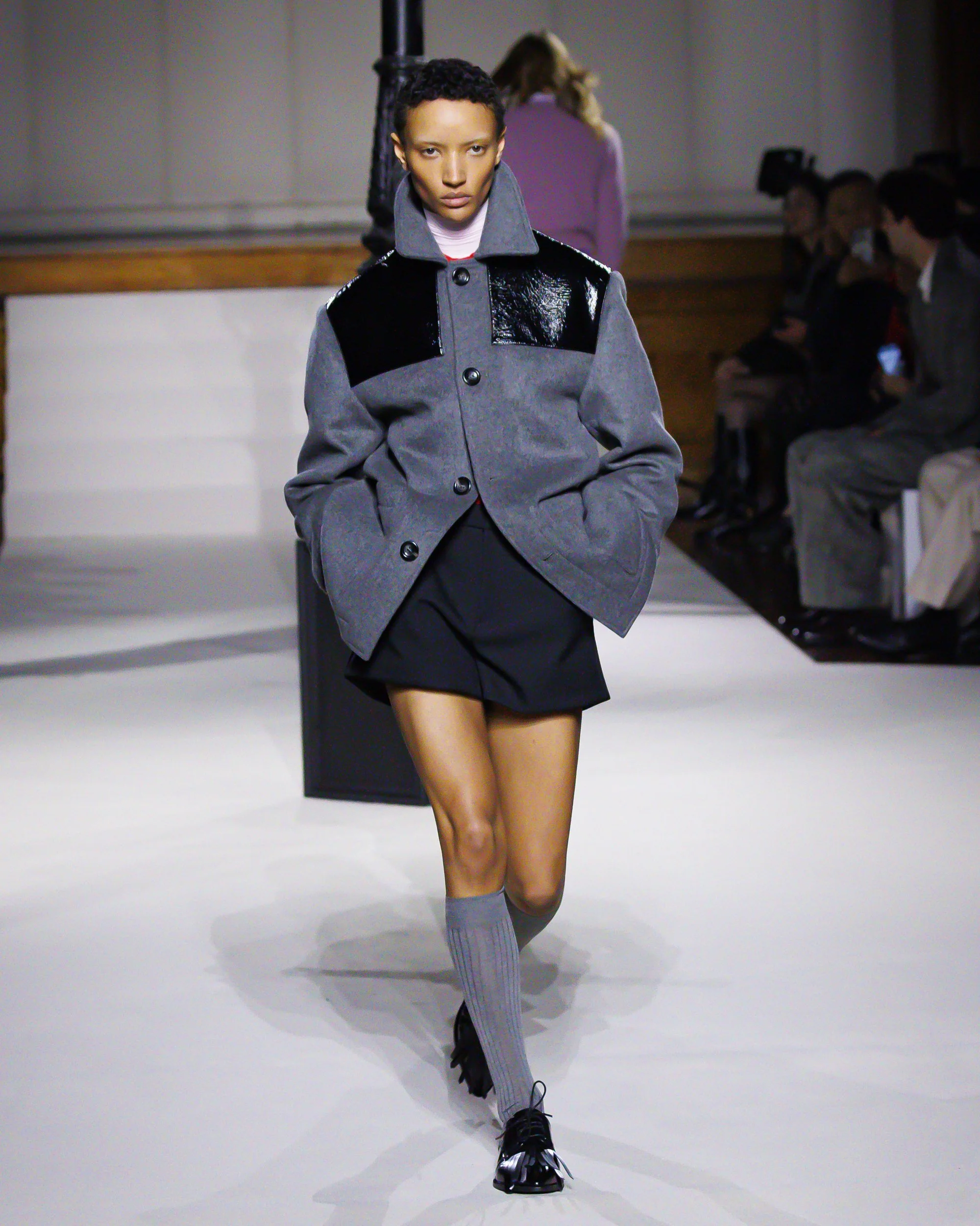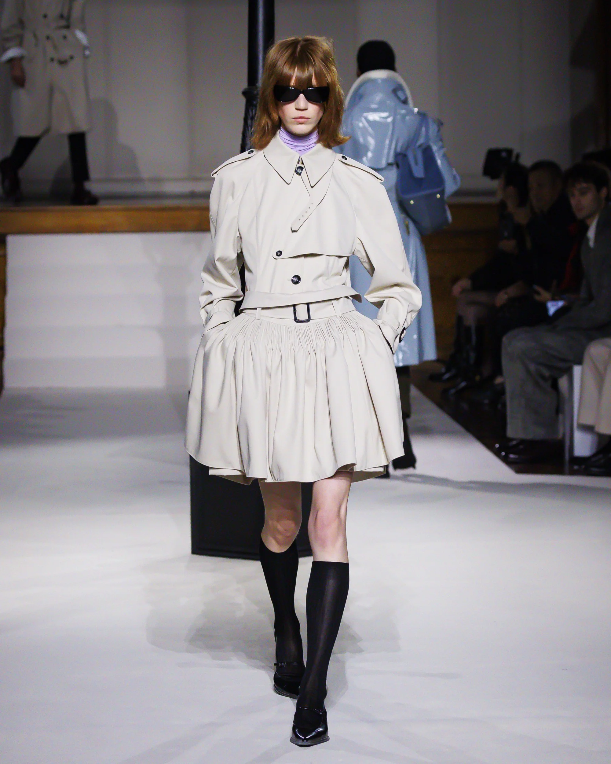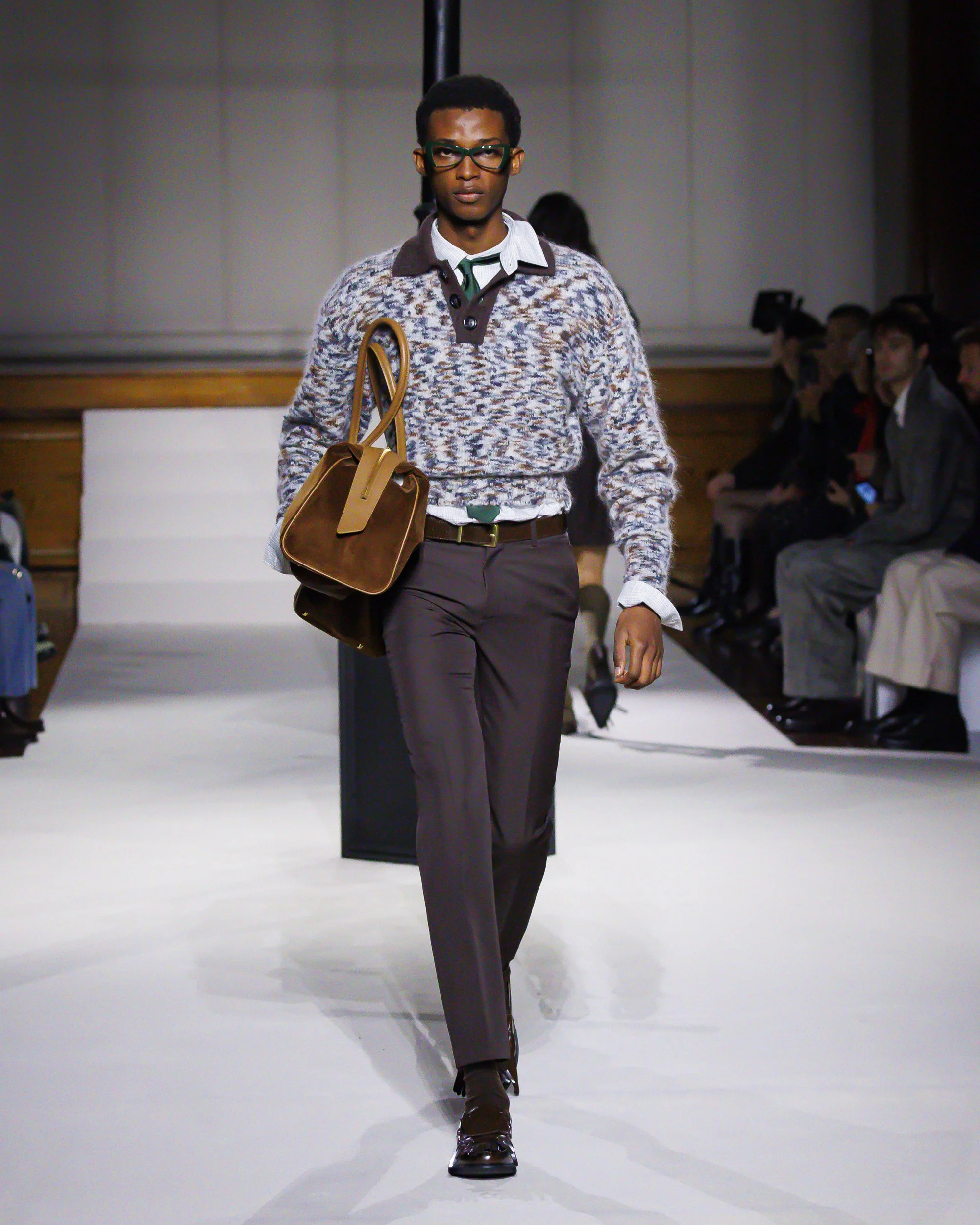 Silhouettes follow suit. Tailoring remains sharp, but never rigid—slim suits are offset by deconstructed knits and exaggerated volumes that feel almost insurgent against the codes they reference. The trench coat, perhaps the most enduring symbol of British outerwear, is reimagined with patent finishes and cape-like constructions, suggesting both armor and anonymity. It’s not about abandoning heritage—it’s about interrogating it.