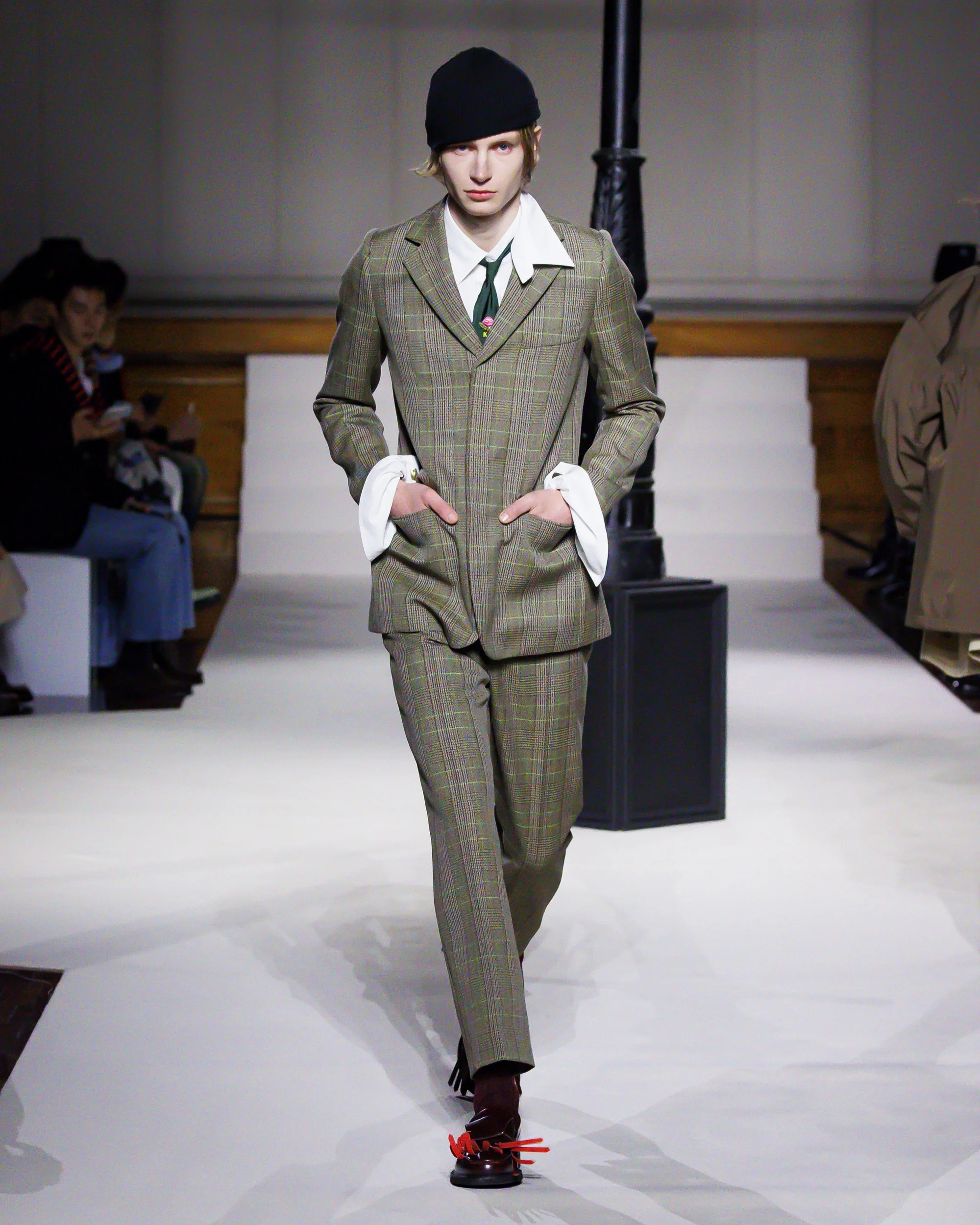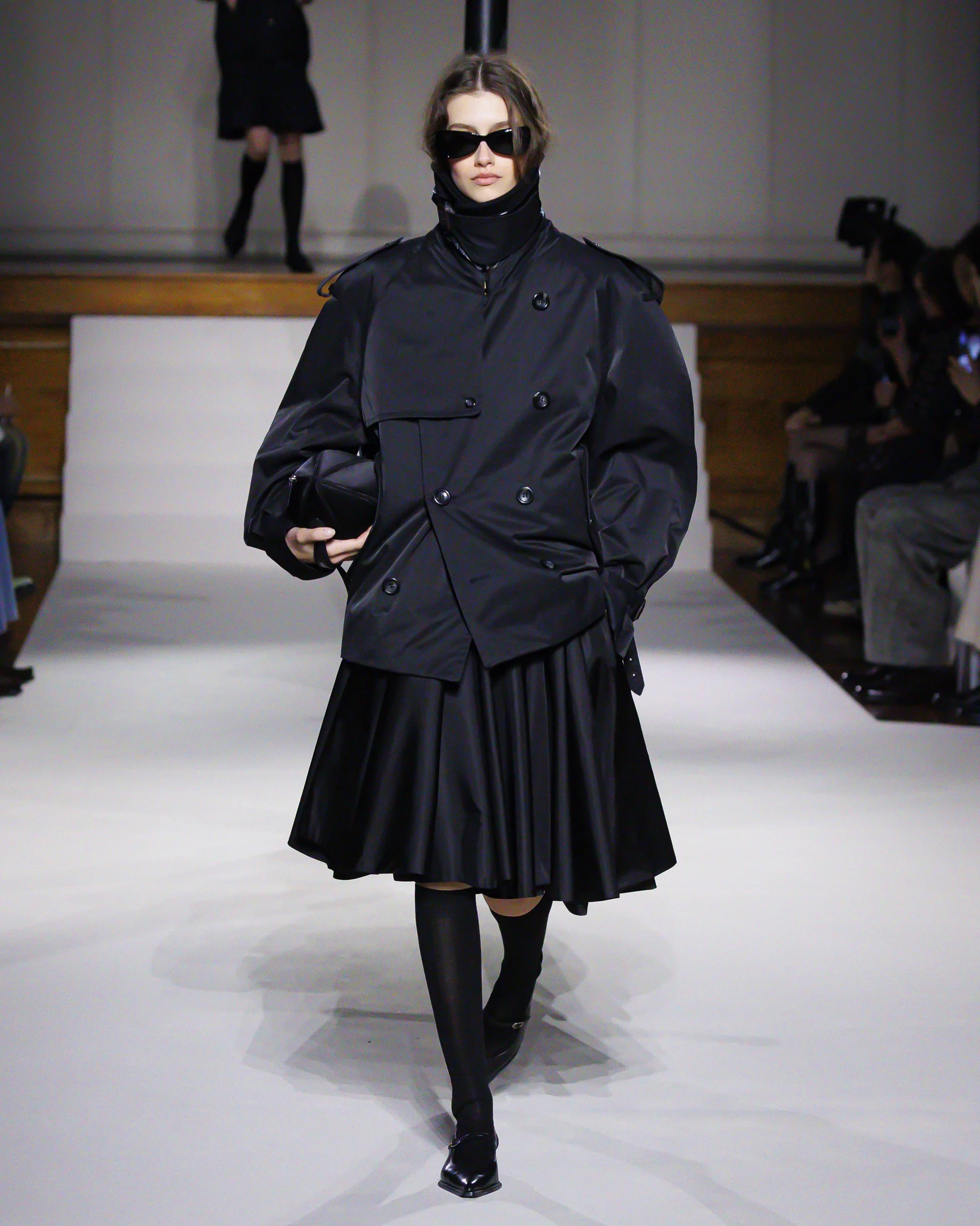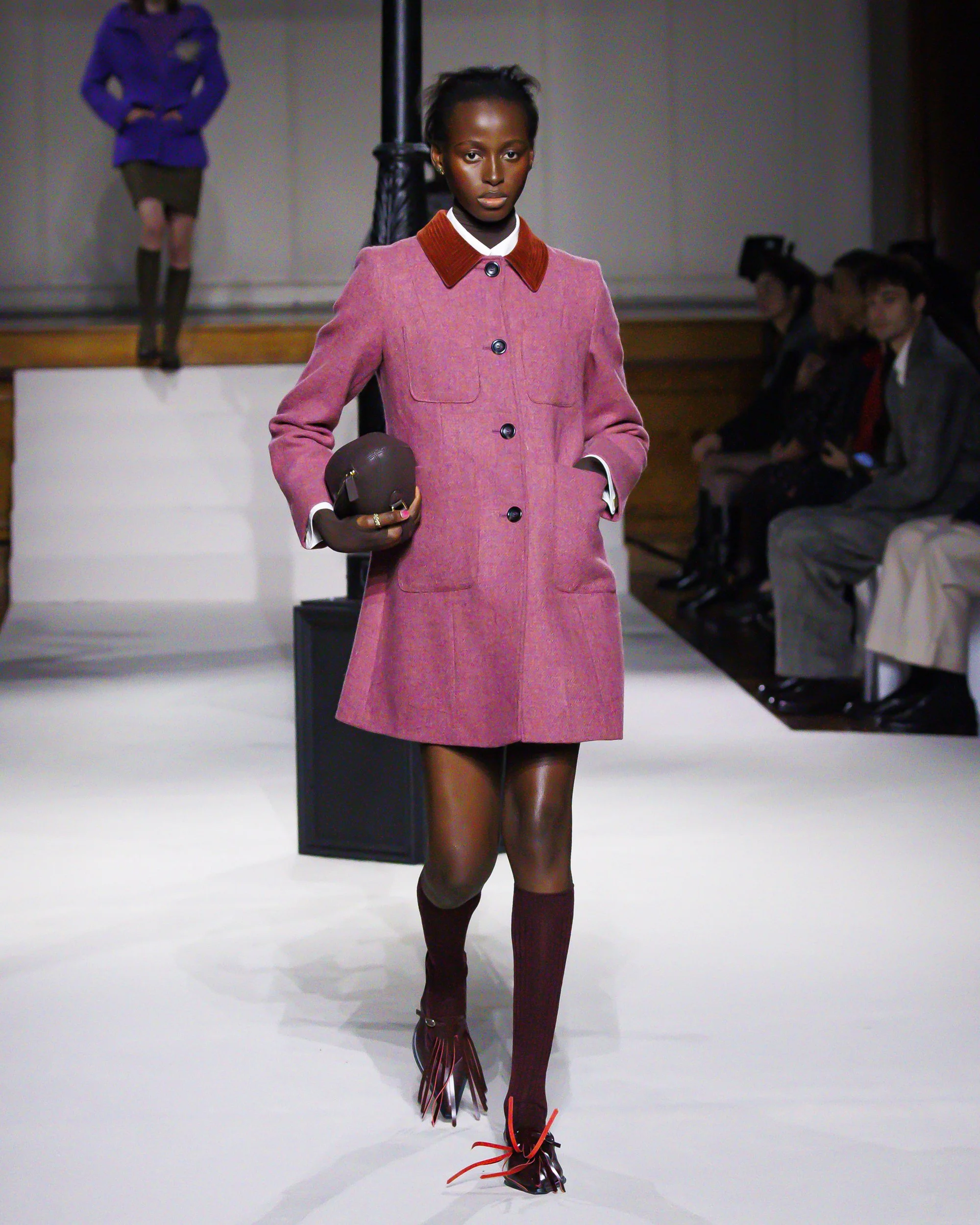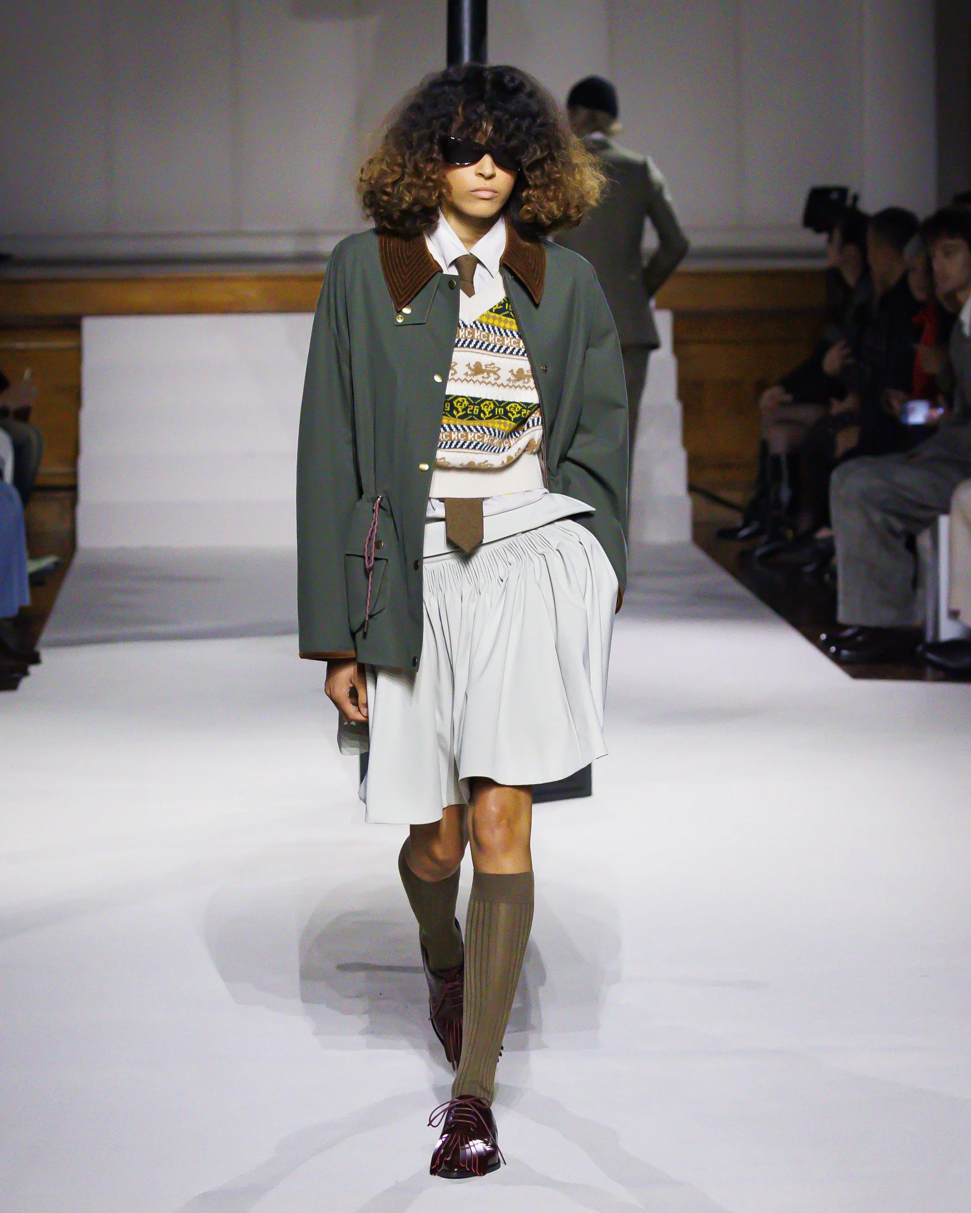 Silhouettes follow suit. Tailoring remains sharp, but never rigid—slim suits are offset by deconstructed knits and exaggerated volumes that feel almost insurgent against the codes they reference. The trench coat, perhaps the most enduring symbol of British outerwear, is reimagined with patent finishes and cape-like constructions, suggesting both armor and anonymity. It’s not about abandoning heritage—it’s about interrogating it.
