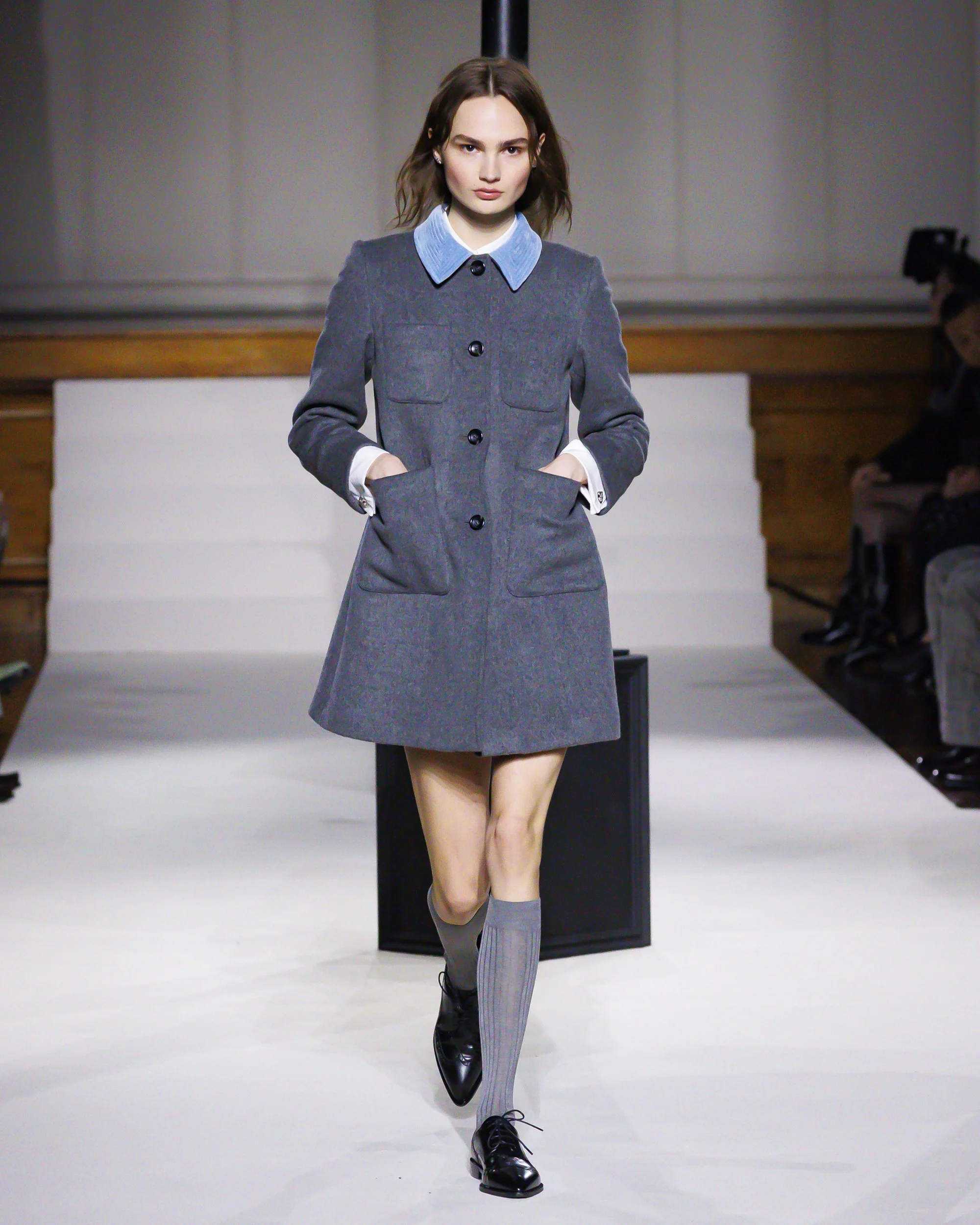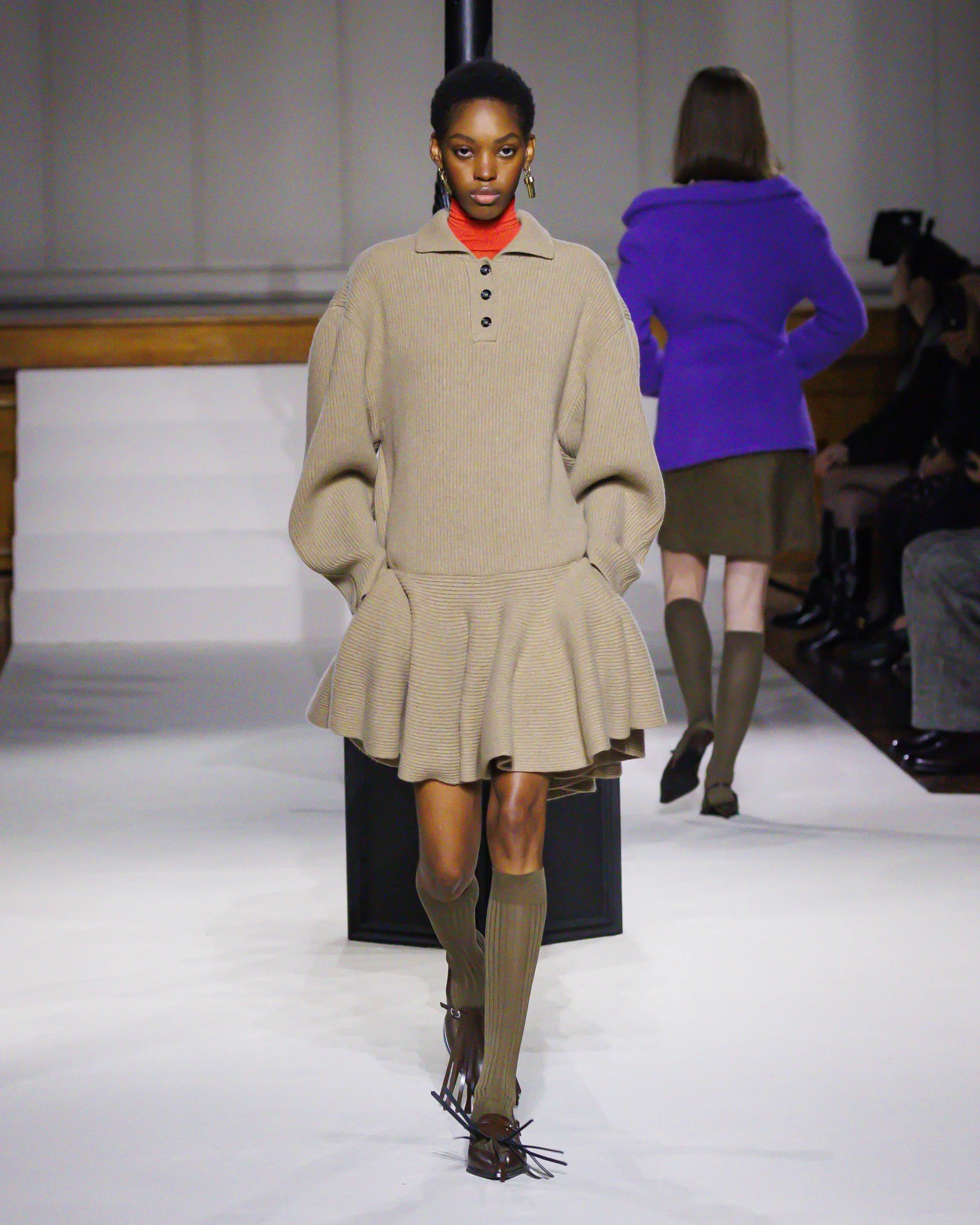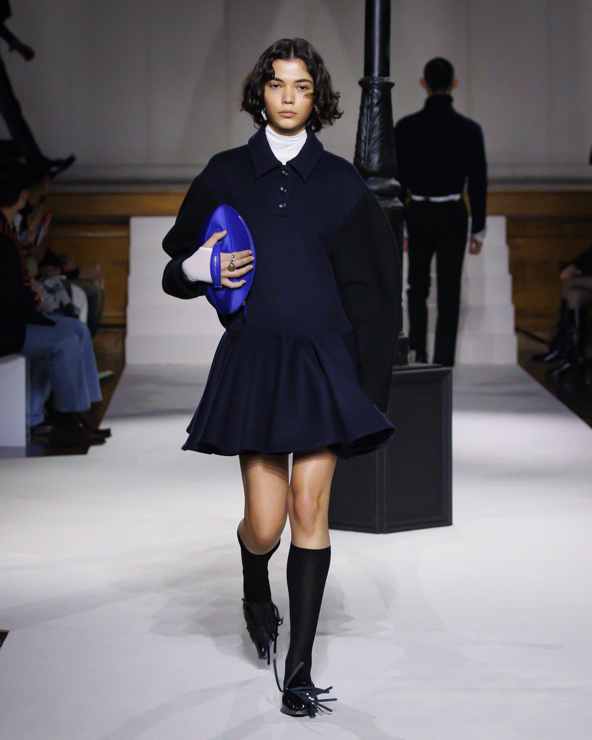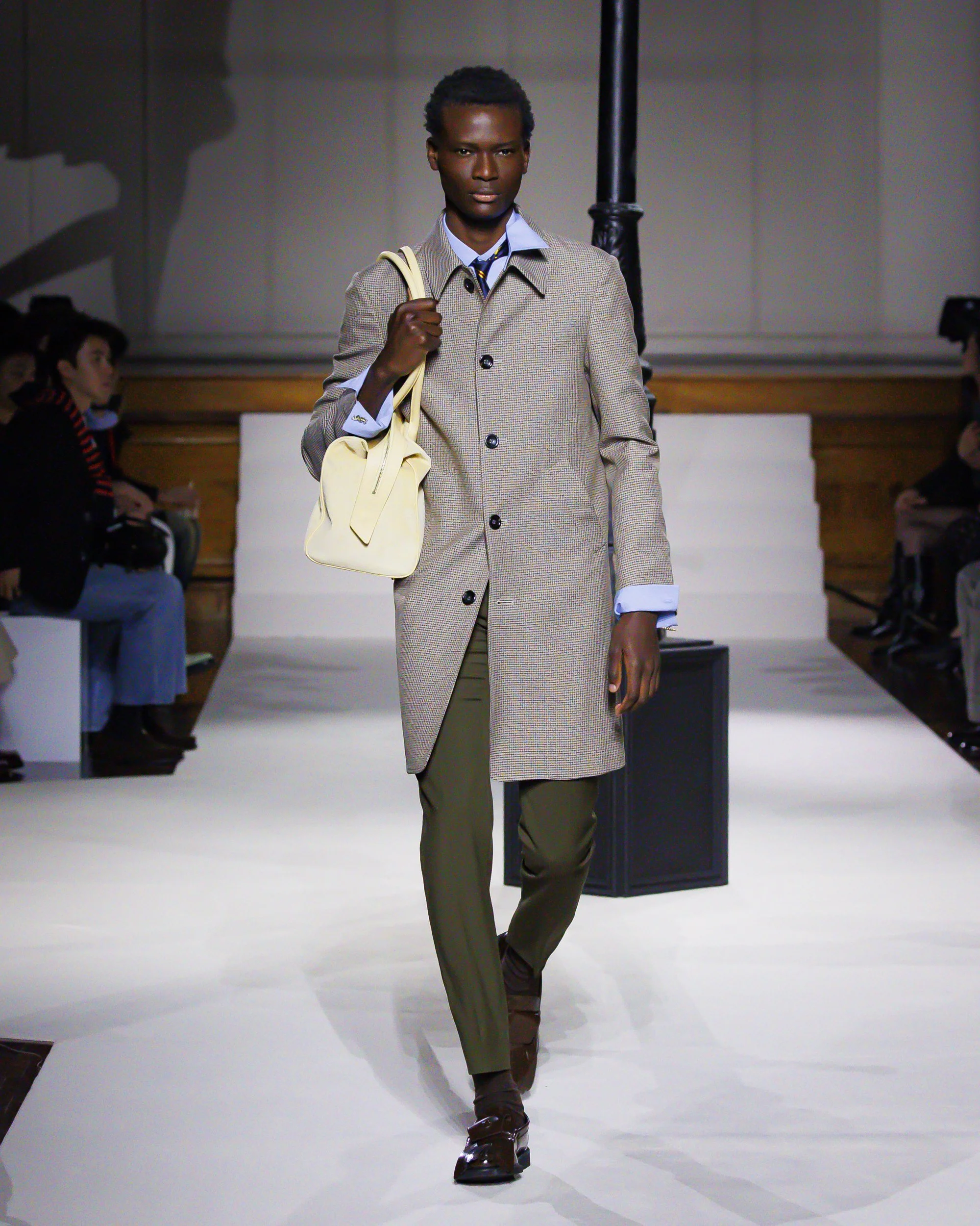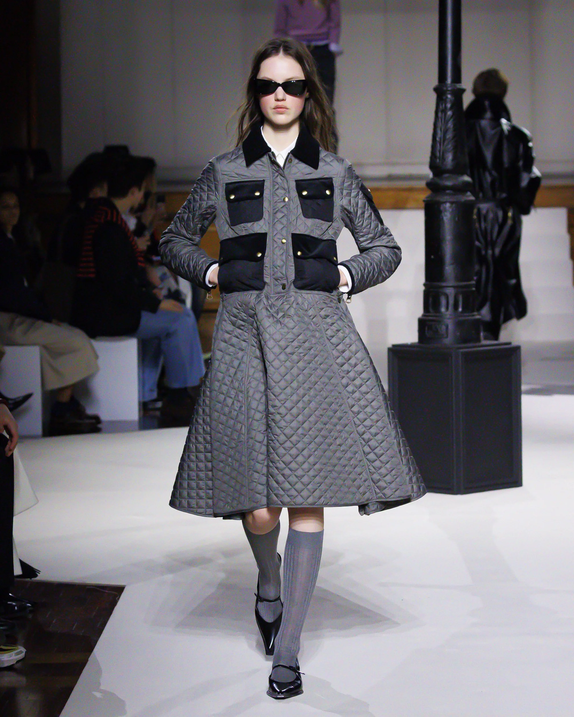 Silhouettes follow suit. Tailoring remains sharp, but never rigid—slim suits are offset by deconstructed knits and exaggerated volumes that feel almost insurgent against the codes they reference. The trench coat, perhaps the most enduring symbol of British outerwear, is reimagined with patent finishes and cape-like constructions, suggesting both armor and anonymity. It’s not about abandoning heritage—it’s about interrogating it.