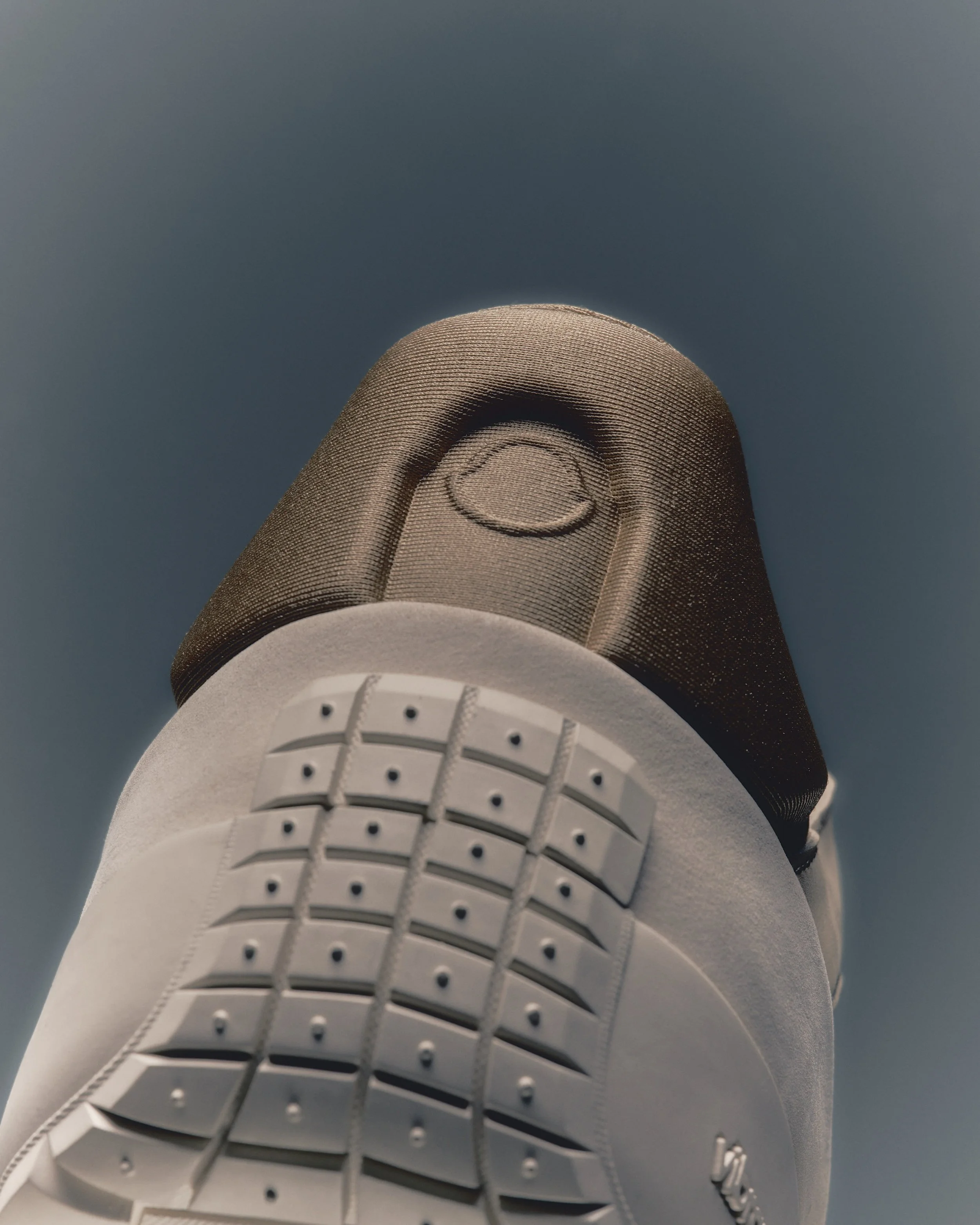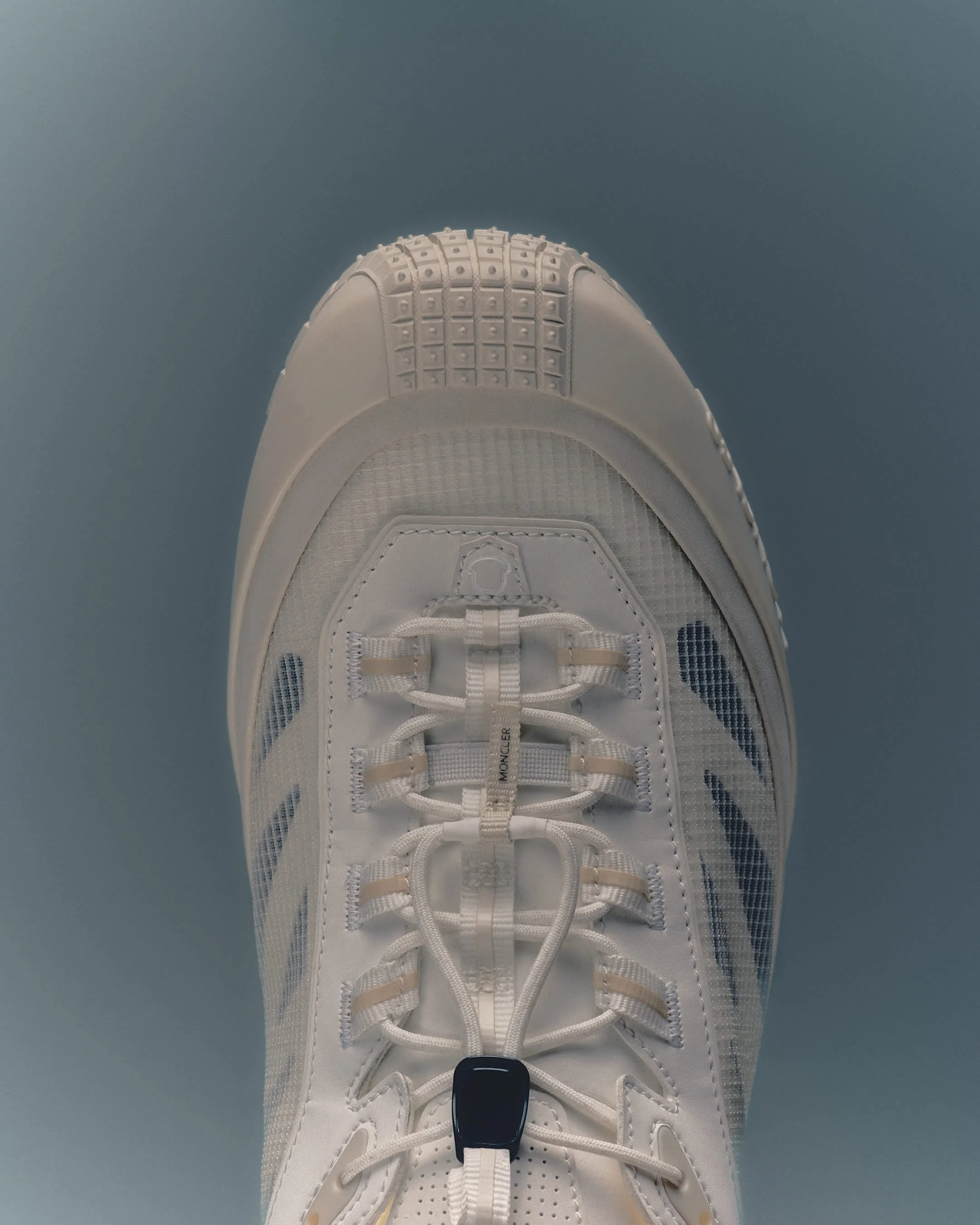 The shoe’s concealed midsole delivers enhanced cushioning while keeping the profile sleek and close to the ground. A bold TPU toe cap, embossed with Moncler’s emblem, wraps the front for reinforced protection and flows into a rugged Vibram® outsole, creating the visual effect of a single, continuous construction from toe to heel. The upper is sculpted for adaptive comfort and features the sharp, recognizable M detail, while protective foxing above the outsole safeguards the design and reinforces the original Trailgrip’s iconic language.