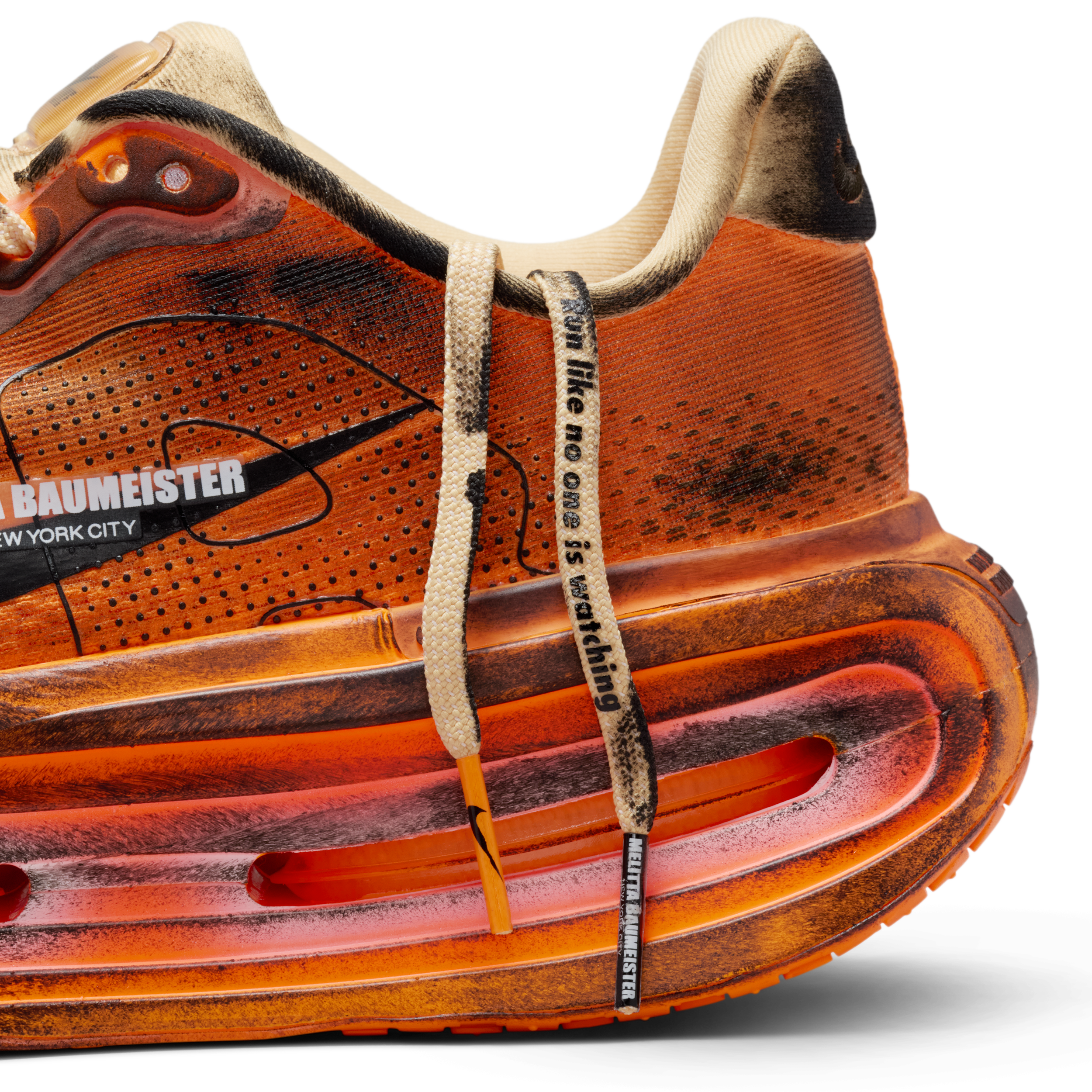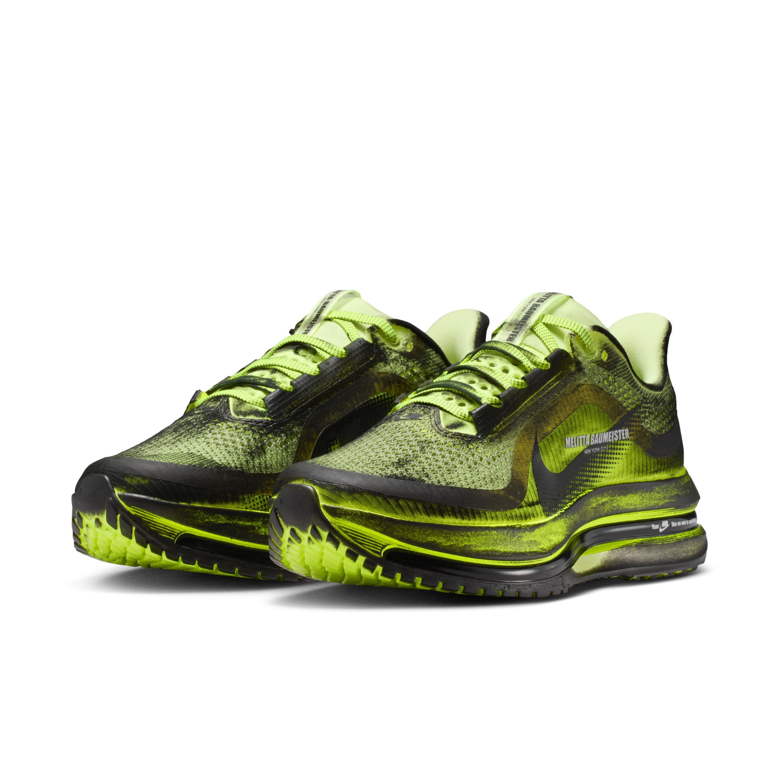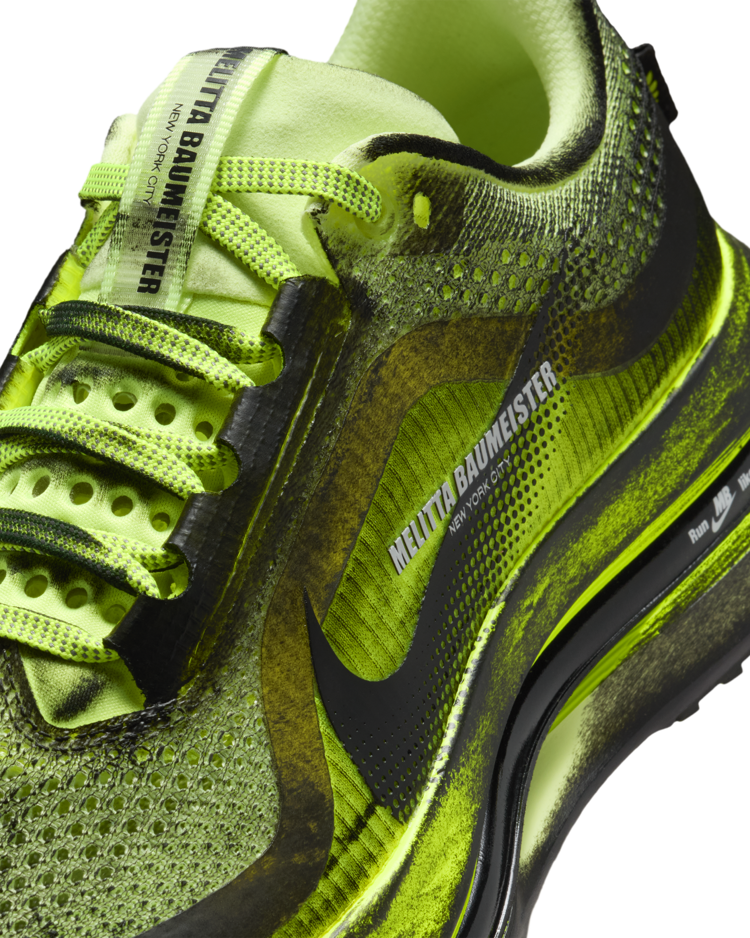 Anchored by the ethos Run Like No One Is Watching, the collaboration arrives as a counterpoint to the hyper-visible culture surrounding sport and style. Baumeister’s sculptural approach transforms each silhouette into a study of movement and imperfection. The Vomero Premium is hand-painted, ensuring no two pairs are alike—each one functioning as a wearable artifact marked by the human hand. The Pegasus Premium, rendered in an electric Volt palette, introduces layered graphics, including motifs of the designer’s own eyes and hands, creating a dialogue between the wearer and the object itself.