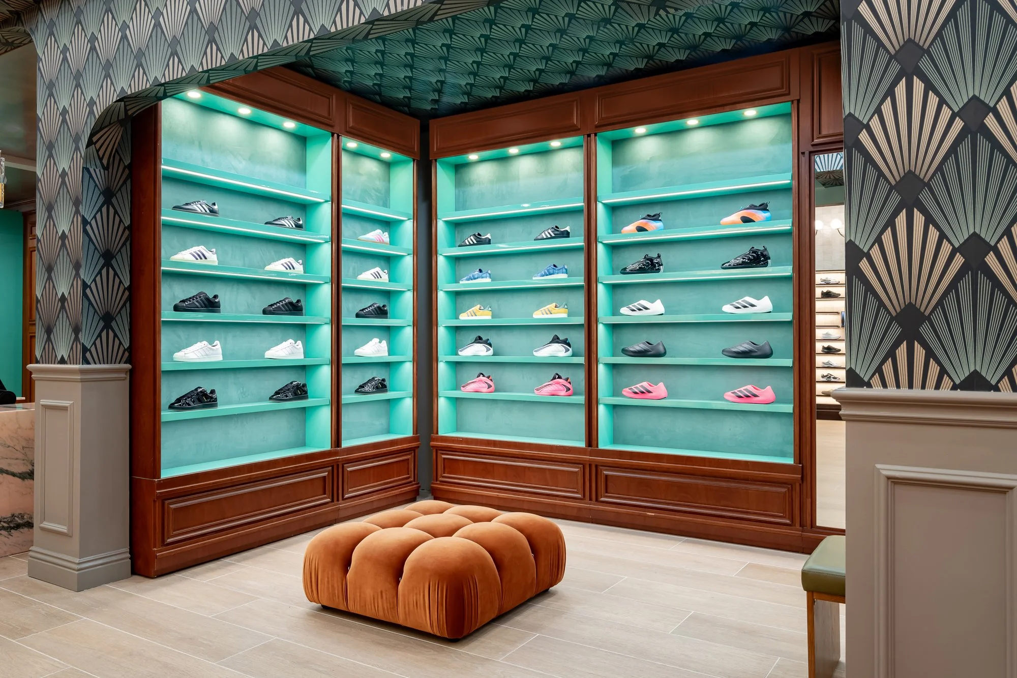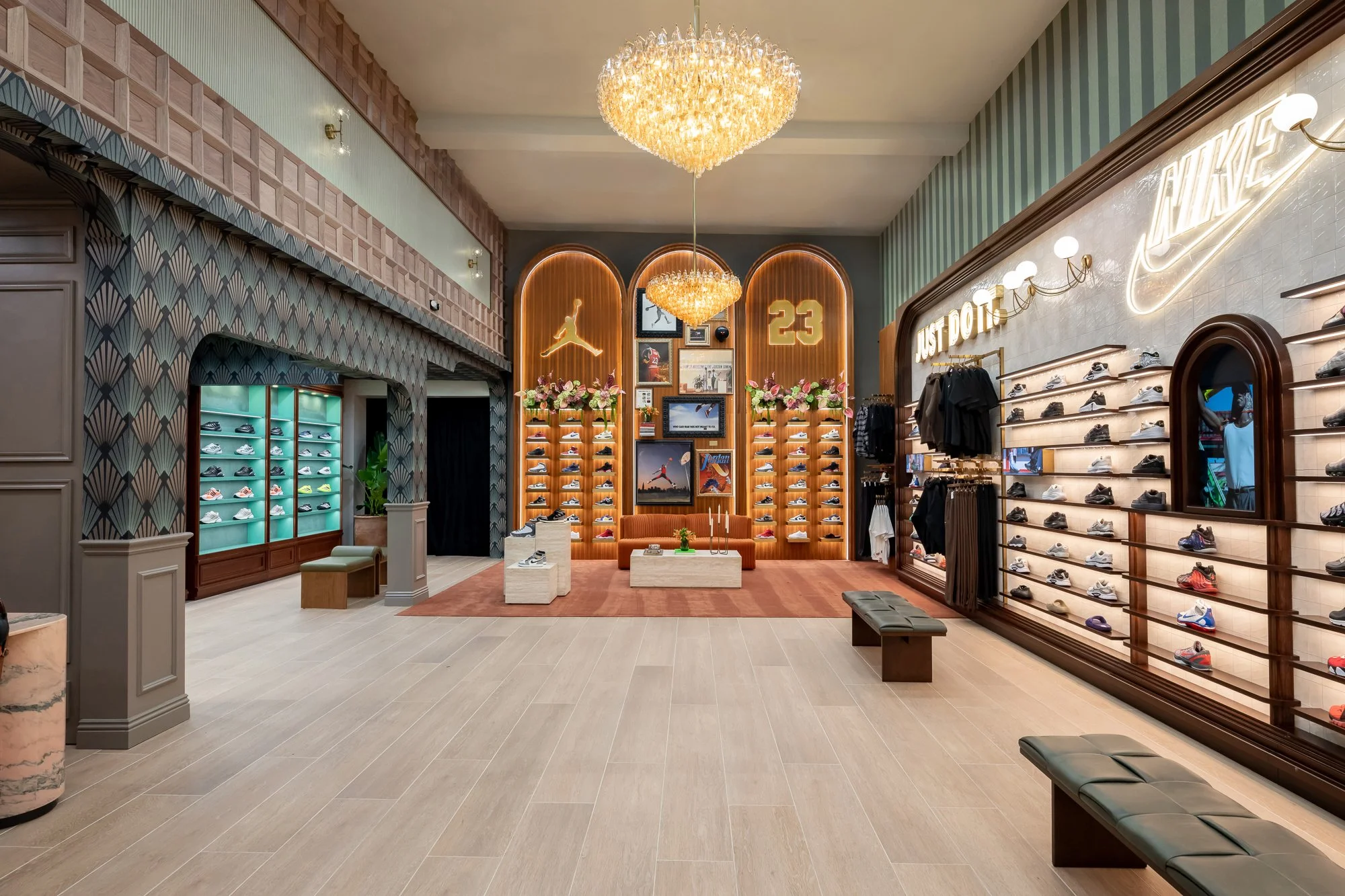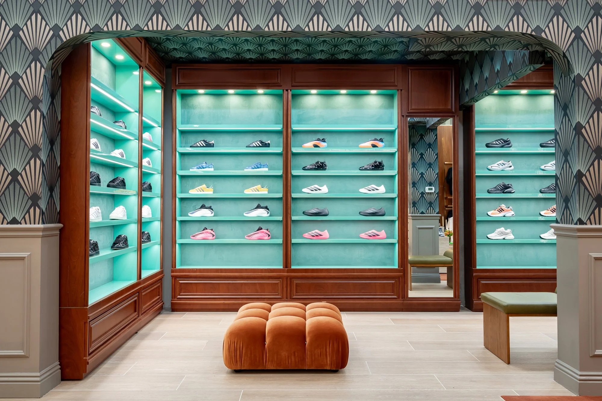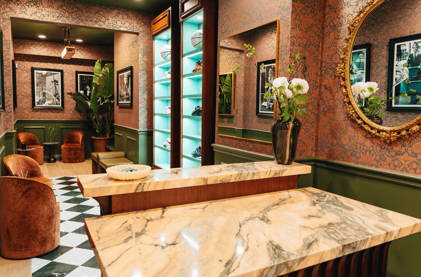 The interior design leans heavily into the mystique of Prohibition-era speakeasies, subtly referencing hidden lounges and private social spaces. Custom stone and marble surfaces anchor the store’s layout, while botanical prints, opulent wall treatments and soft palettes of blush pink and mint green add a refined contrast to the typically industrial aesthetic associated with sneaker retail.