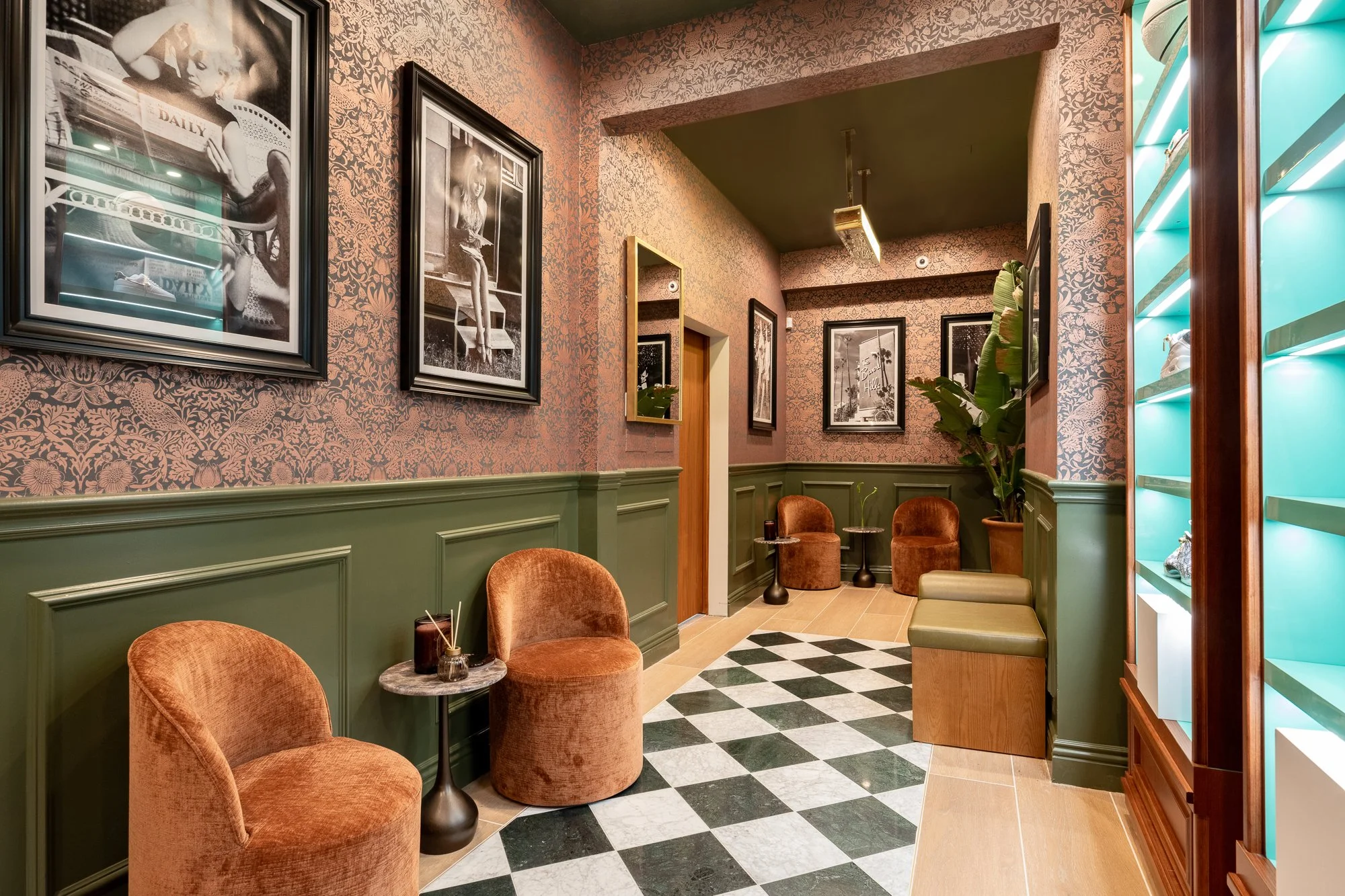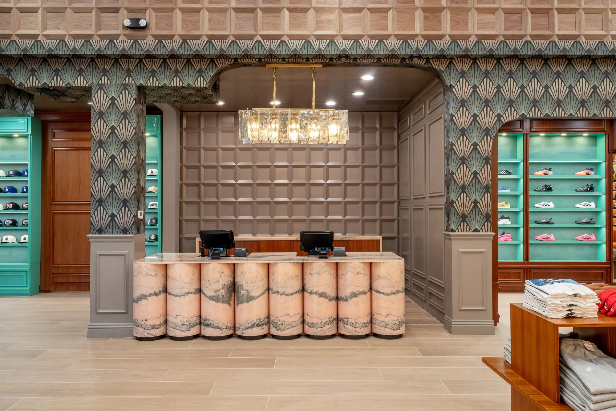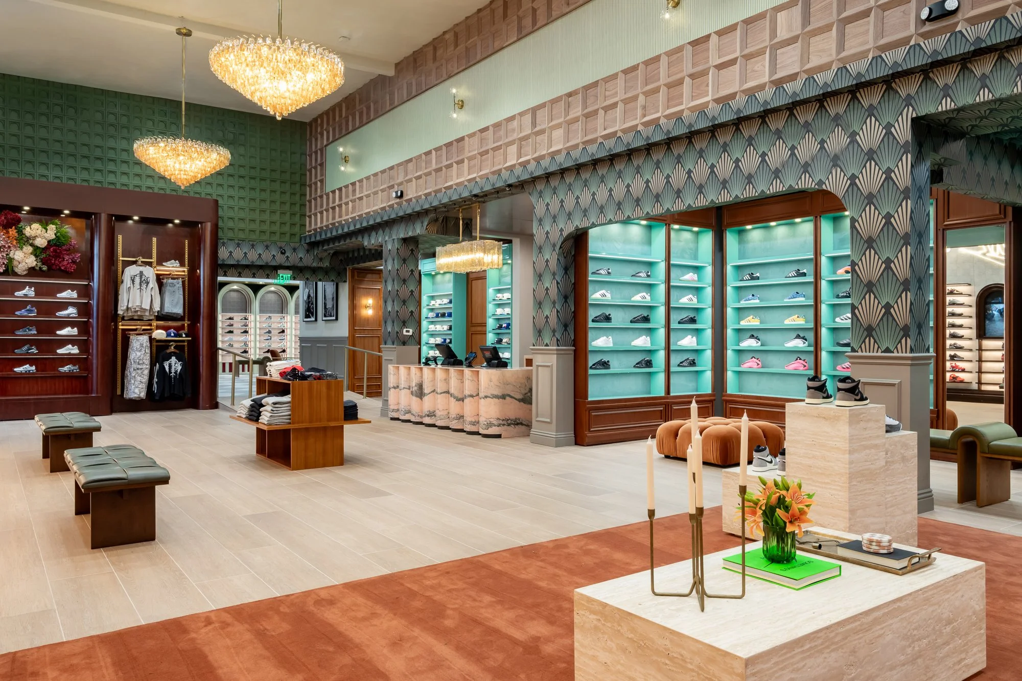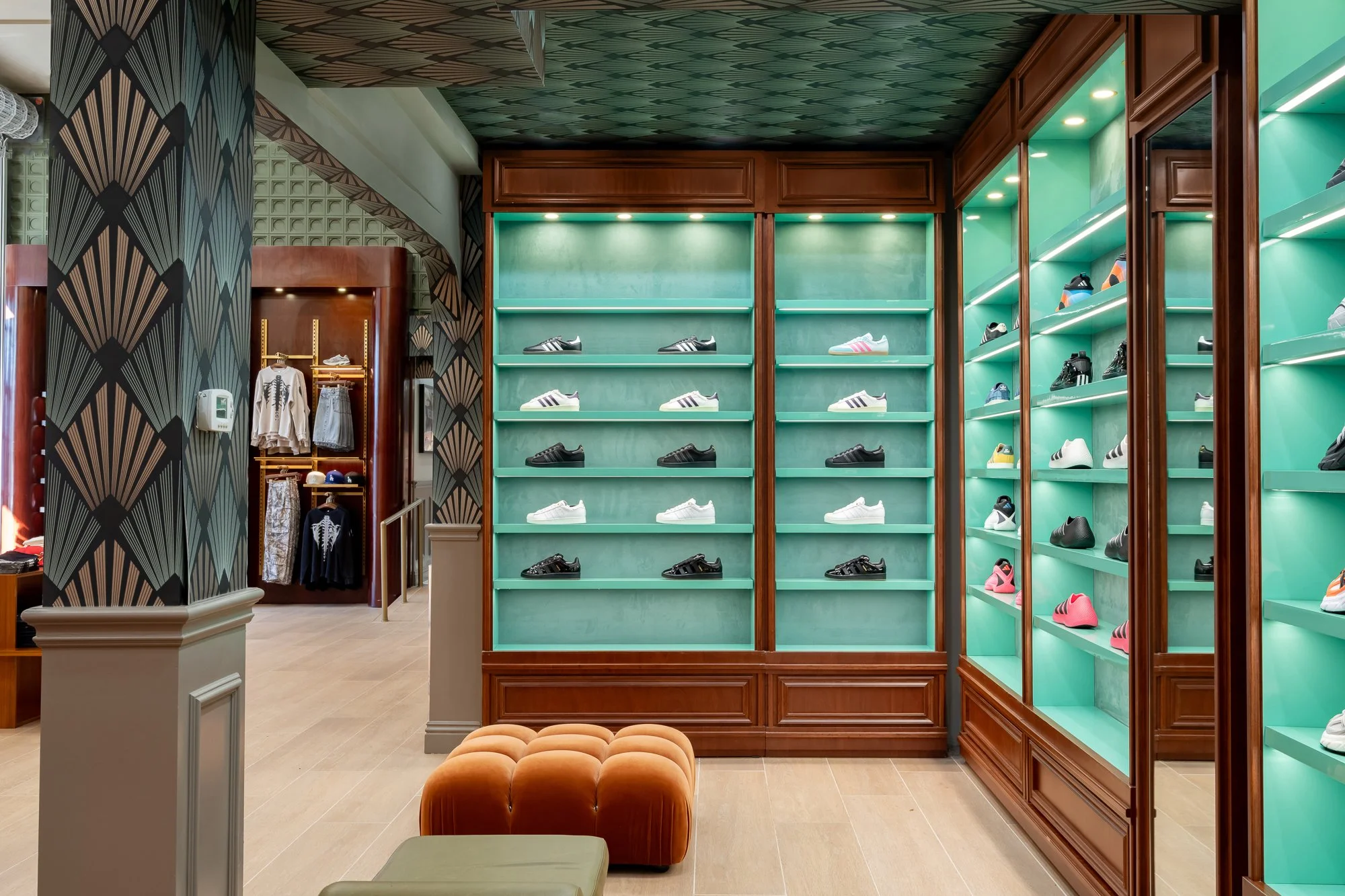 The interior design leans heavily into the mystique of Prohibition-era speakeasies, subtly referencing hidden lounges and private social spaces. Custom stone and marble surfaces anchor the store’s layout, while botanical prints, opulent wall treatments and soft palettes of blush pink and mint green add a refined contrast to the typically industrial aesthetic associated with sneaker retail.