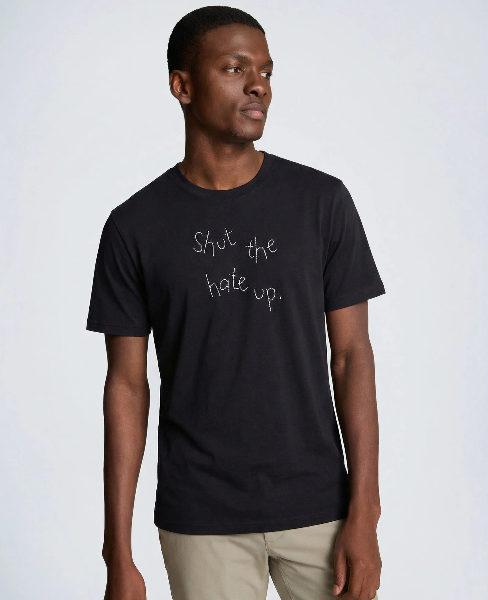 Anchored in the principles of the First Amendment, the collection translates language into wearable declarations. Phrases such as “Free the Speech,” “Unmute Yourself,” “Shut the Hate Up,” “Speak Even If Your Voice Shakes,” and “Read Between the Lies” are rendered through Lingua Franca’s signature hand-embroidered technique—each stitch reinforcing the intimacy and intentionality behind the message.