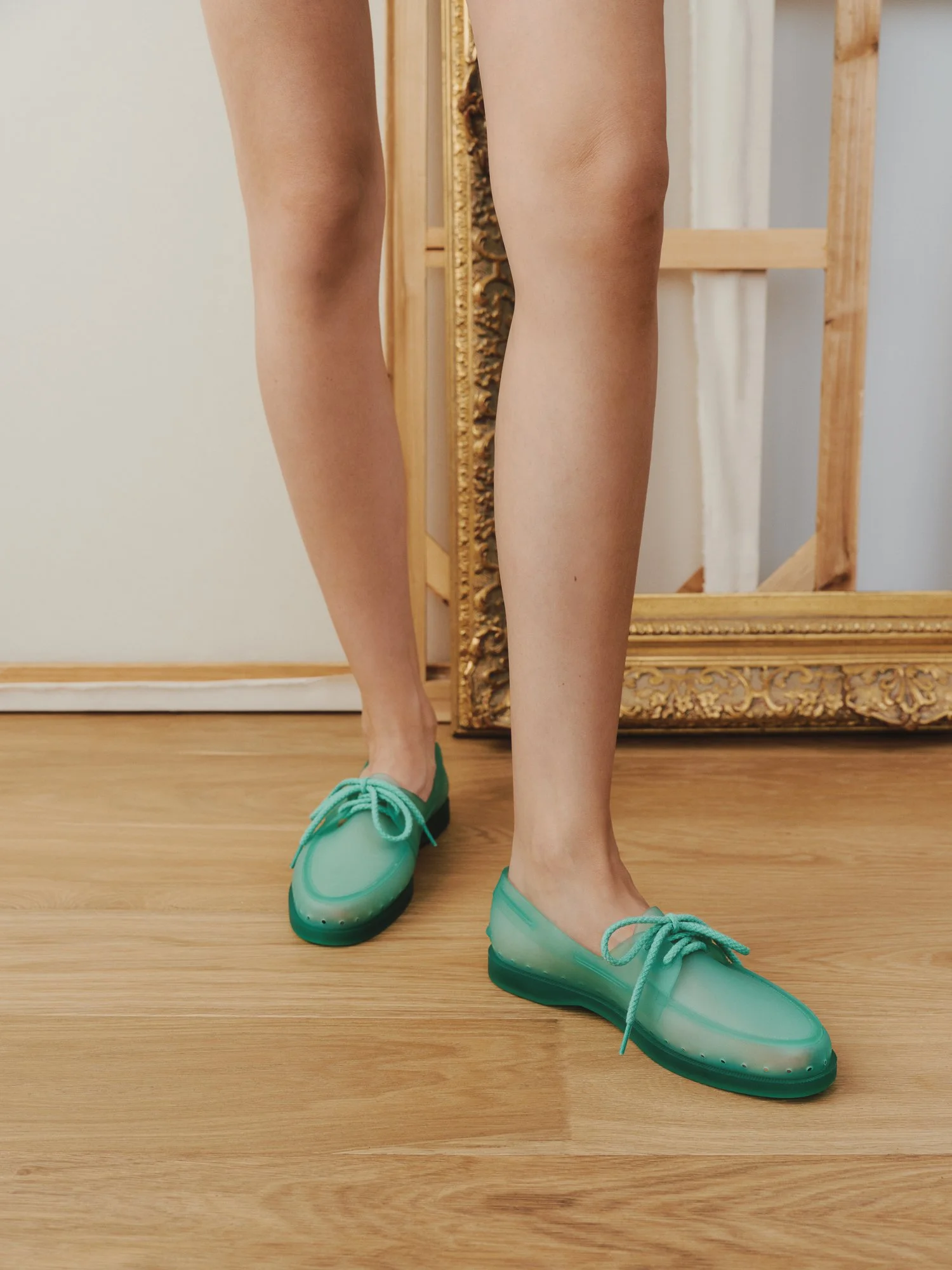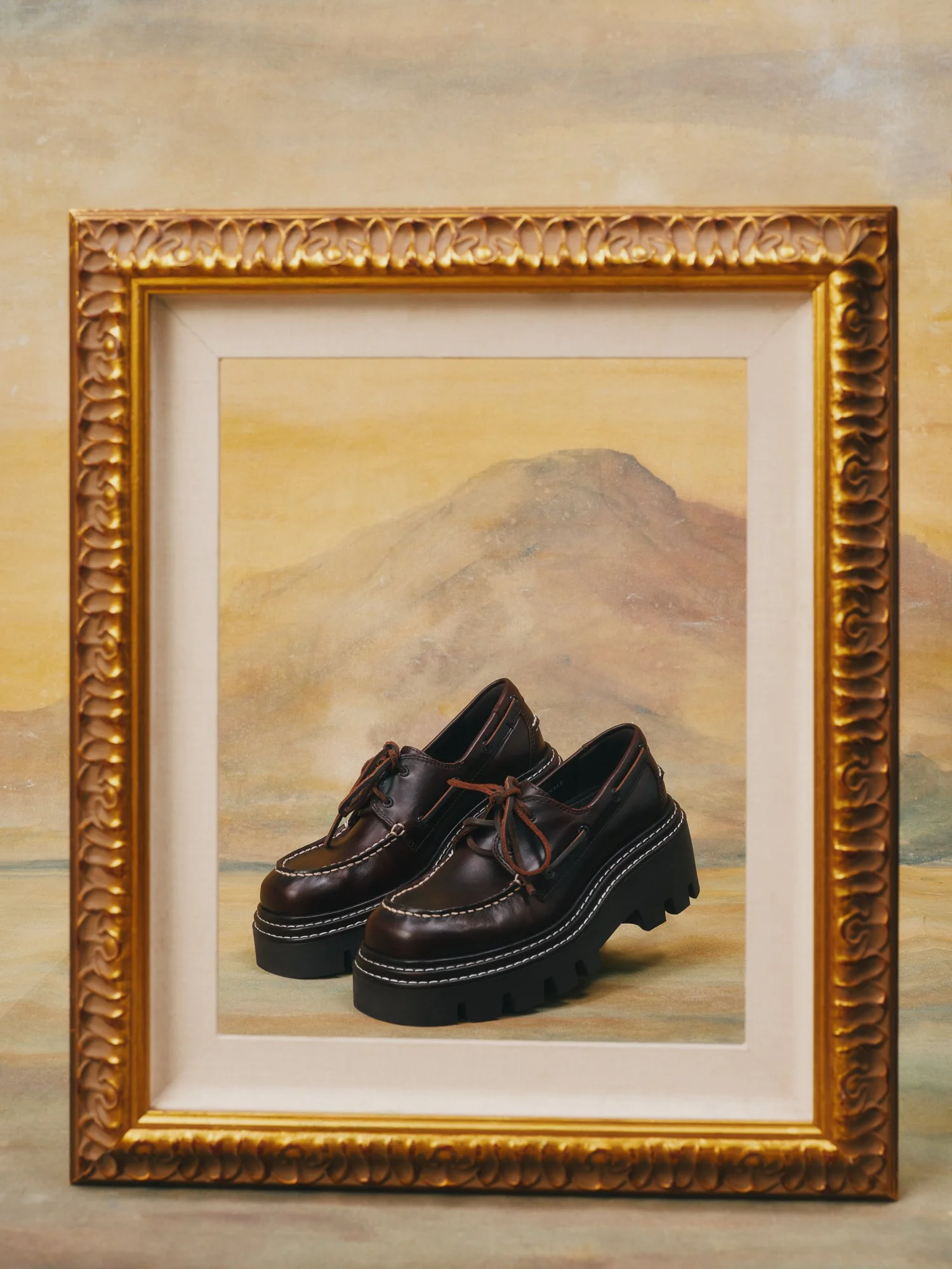 At the center of the collection is a deliberate reimagining of Sperry’s most recognizable silhouette. The Authentic Original™ 2-Eye Jelly Boat Shoe emerges as a standout, reinterpreted with a tactile, almost translucent sensibility and offered in saturated tones like Mandarin Orange and Seaglass. Elsewhere, the Authentic Original™ 2-Eye Lug Boat Shoe pushes the category further, introducing squared toes, pronounced stitching, and a platform sole that reframes prep through a distinctly contemporary—and notably feminine—point of view.