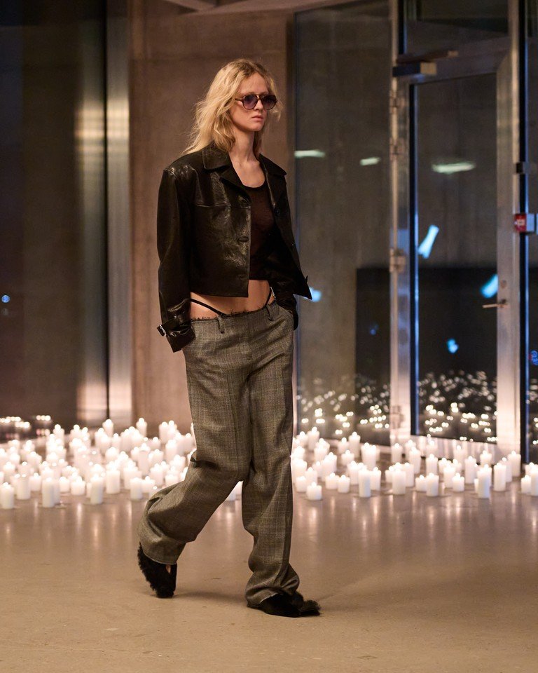Central to that provocation were low-rise jeans and thong-revealing bumsters—silhouettes that echoed fashion’s early-2000s obsession with the body, but recalibrated here through a contemporary, female-authored lens. Almberg spoke of the pieces in terms of upcycling and silhouette, yet the message landed more viscerally. Designed by a woman, for women, these looks rejected nostalgia in favor of authorship, offering a sharp, almost defiant take on how femininity and sexuality are framed today.