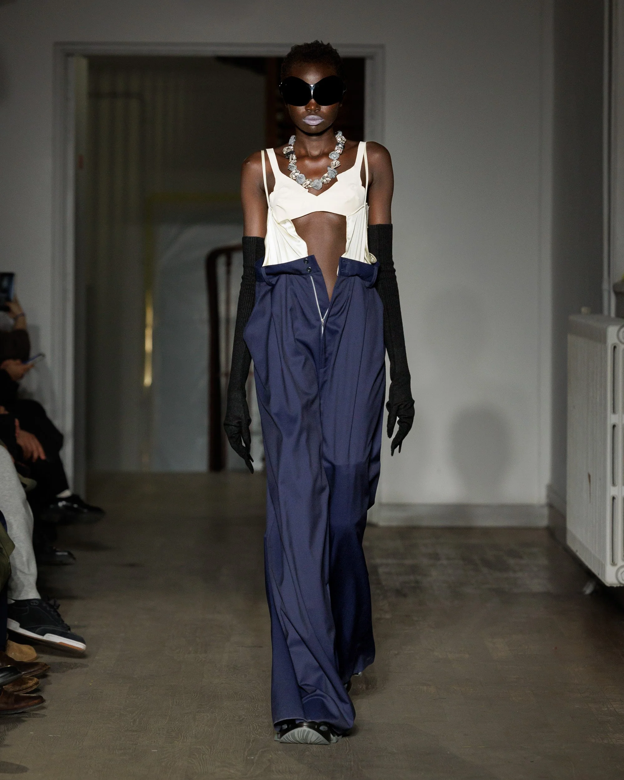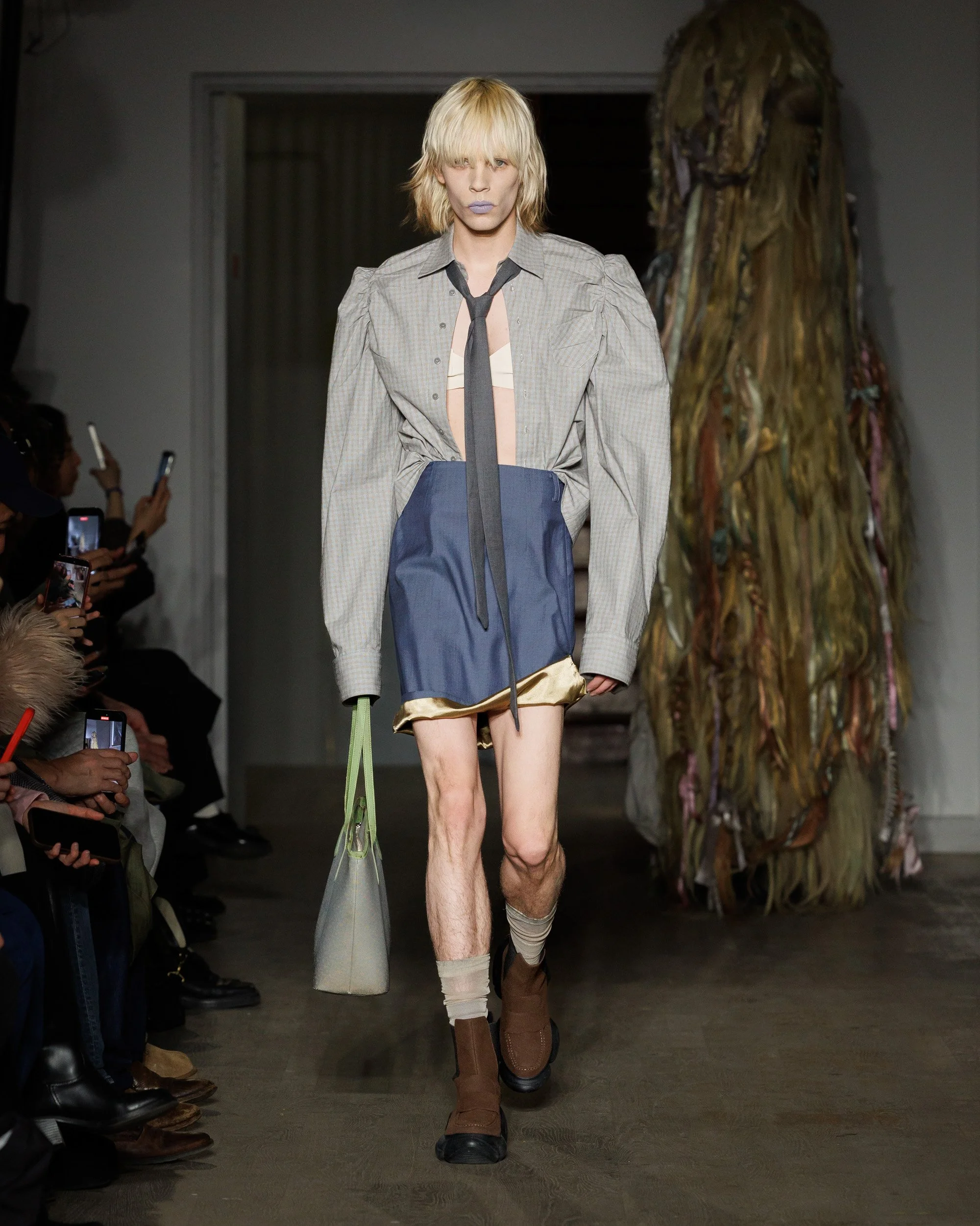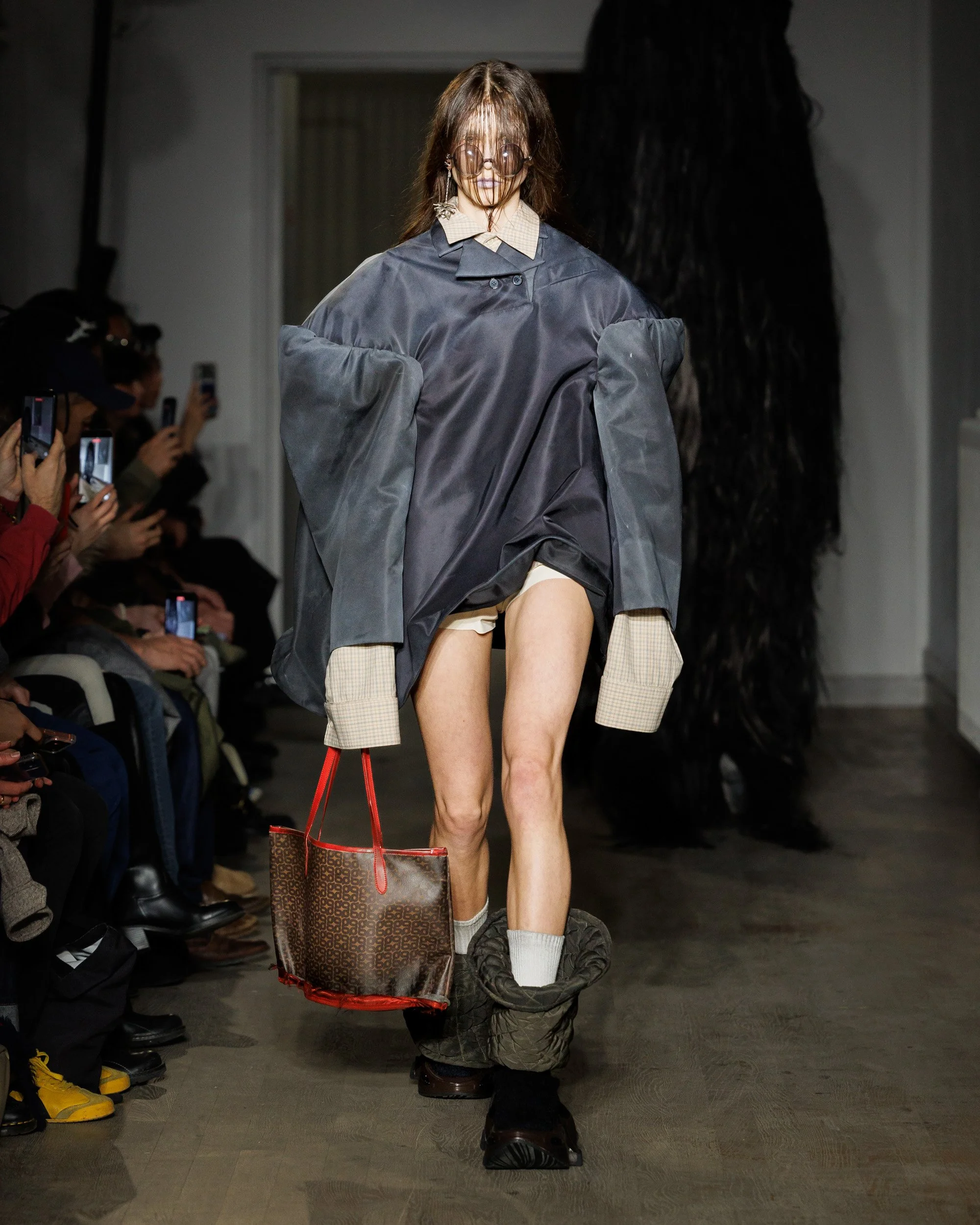 Hair, surprisingly, becomes one of the collection’s most disorienting design elements. Sculpted into exaggerated structures, it obscures the models’ faces entirely, collapsing traditional markers of identity. Orientation dissolves—front becomes back, back becomes front—creating silhouettes that feel ambiguous and destabilized. The effect is intentionally uncanny, inviting viewers to question how easily recognition and certainty can be disrupted.