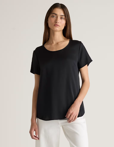 The Quinces Washable Stretch Silk Tee is a well-made wardrobe essential. It skillfully combines practicality, elegant design, and opulent comfort, while also offering the added advantages of excellent value and ethical production. Among other colors the stylish black stretch silk tee is a washable option. Made with 90% mulberry silk and 10% spandex it has a plush feel and a discreet amount of stretch for a snug fit.