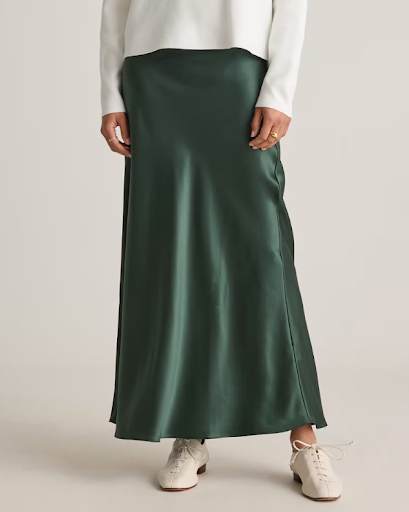 Everyday comfort and sophisticated style are combined in the Quince Washable Silk Skirt in Forest Green. Crafted from premium mulberry silk, this piece offers an elegant texture, thoughtful design, and ethical credentials at a fraction of traditional retail prices. Its versatility is unmatched, featuring a wide range of colors, a flattering midi cut, and a concealed flexible waistband for effortless comfort and easy wear. It's not just an intelligent and fashionable investment but also a practical one, backed by excellent customer satisfaction, hassle-free care, and easy returns.