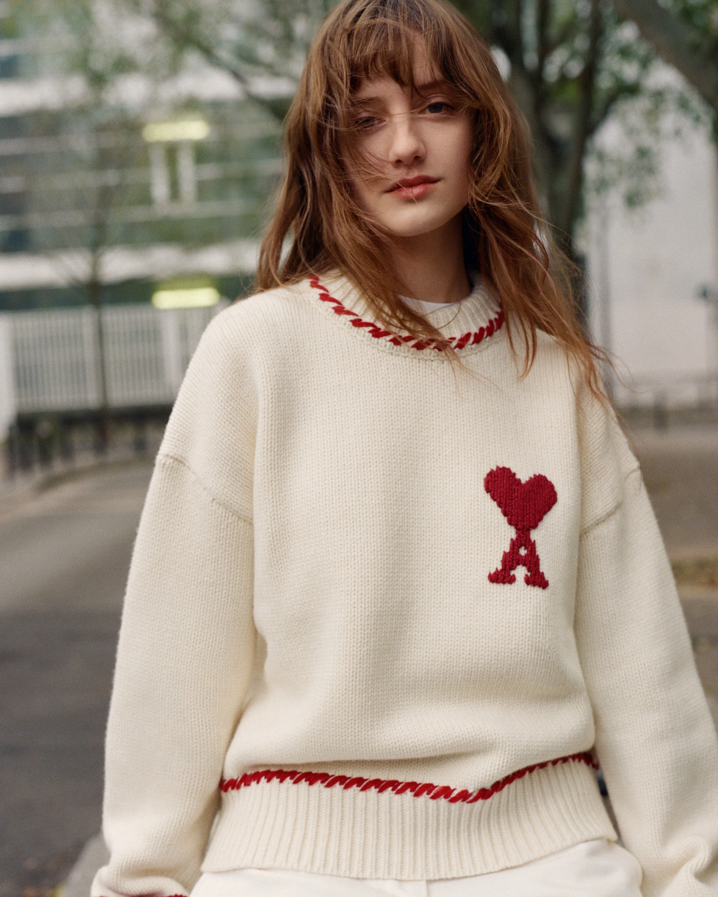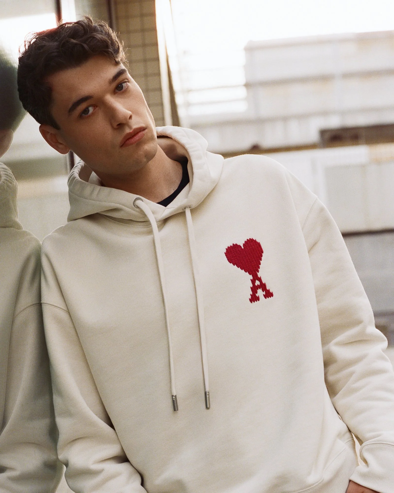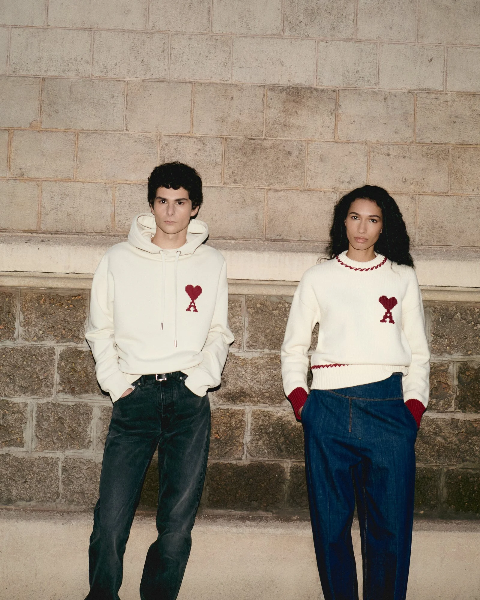 The capsule revisits the emblem in its purest form: a red embroidered heart set against off-white foundations. Wool sweaters and cardigans anchor the offering, while cotton knits, hoodies, and T-shirts extend the language into everyday wear. The palette is deliberate, almost architectural—allowing the symbol to breathe, to speak quietly rather than shout. It’s a reminder that AMI’s strength has always lived in its ability to balance approachability with intention.