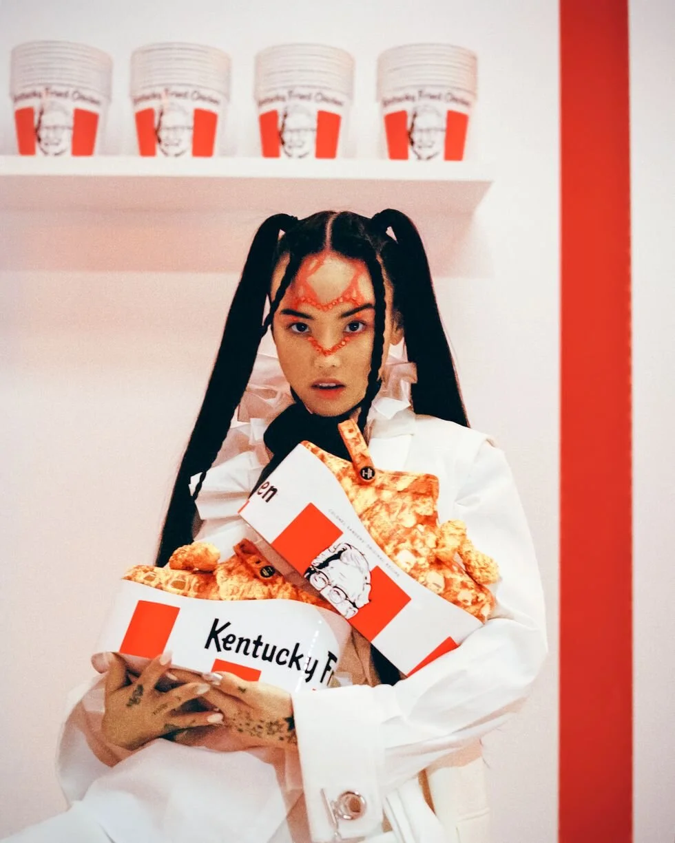 Earlier this year, Instagram sensation with over 1 million followers, a fashion designer at apparel brand Skoot, makeup artist, special effects artist, model and rapper, MLMA took a bucket of KFC and turned it into eyebrow shifting headlines. Identifying herself in person as M; her name meaning Me Love Me a Lot was ecstatic with the idea of creating - something with Kentucky Fried Chicken. "When I heard about the opportunity, I thought my manager was joking" she recalls to Paper magazine. "That's what I love about it."