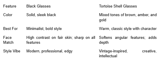 When choosing between black and tortoise shell glasses, consider the image you want to project. Black frames say “confident and polished,” while tortoise shell says “warm and stylish.” But here’s the good news—you don’t have to choose just one.