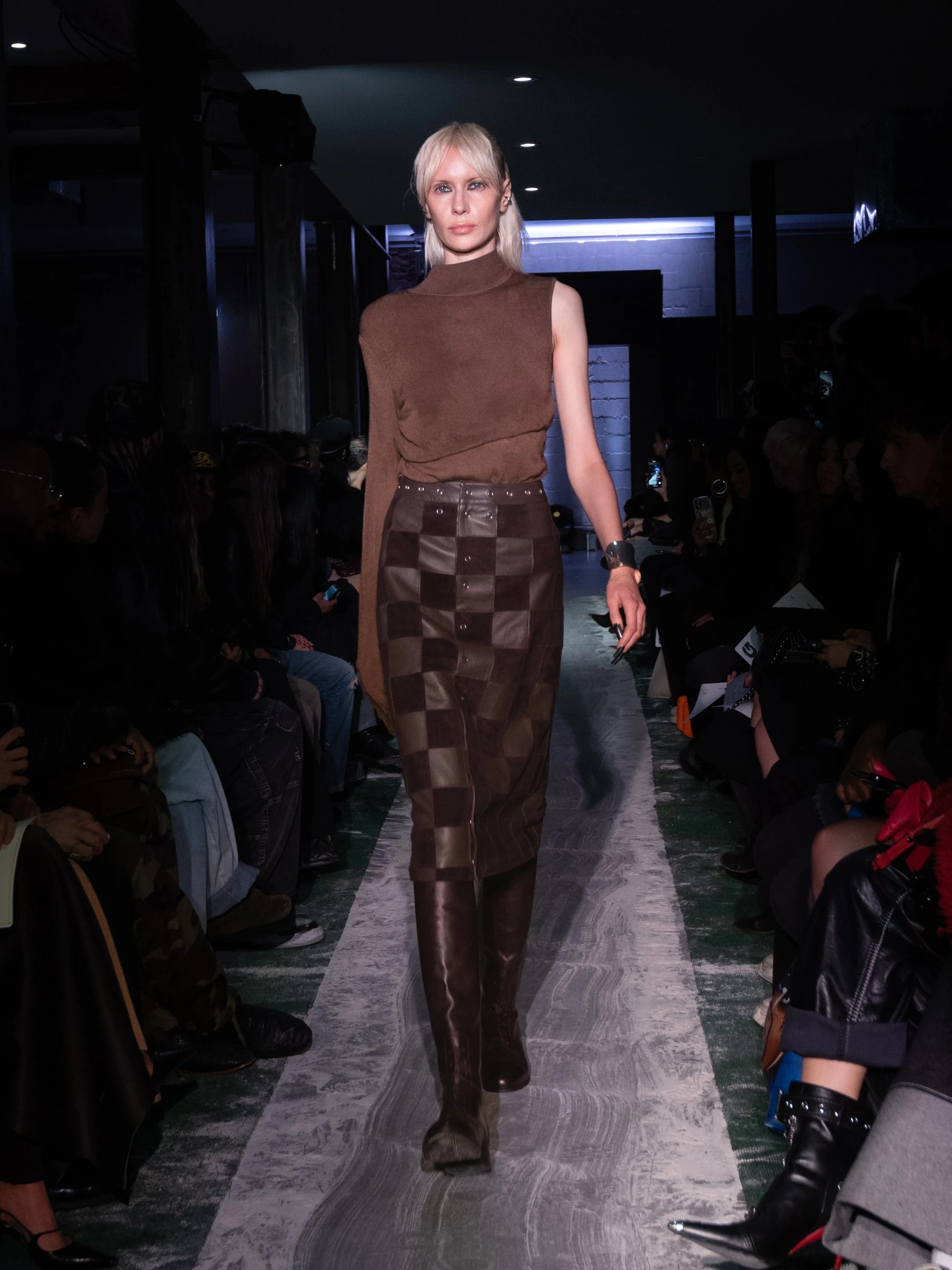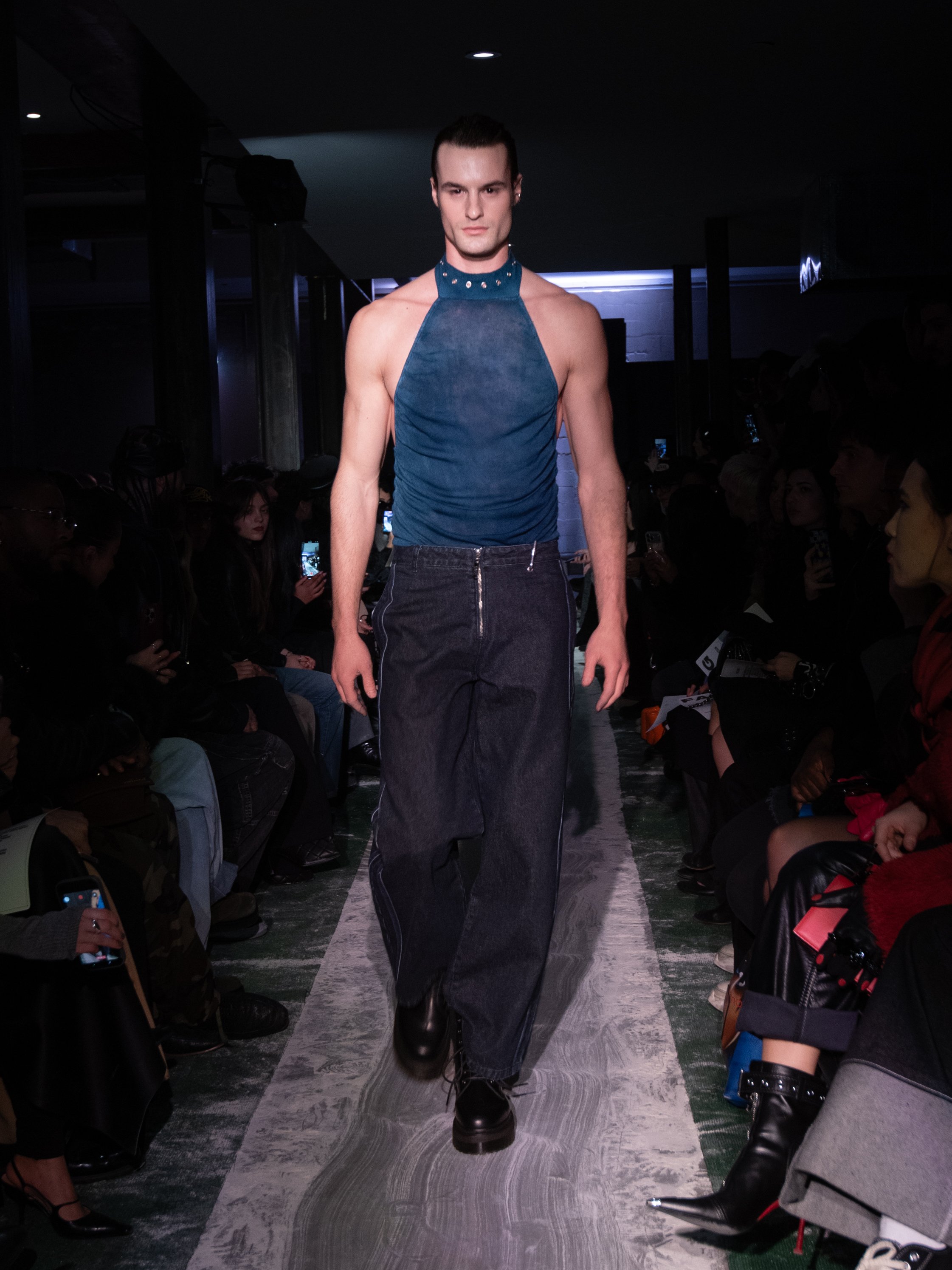 Workwear detailing and industrial textures grounded the collection in FANG NYC’s evolving design codes. Grommets punctuated garments without tipping into cliché; leather pieces felt sculptural rather than aggressive. The balance was deliberate: tenderness against hard-edge, masculine codes softened by pliable construction.