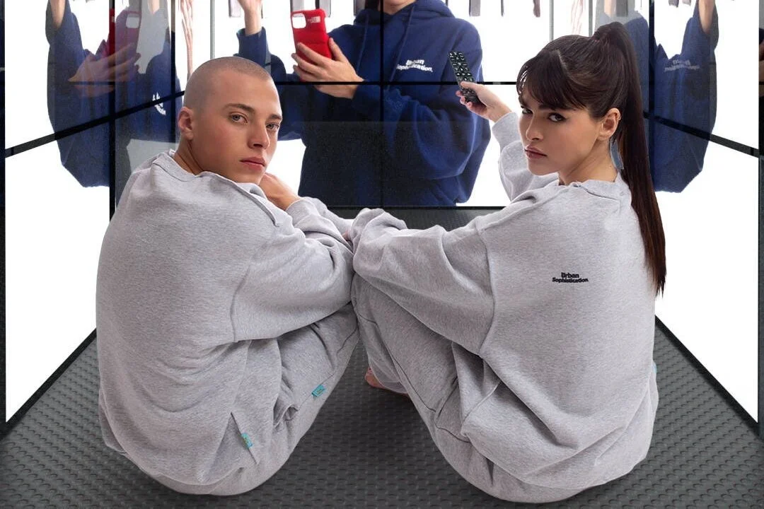 Urban Sophistication "Insecurity" Sweatshirt worn by male and female models.
