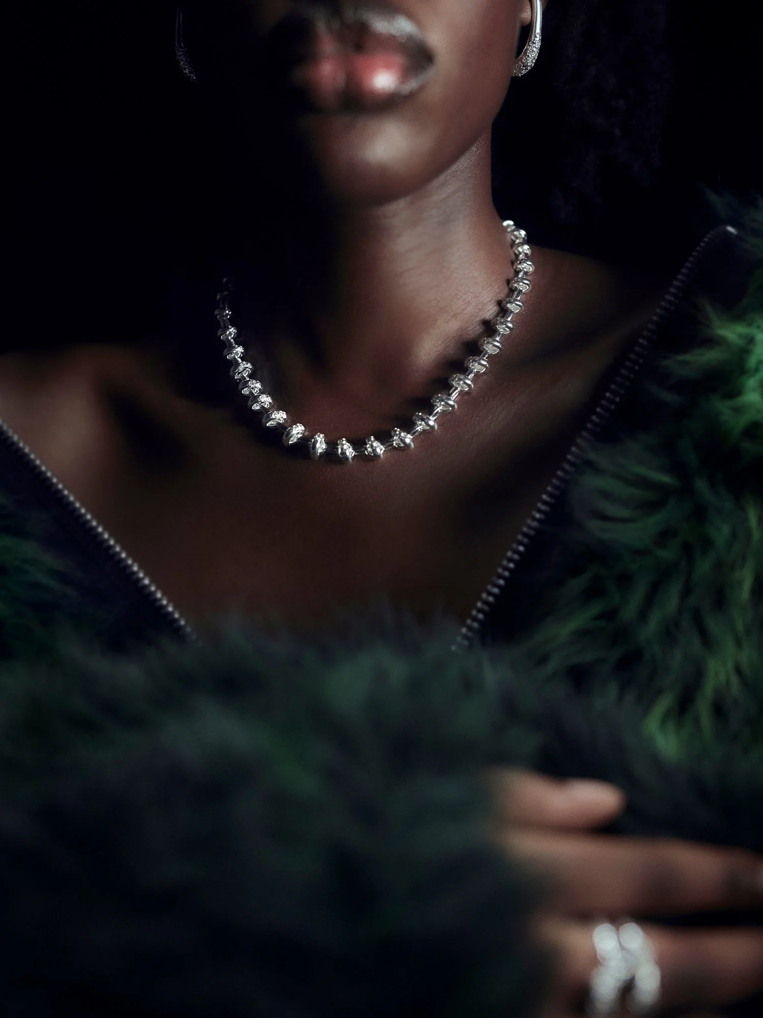 The Yika Necklace, Sawa Earrings, and Pacha Ring each reflect this philosophy. In both sterling silver and 18K gold-plated options, the pieces balance weight and refinement, designed to feel substantial without spectacle. The use of cultivated diamonds—138 stones totaling 0.69 carat for the Yika Necklace, 44 diamonds and a ruby totaling 2.5 carats for the Sawa Earrings, and 3 diamonds totaling 1.37 carats for the Pacha Ring—underscores a commitment to precision and intention over excess.