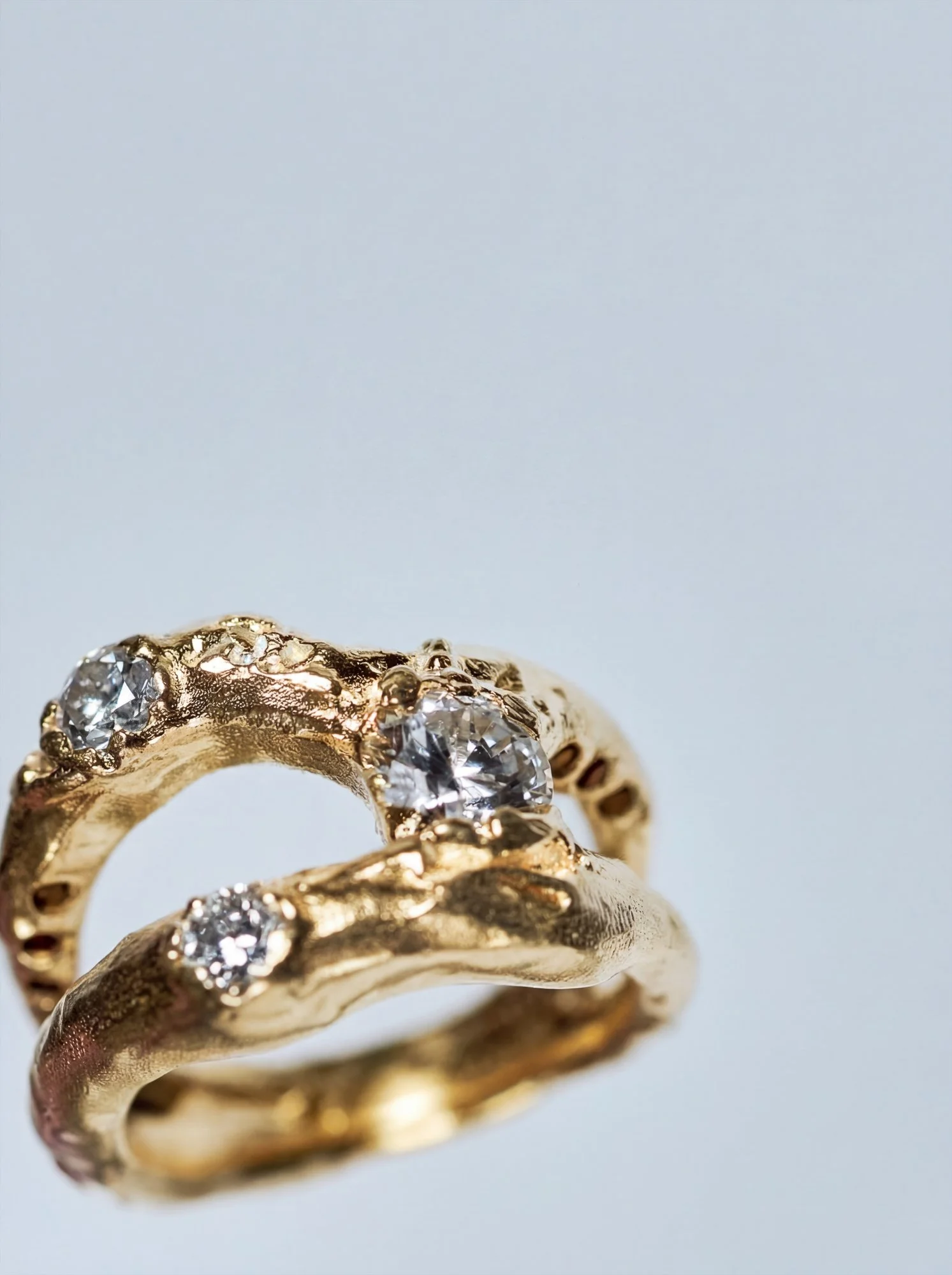 Crafted in sterling silver and 18K gold-plated finishes, the collection incorporates precision-cut cultivated diamonds integrated directly into the forms. Stones are arranged in graduated sizes to create depth and tactile variation, reinforcing the idea that luxury here is not about shine alone, but about structure, balance, and longevity. Materials were selected for durability, with the expectation that these pieces will age visibly, carrying trace and patina over time rather than remaining untouched.