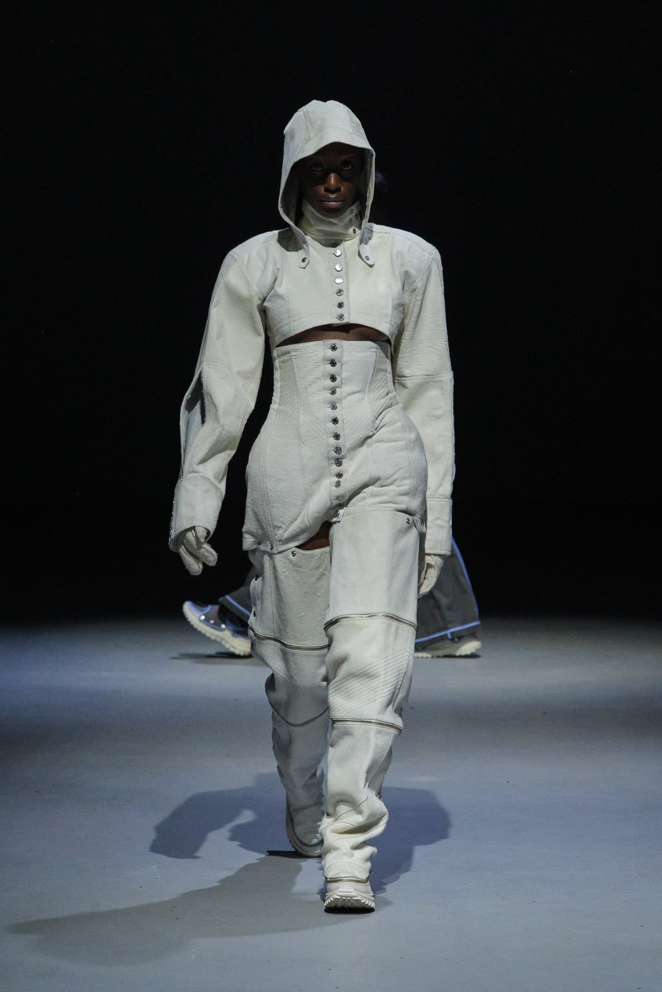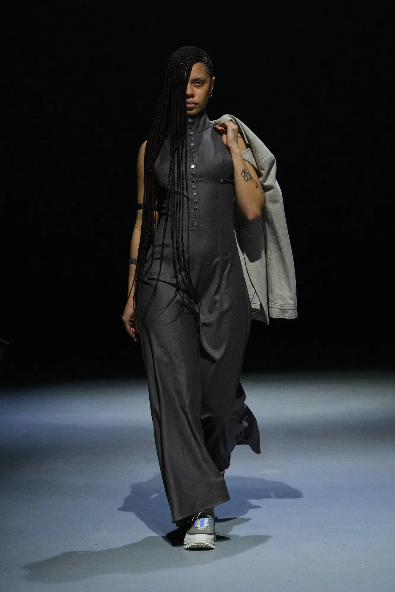 At its core, the collection retools Wade’s signature uniform through the lens of expedition wear. Structured silhouettes remain, but they are now engineered for motion and unpredictability. Modular construction—zip-off elements, convertible layers, adaptable closures—replaces static suiting conventions. It’s a pragmatic evolution that feels in step with a generation that no longer separates work, travel, and self-expression into neat compartments.