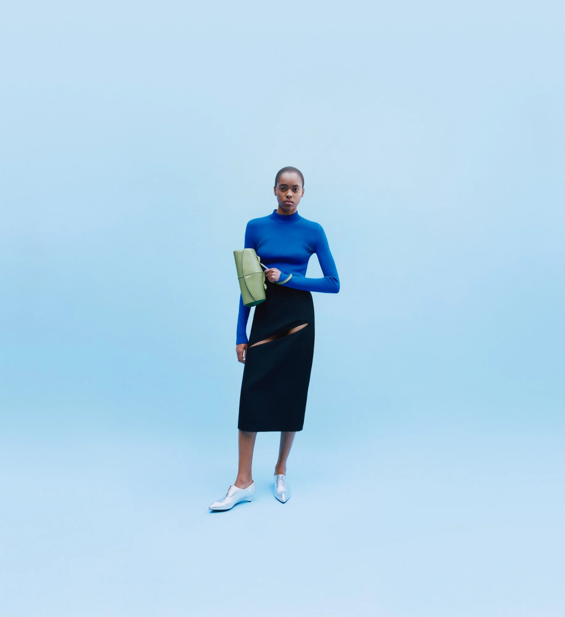 Bellotti’s vision of purism is anything but austere. It is a delicate tension between opposites: strictness and levity, control and freedom, grace and severity. The images of the Spring/Summer 2026 campaign are conceived in the liminal white space of a Milanese studio, where calm and friction coexist. Here, clothing is not just worn—it communicates. “A curiosity for the body is what I am after,” Bellotti explains. “Posture and gesture as ways of communicating, clothes that invite to get close, that hide and reveal. Rationality and feelings.”