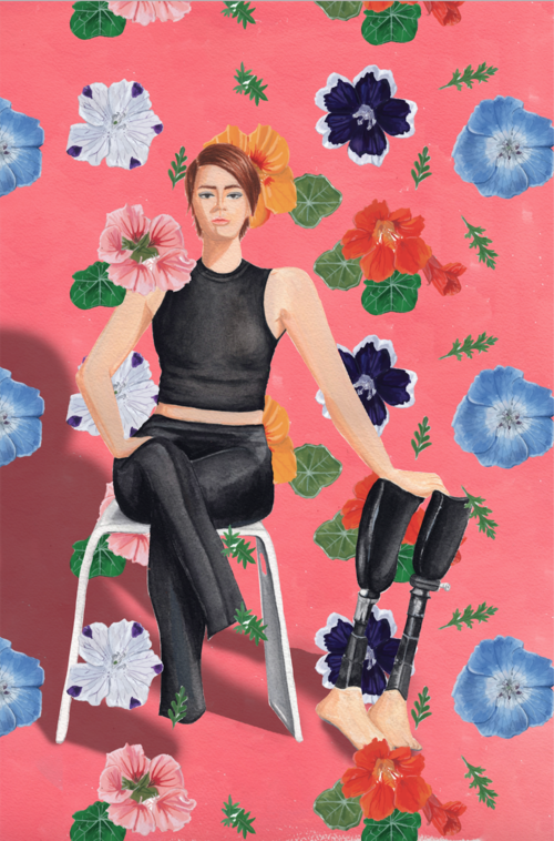 As for her triptych design, the flowered background is nasturtium and nemophila, meaning “victory.” The “Body Positive” series is inspired by the new direction of the fashion industry where the designers, brands, and advertisers are accepting and including more diverse models. Elisa’s muses represent the different sizes and disabilities that some women bare; women who seek to feel beautiful through fashion.