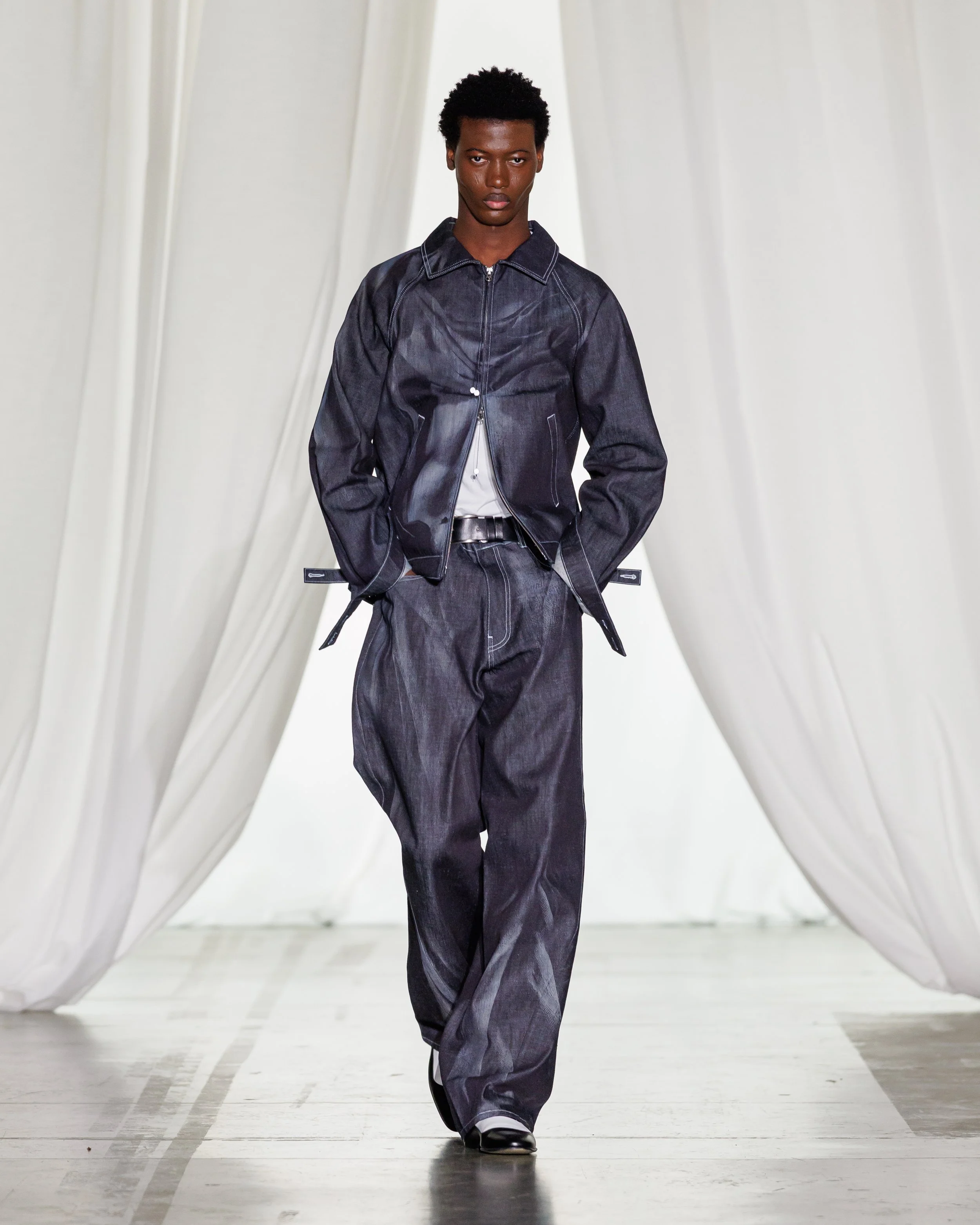 Masquerade, at its core, is about the masks worn daily. This theme materializes in compression tops printed with hazy body motifs and finished with funnel necks that, when pulled up, suggest the silhouette of another person entirely. A similar illusion appears in an overdyed raw denim twinset, lasered with a chiselled physique inspired by ancient male statuary—classical ideals refracted through contemporary fabric manipulation.