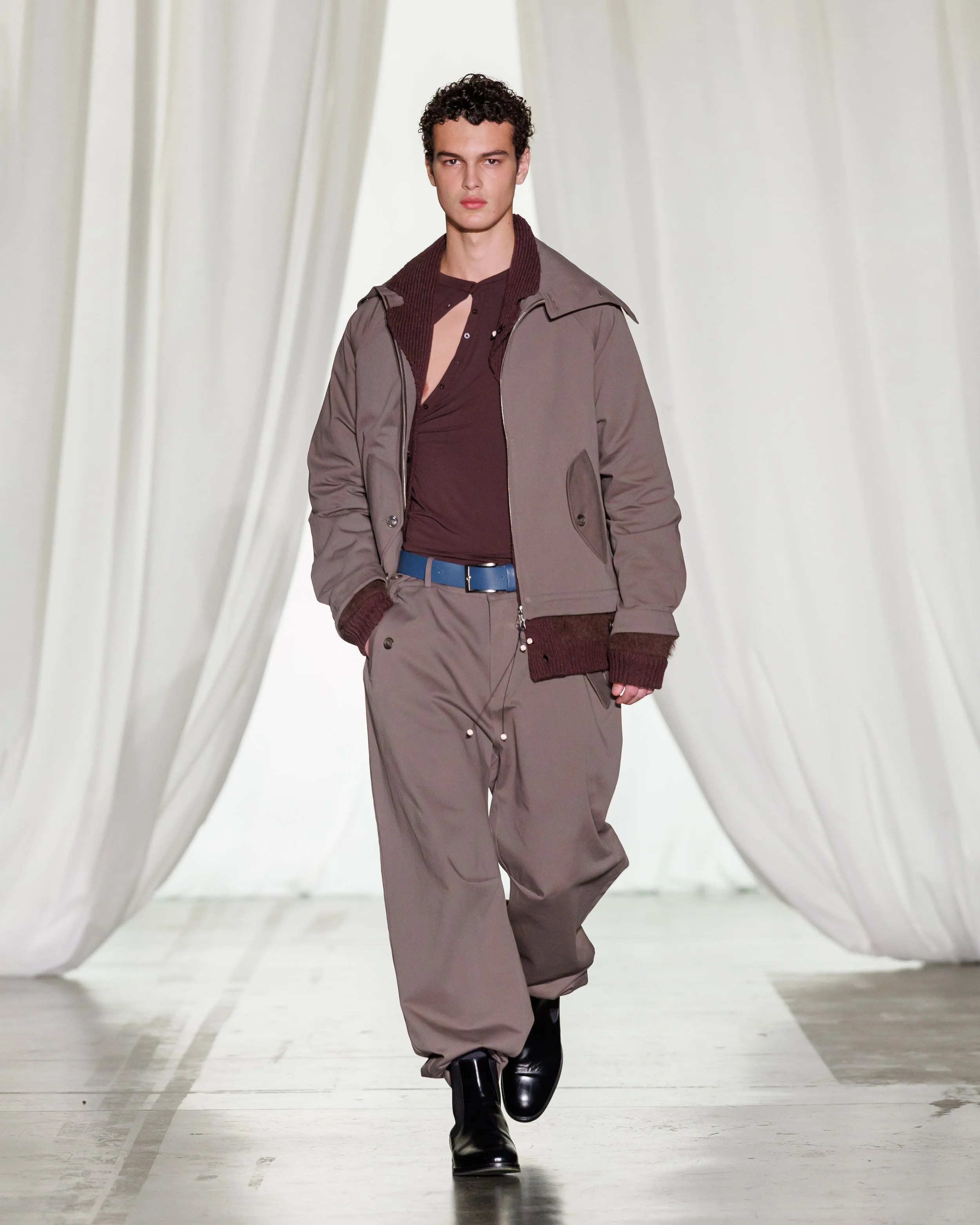 The palette—anchored in greens, navies, and earthy browns—supports a rich dialogue of texture. Silky utility trousers in Viscose LENZING™ are paired with crinkled recycled nylon zip-ups, while tactile contrasts emerge in mohair blazers and nipple-exposing cardigans knitted from alpaca and merino wool. Each material choice reinforces the collection’s sensory and emotional depth.