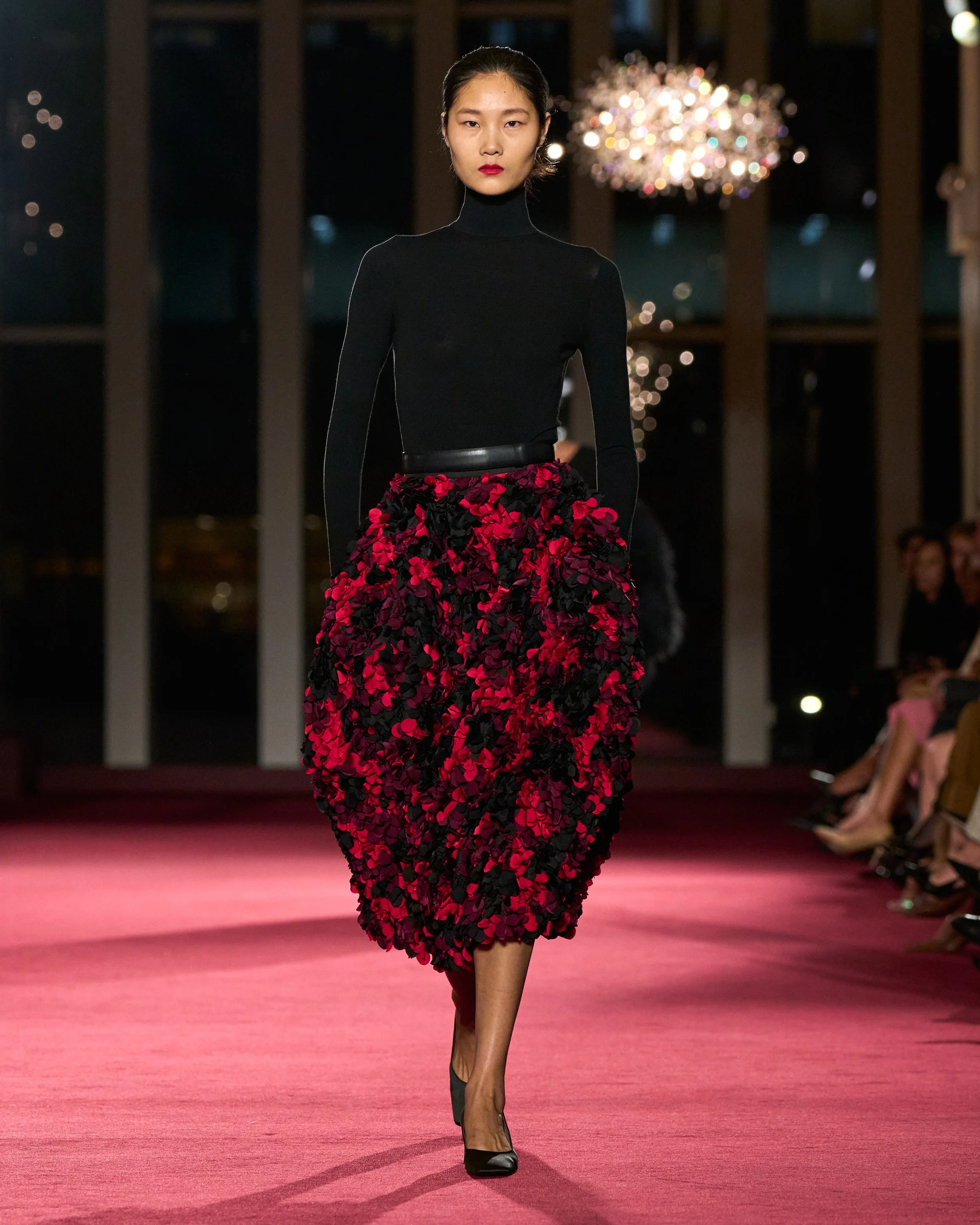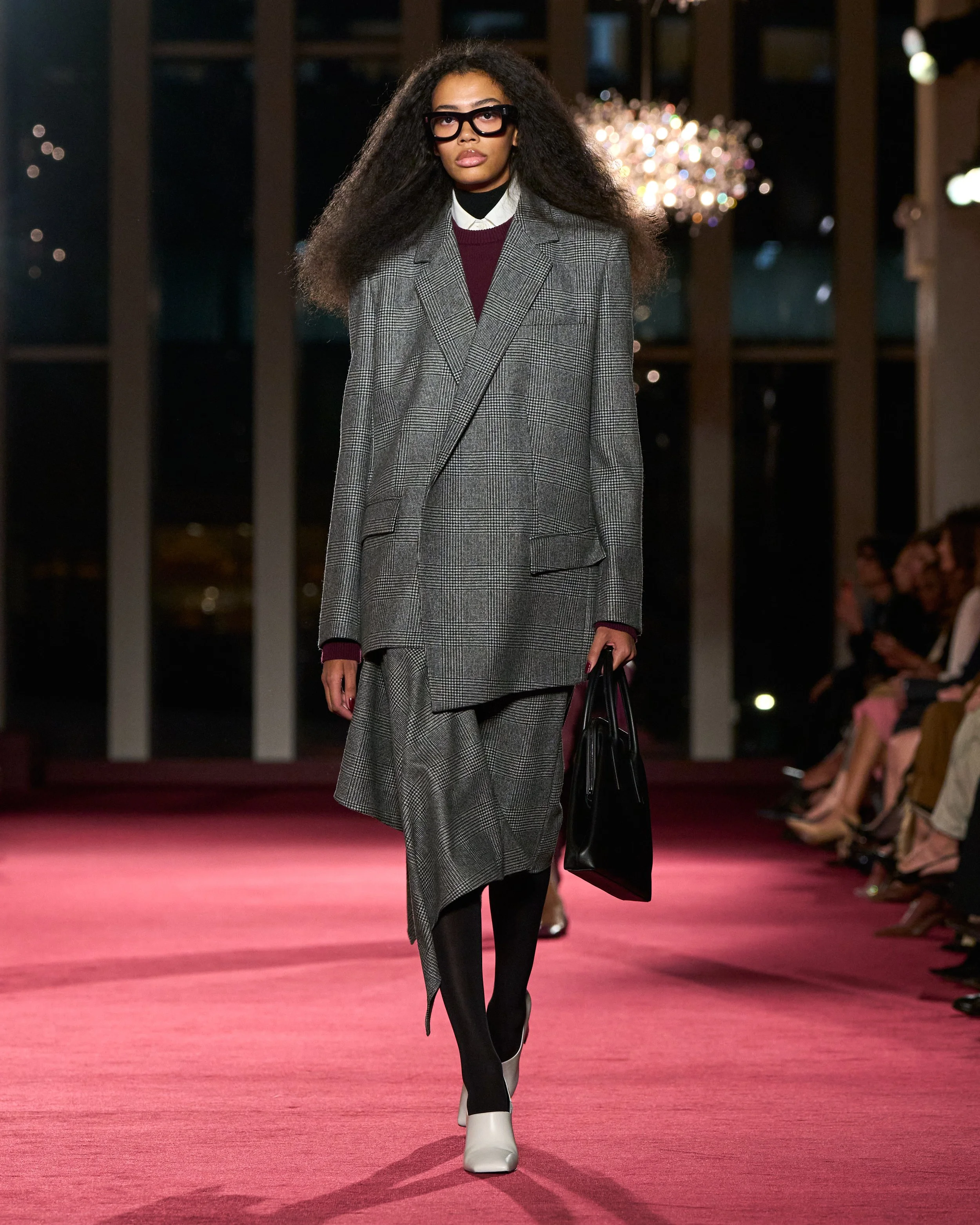 Urban neutrals dominated, anchored by the designer’s signature camel—renamed “fawn” this season—punctuated with saturated bursts of ruby, raspberry and wine. The accessories echoed the architectural backbone of Manhattan: structured, purposeful and designed for movement. Outerwear, always a Kors strong suit, delivered impact with entrance-making silhouettes that felt as cinematic as the venue itself.