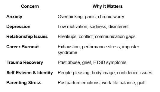 ✔ Specializations relevant to your issues (e.g., anxiety, trauma, LGBTQIA+, couples therapy)