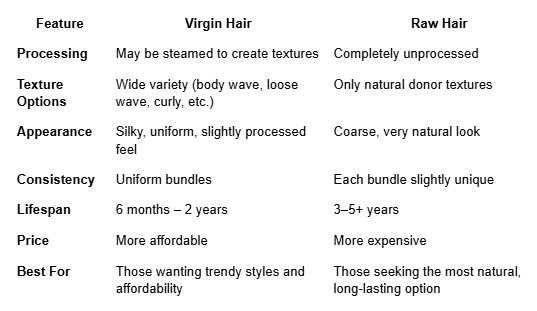 Both raw hair and virgin hair are excellent choices, but they serve different needs. Virgin hair is ideal for everyday wearers who want style variety at a reasonable price. Raw hair, on the other hand, is for those seeking the most authentic, long-lasting, and luxurious option.