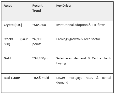 The market in early 2026 presents a distinct landscape. Bitcoin is trading around $65,800, while the S&P 500 has seen steady growth after rising nearly 18% in 2025. Gold has seen significant appreciation, reaching approximately $4,850 per ounce, and real estate offers average rental yields of roughly 6.5%.