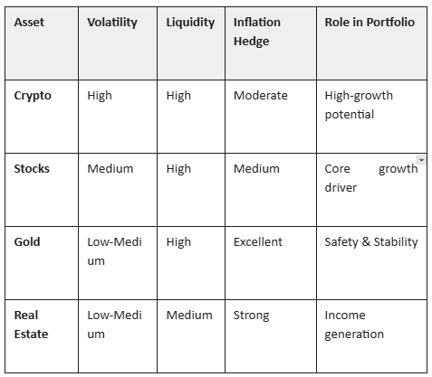 Combining the growth potential of stocks and crypto with the stability of gold and the income from real estate creates a robust strategy for 2026. There is no single "safest" asset; the safety comes from how well they are mixed to match your personal retirement timeline.