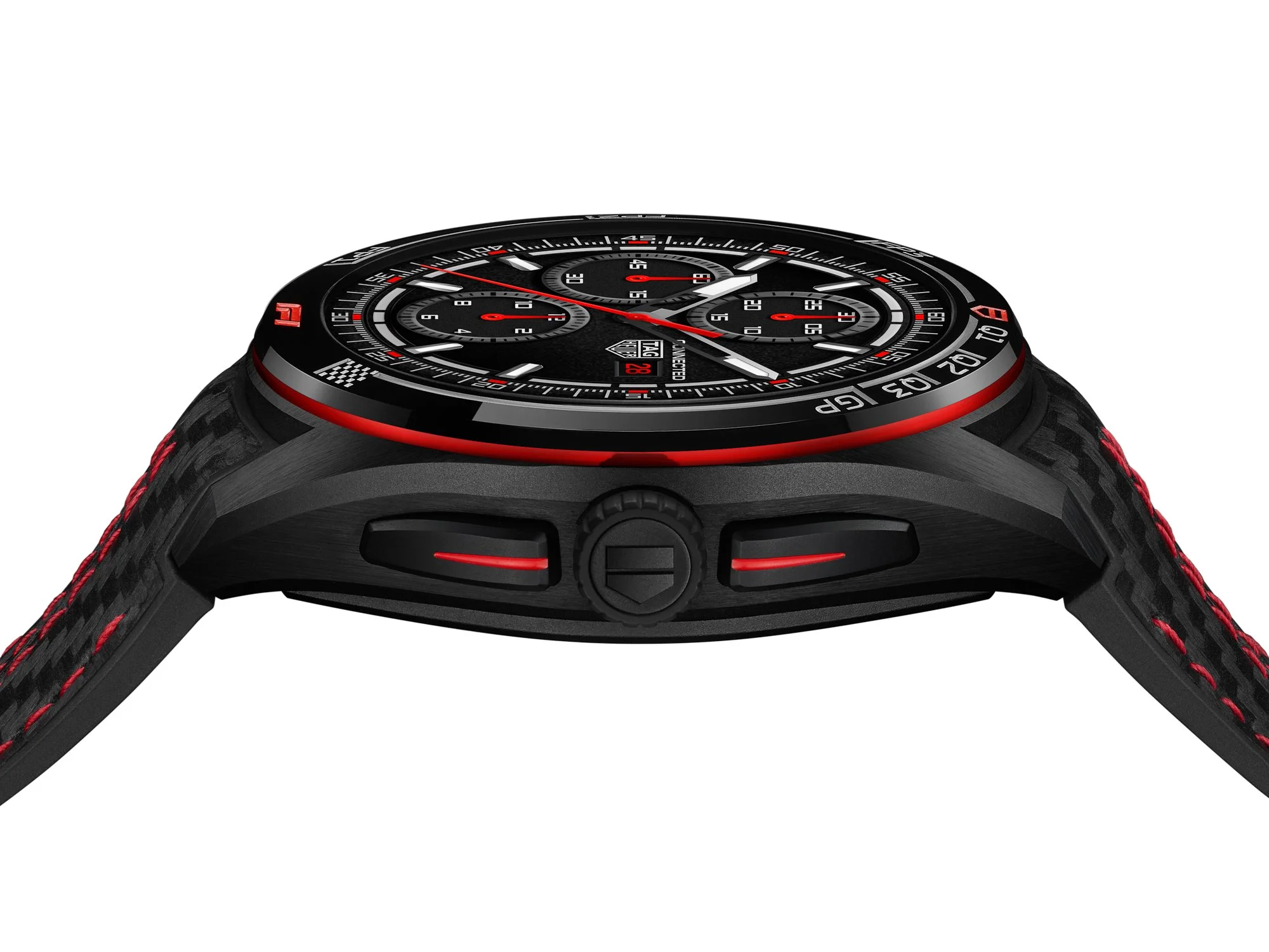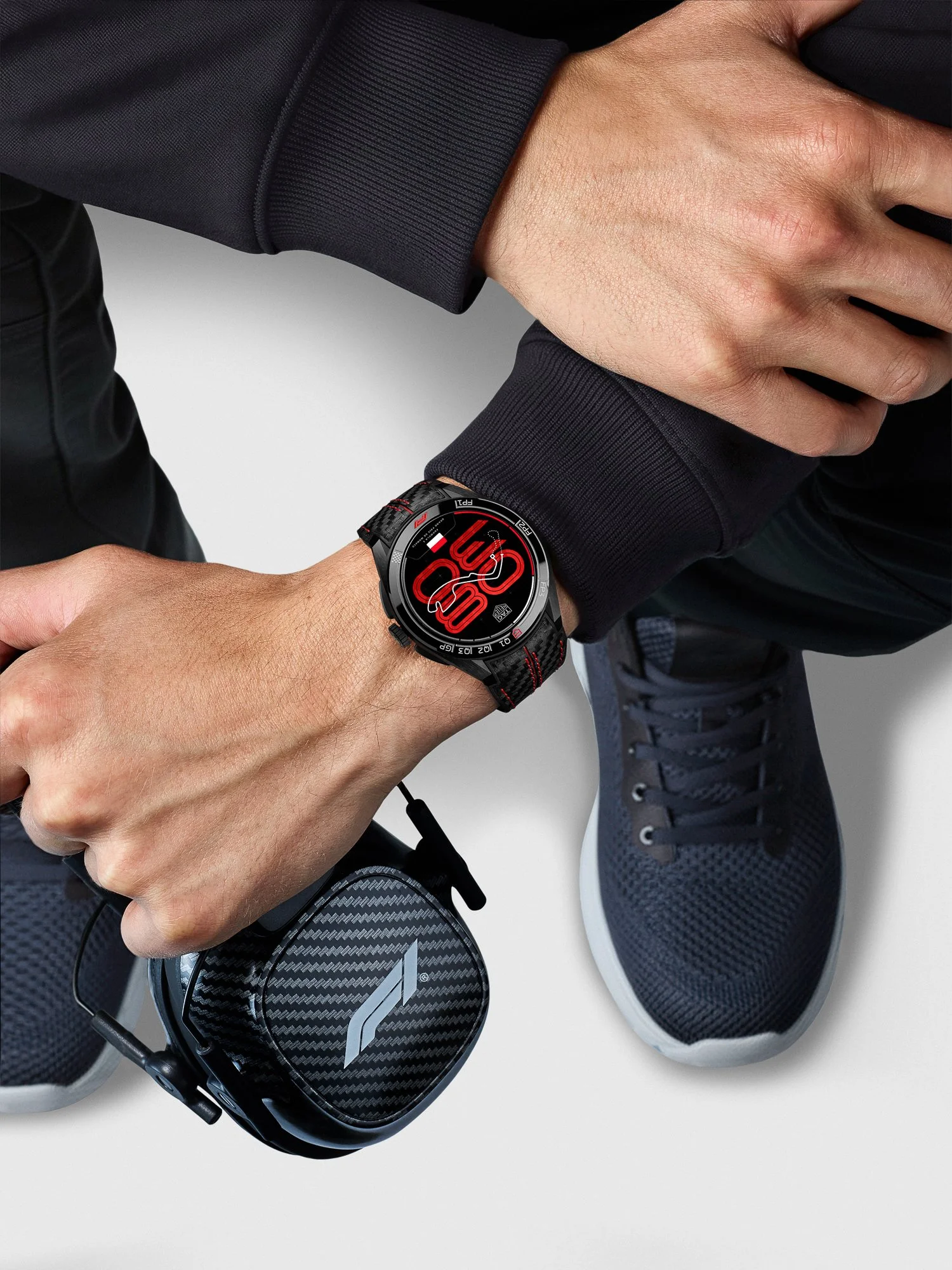 Two interchangeable straps extend versatility: a bi-material leather-and-rubber option with carbon pattern and red stitching for elevated daily wear, and a flexible textile sport strap for training or sleep tracking. Even the packaging—matte black with gloss checkered detailing—leans into the ritual of arrival, mirroring the drama of race weekend itself.