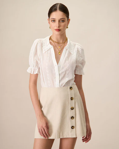 A white collared blouse ($25–45). This is your workhorse. Cotton or cotton-linen blend, not polyester. Look for one with a clean collar that sits flat and buttons that don't pull. Tuck it into everything — trousers, midi skirts, high-waisted jeans. A good white blouse makes a $30 outfit look like a $300 one.