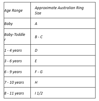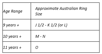The table below provides a general guide to children's ring sizes in Australia based on age. Please use this as a starting point and always confirm the size if possible.