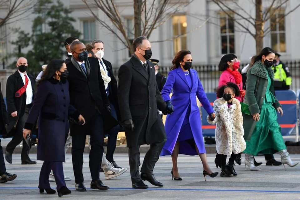 U.S. Vice President Kamala Harris, husband Doug Emhoff, her great-niece Amara, and family members walk the abbreviated parade route after U.S. President Joe Biden's inauguration on January 20, 2021, in Washington, DC. (Photo by Mark Makela/Getty Images)