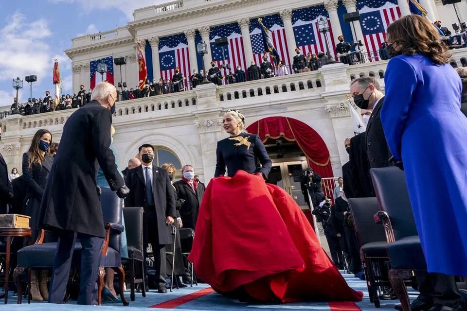 Lady Gaga arrives to sing the national anthem as President-elect Joe Biden and Vice President-elect Kamala Harris look on the West Front of the U.S. Capitol on January 20, 2021, in Washington, DC. (Photo by Andrew Harnik-Pool/Getty Images)
