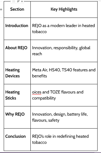 The heated tobacco arena is rapidly moving, and REJO Heated Tobacco is on the frontline with its design, flavour, and technology. REJO is a genuine competitor against the most developed players since it provides a wide variety of devices and heating sticks, depending on preferences.