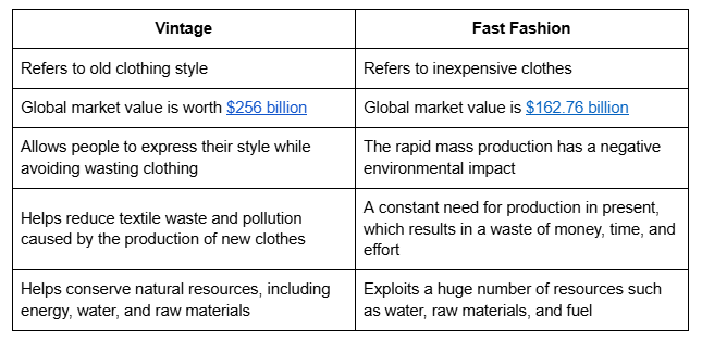 Vintage clothing is popular for its durability and superior quality compared to fast fashion. In contrast, fast fashion has many negative attributes that make it a less attractive choice. The table below showcases the differences: