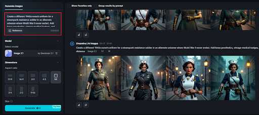 To begin, go to Dreamina's "Image Generator." This is your starting point — the wormhole that bridges centuries with a sentence. Type in your text prompt in as much detail as you can. The more descriptive, the better. Think of yourself as issuing instructions to a costume designer about dressing up as a time traveler in transit. For example: "Create a different 1940s nurse's uniform for a steampunk resistance soldier in an alternate universe where World War II never ended. Add brass prosthetics, vintage medical badges, and misty London streetlights in the distance." This is the rough material that will guide your fashion paradox.