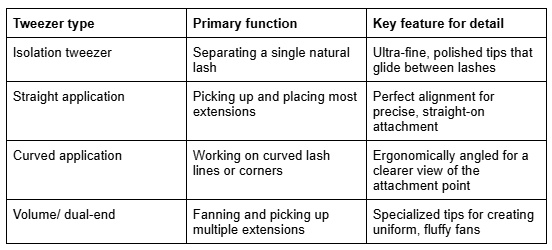 Isolation Tweezers: Fine-tipped, often curved or angled, designed to gently but firmly separate a single natural lash from its neighbors without pinching the skin.